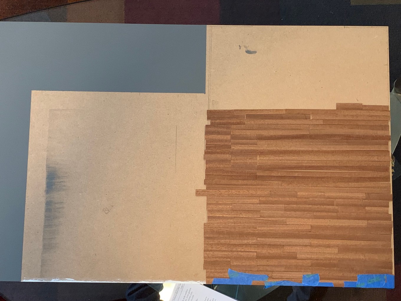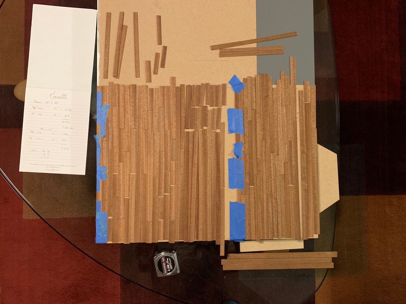 I started by cutting the wide strips into 2-, 4-, and 6-inch lengths to mimic real flooring with varying lengths of boards. Once complete, I had enough to cover about 6.5 inches of the 14” X 20” room.