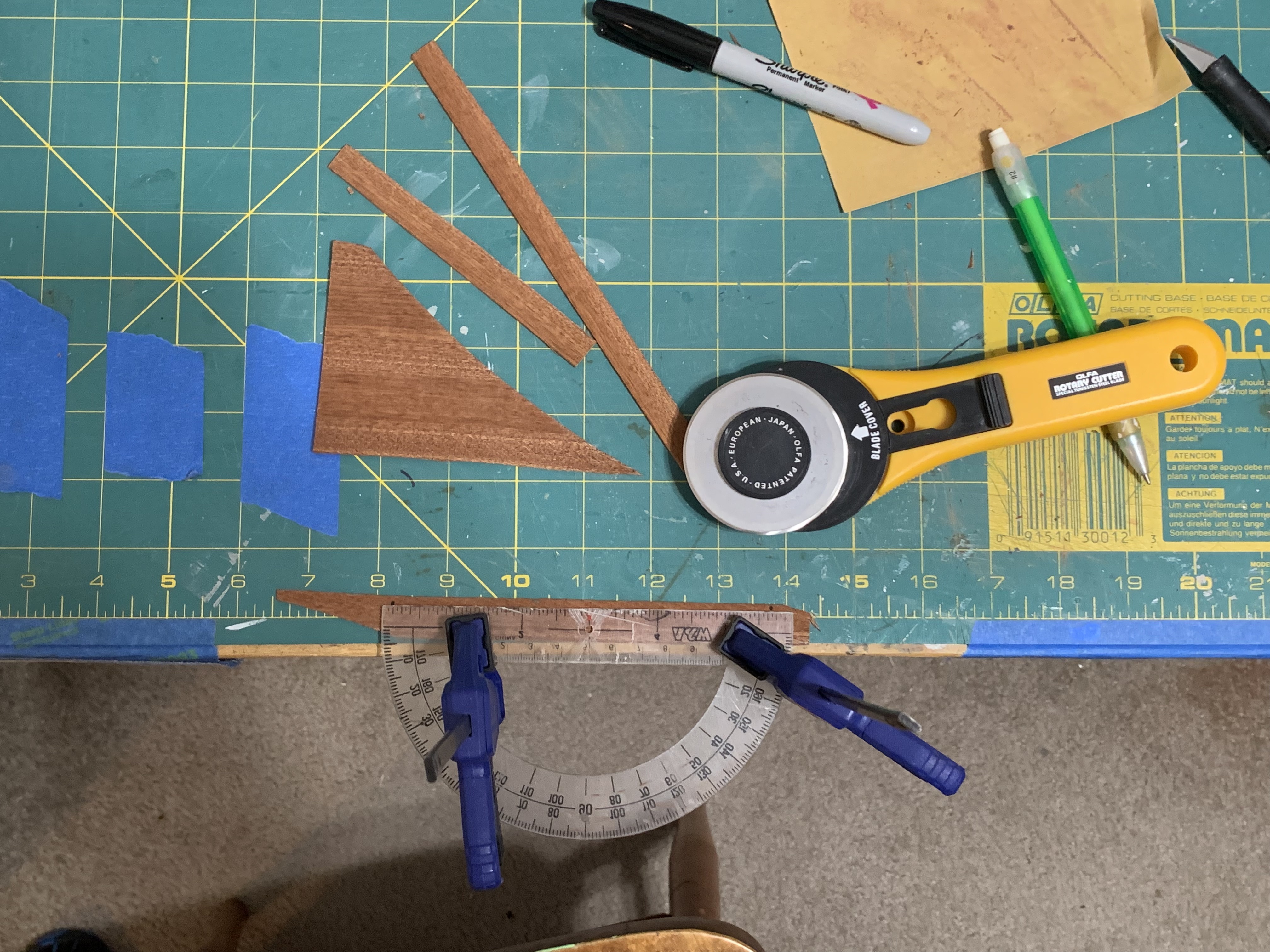 I first tried using a rotary cutter and clamping down the wood to be cut under a straight edge. But each time, either the rotary cutter suddenly followed the grain of the wood away from the straight edge ruler or the wood slipped under the straight edge. Using an X-ACTO knife instead did not prove any more successful. I explored buying a power tool such as a band saw that would give me more precise cuts (I always love buying a new power tool for a project) but could not find anything small enough for this application. When I explained my challenge to my sister, she came up with two possible solutions.