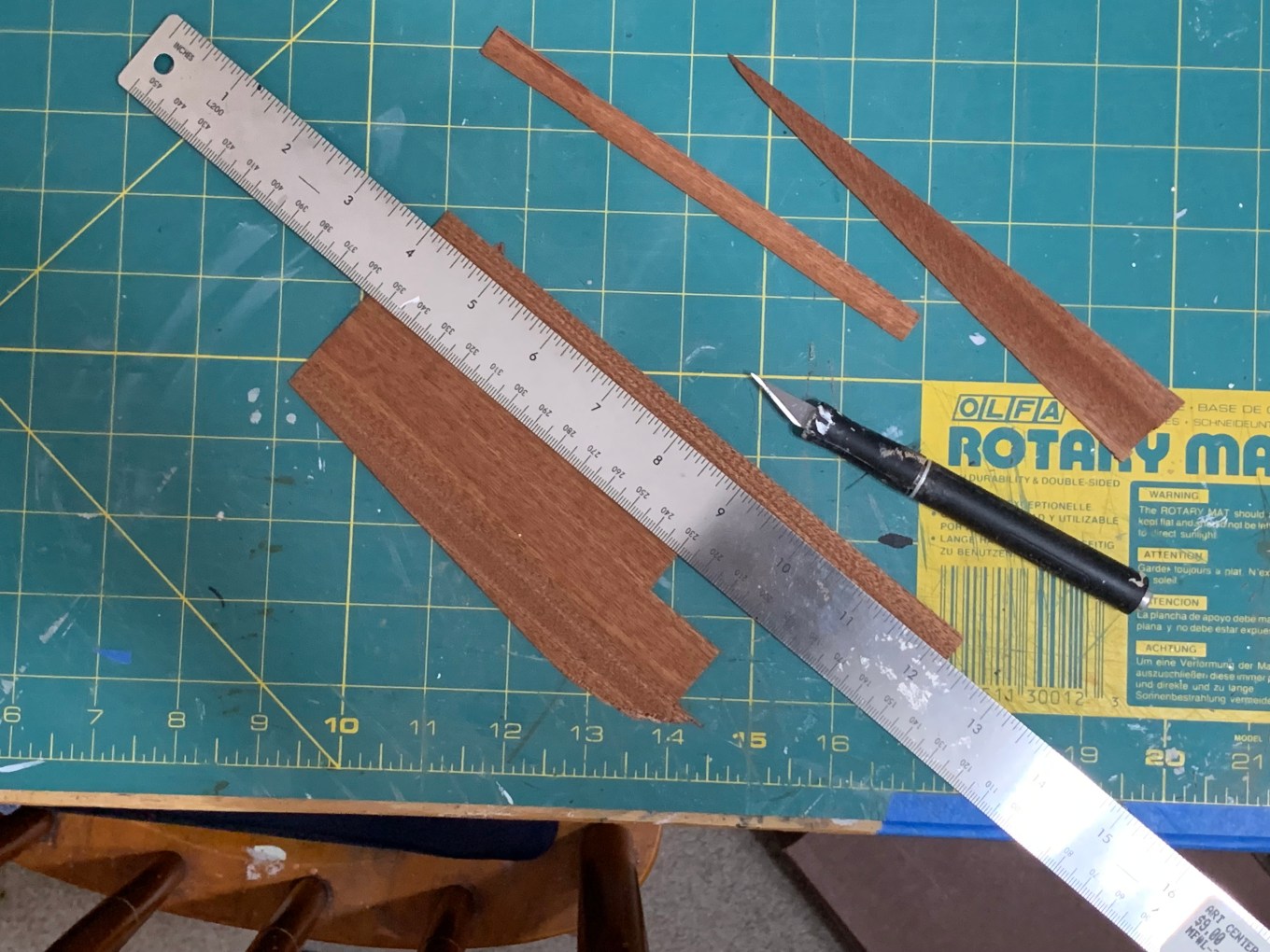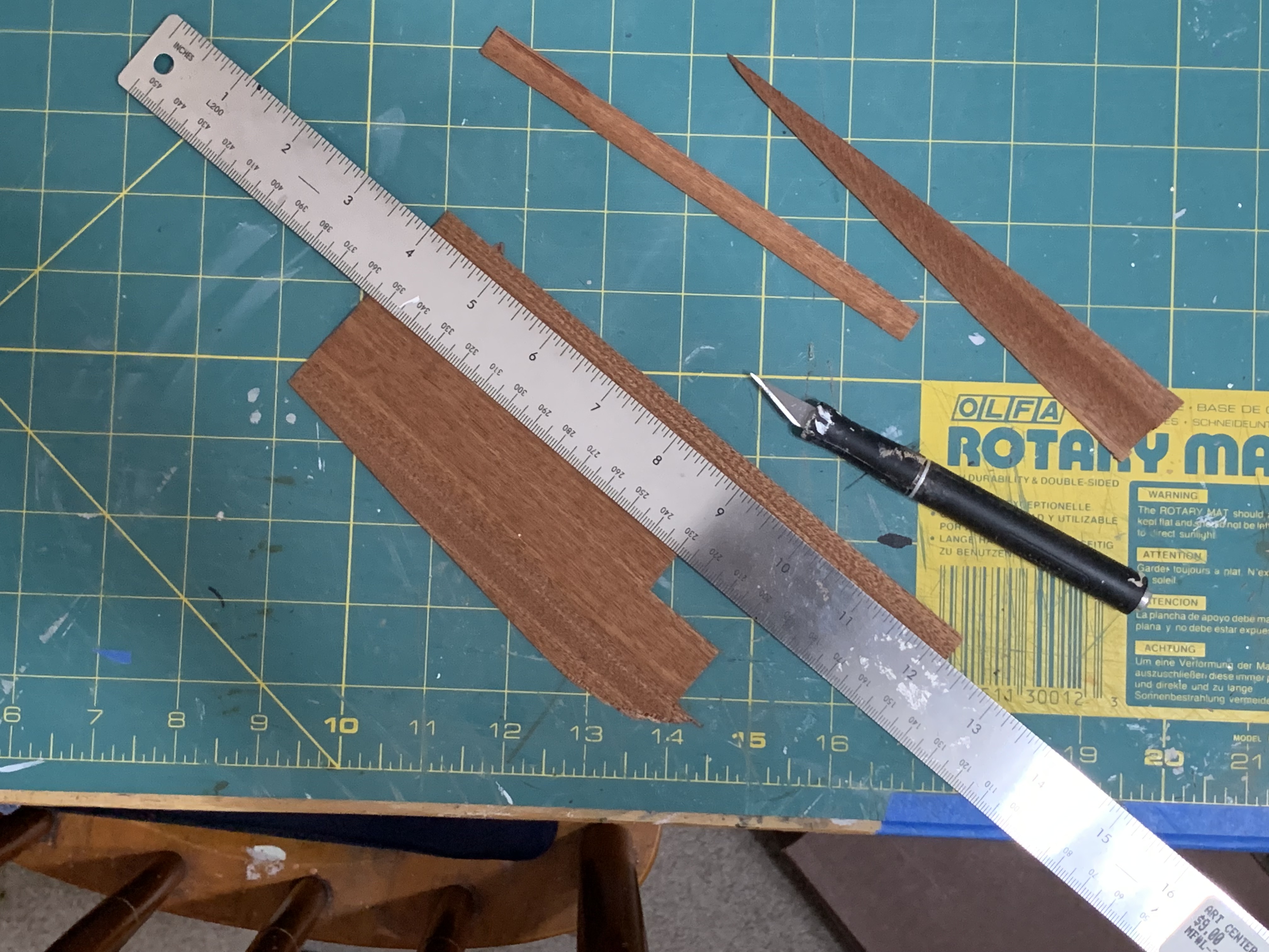 The one that worked for me was a technique she taught her students to use in similar situations—to use a metal ruler with a cork backing to hold the wood being cut, to stand over the work surface rather than sitting to apply more pressure on the ruler, and to make repeated scores along the straight edge rather than trying to cut all the way through the wood in one pass. It worked beautifully and in just a few hours, I had all the strips I needed.