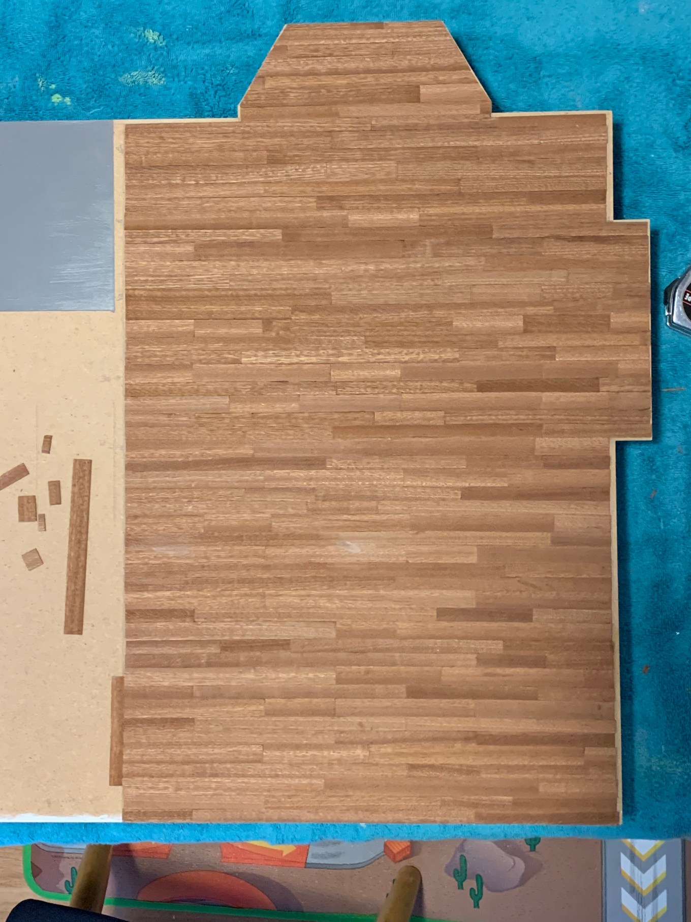 It took a total of 46 rows to reach the front wall and then I just had to finish the bay floor. Turns out I had exactly enough strips without having to cut anymore. Those small scraps to the left in the picture below are what I had left.