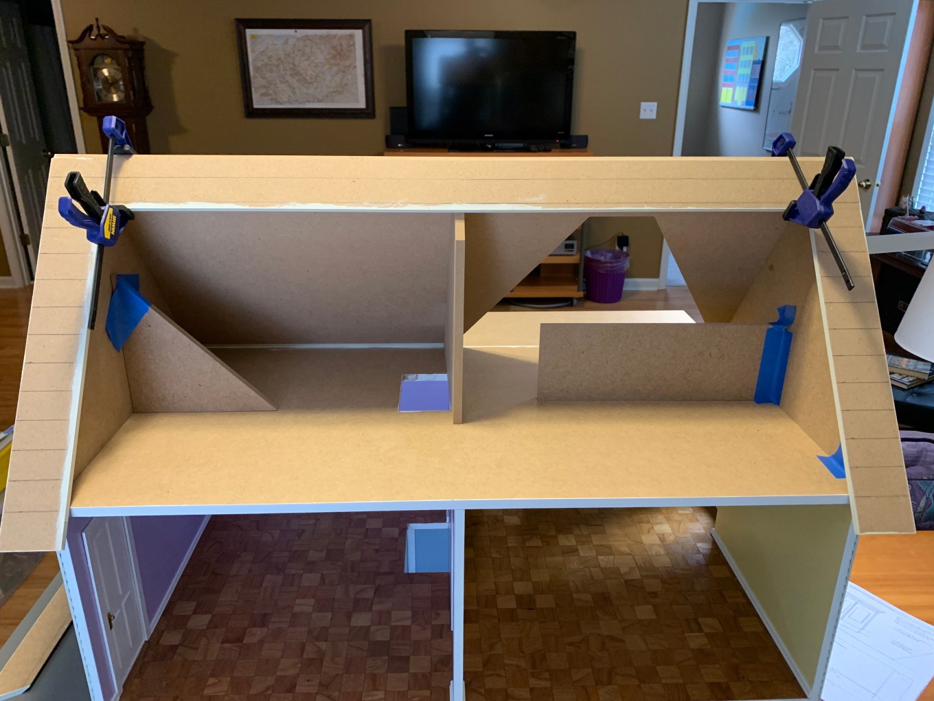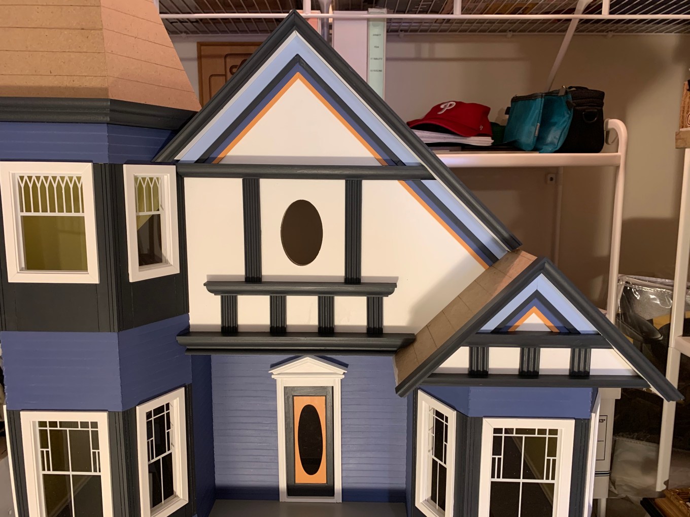 In fact, the last doll house I built had similar three-layered trim that I recalled was quite challenging to cut to the proper angle and length with the house assembled.