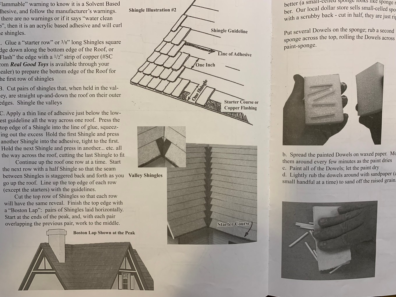 Because the gable roof had valleys that required triangular shaped shingles as a starter course, that shingling would first require the roof to be assembled, a step my nephew would need to complete once he has glued the roof pieces on.