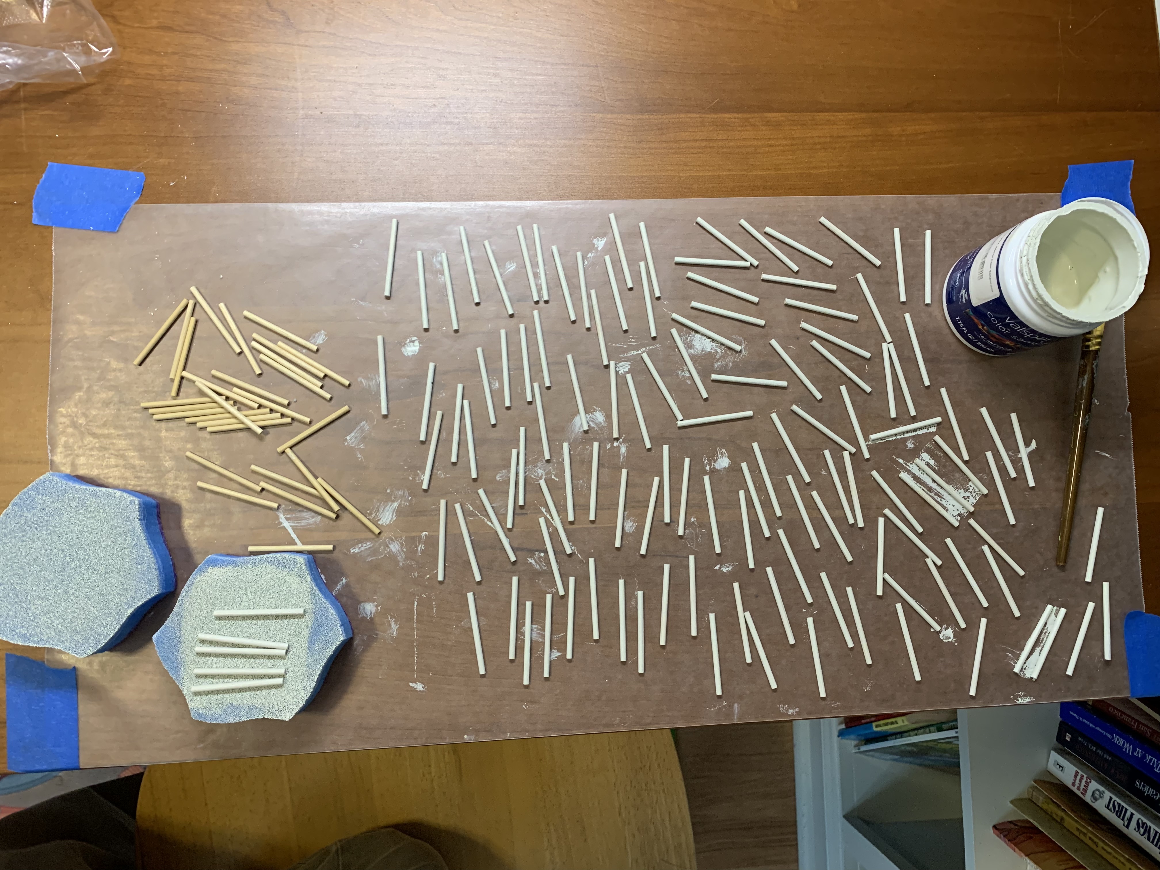 Thankfully with so many to paint, the instructions included a unique technique (on right in photo above) whereby paint was spread on a small sponge and the dowels were squeezed between a second sponge and rolled to uniformly paint them. It worked out very well.