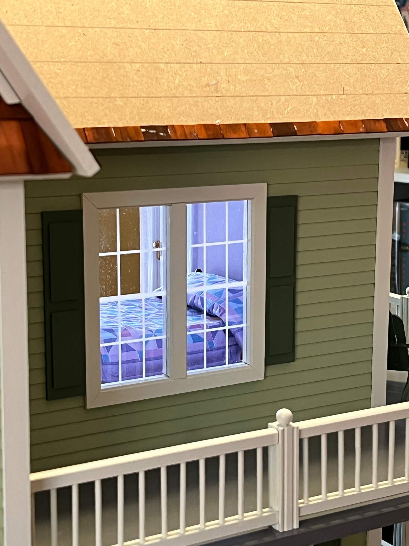 We could either finish the house with the top floor interior looking just like the photo above or we could take the house out on its westward trip unfinished. I knew from past doll house building experience that it was much easier to paint or paper interior walls before the house was assembled since getting adult sized hands into 1/12-scale tiny spaces can be near impossible. We discussed the pros and cons of the two option and in the end decided to keep the house unfinished and not attach the top floor or roof. But then the question became how much of the exterior could I finish before assembly leaving my nephew’s job primarily interior work?