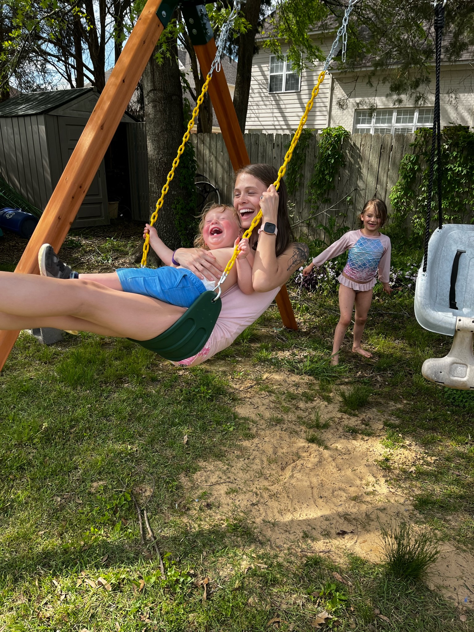 Although not a finished club house yet, it at least was a completed swing set and over the weekend while we were out of town, we got some great photos of the whole family enjoying it.