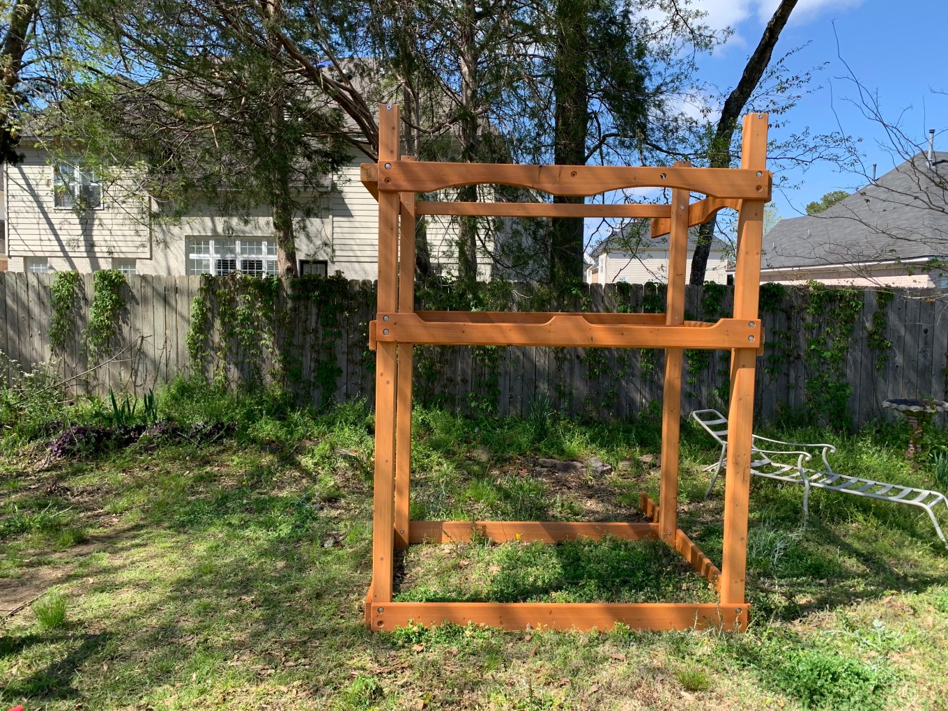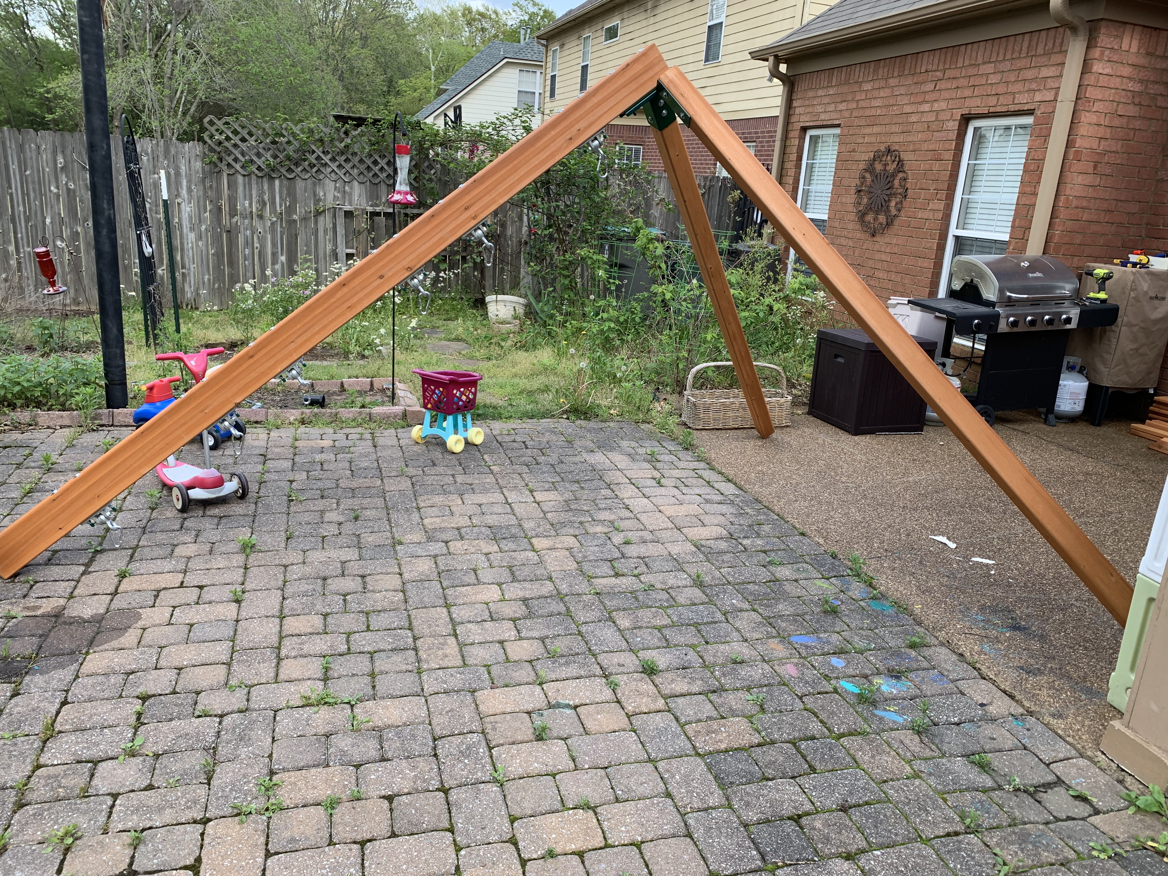 Friday afternoon, I was leaving to go out of town, so I didn’t have much time to work on it that day. But with my son’s help (definitely a 2-person job), I was able to get the swing bean installed along with the swings.