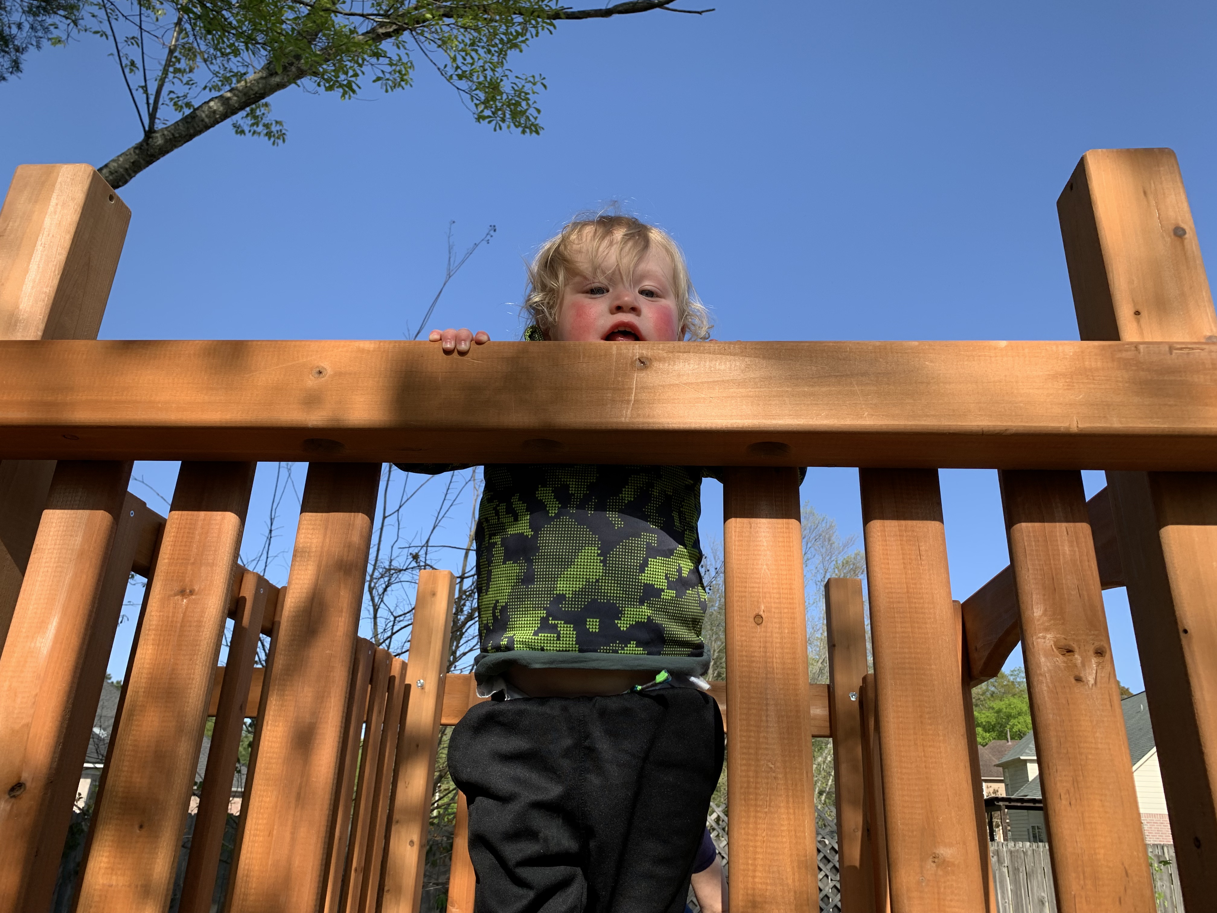 This still posed potential fall hazards with gaping holes where future parts would be installed. And as soon as little brother arrived home, he demonstrated this possibility by immediately climbing up the ladder. Although not speaking in sentences yet, to me his look said: “Hurry up granddaddy and get finished. I want my swing back.”