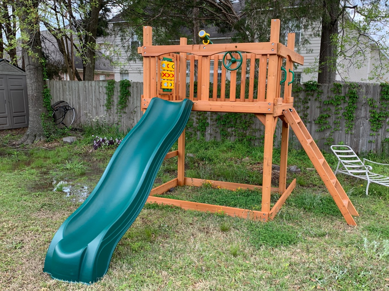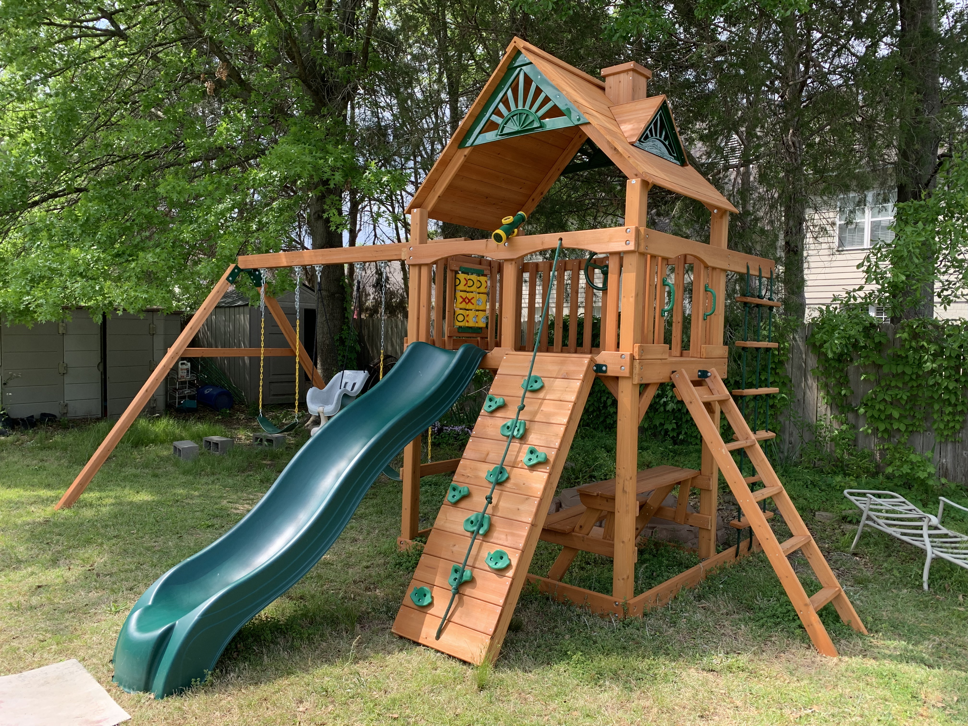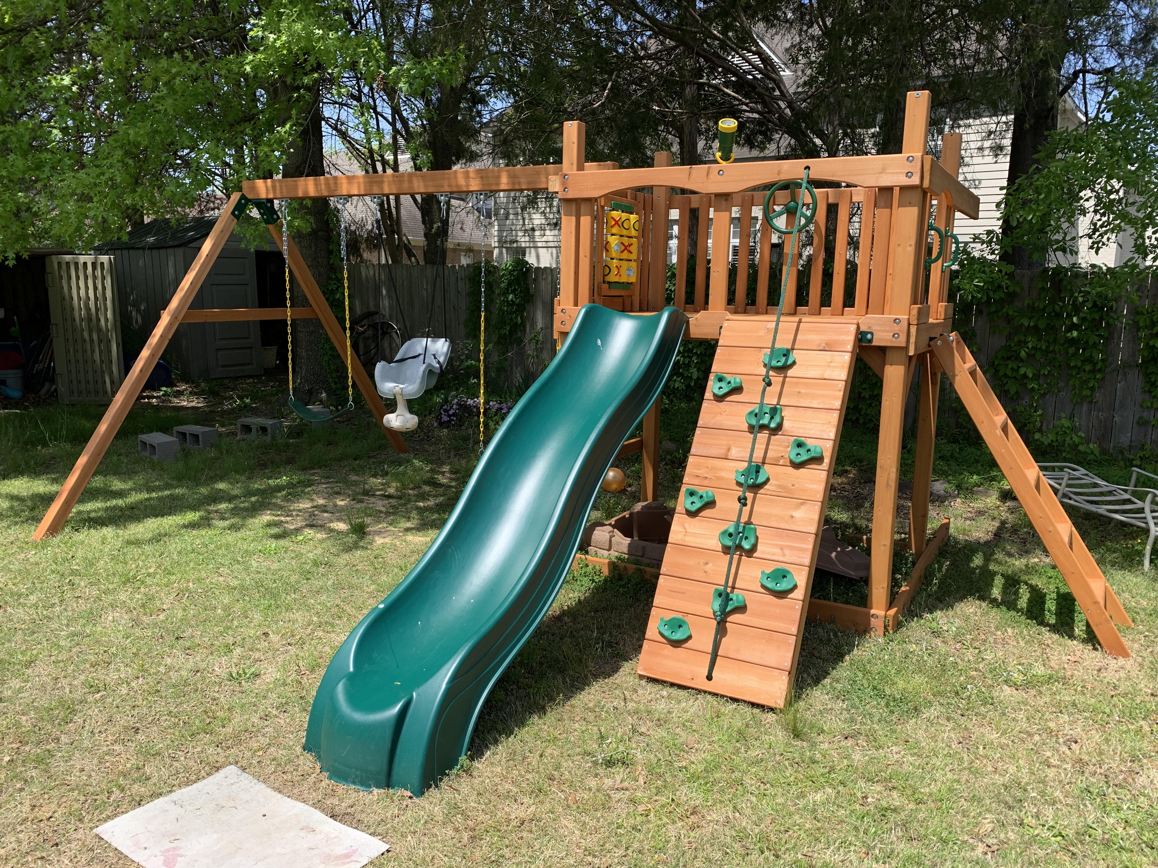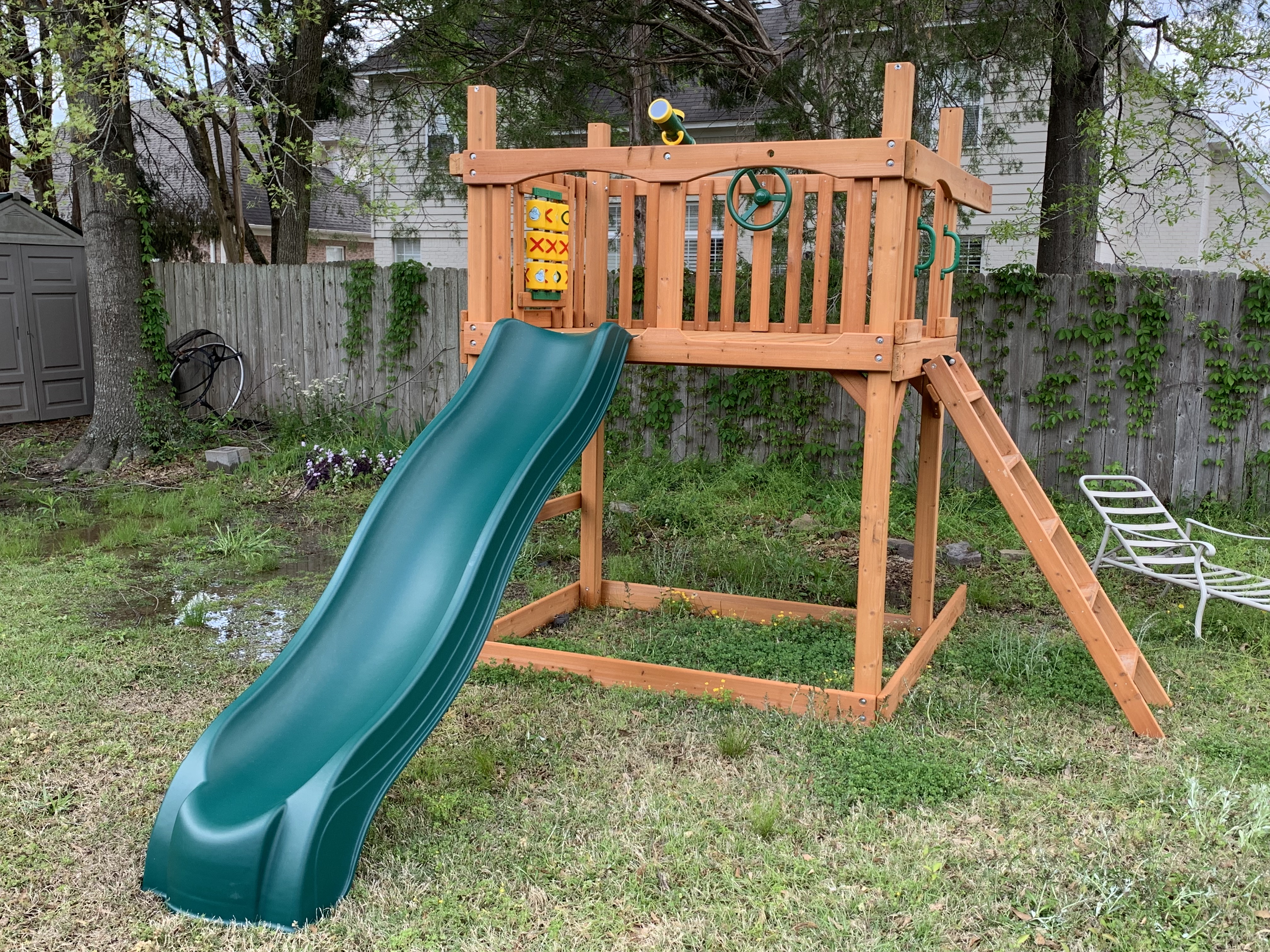 The next day I got rained out and on so on the fourth day, I really wanted to focus on trying to get the play set to a more safe and useable state. This involved installing the slide, the tic-tac-toe board, the telescope and of course, the steering wheel for my grandson who loves carrrrrs!