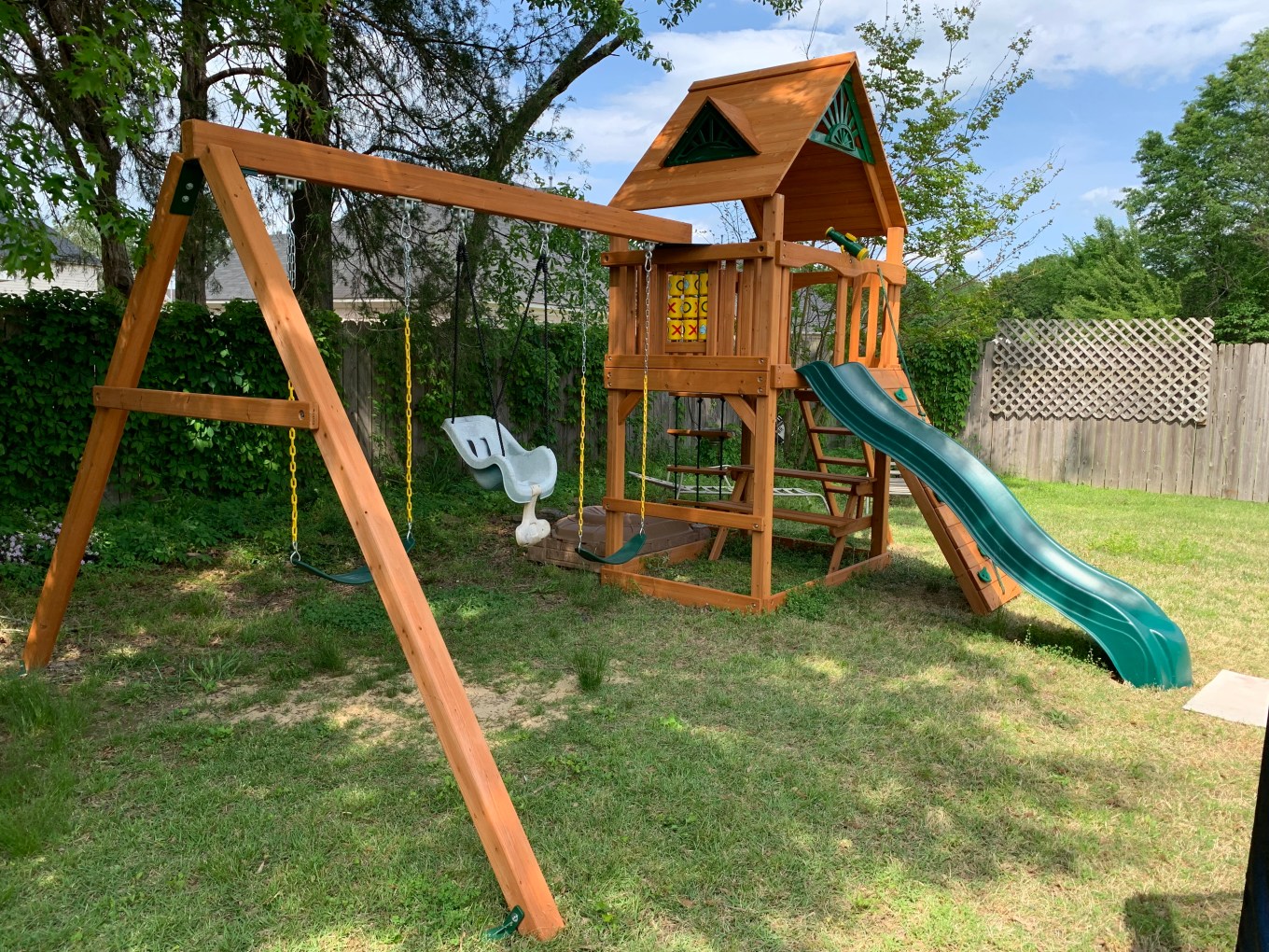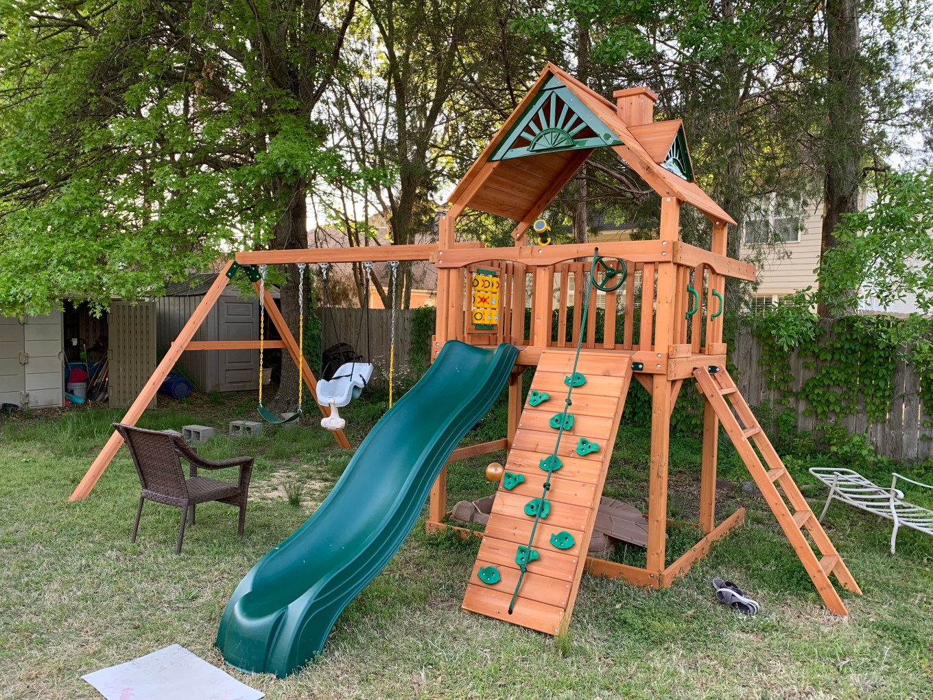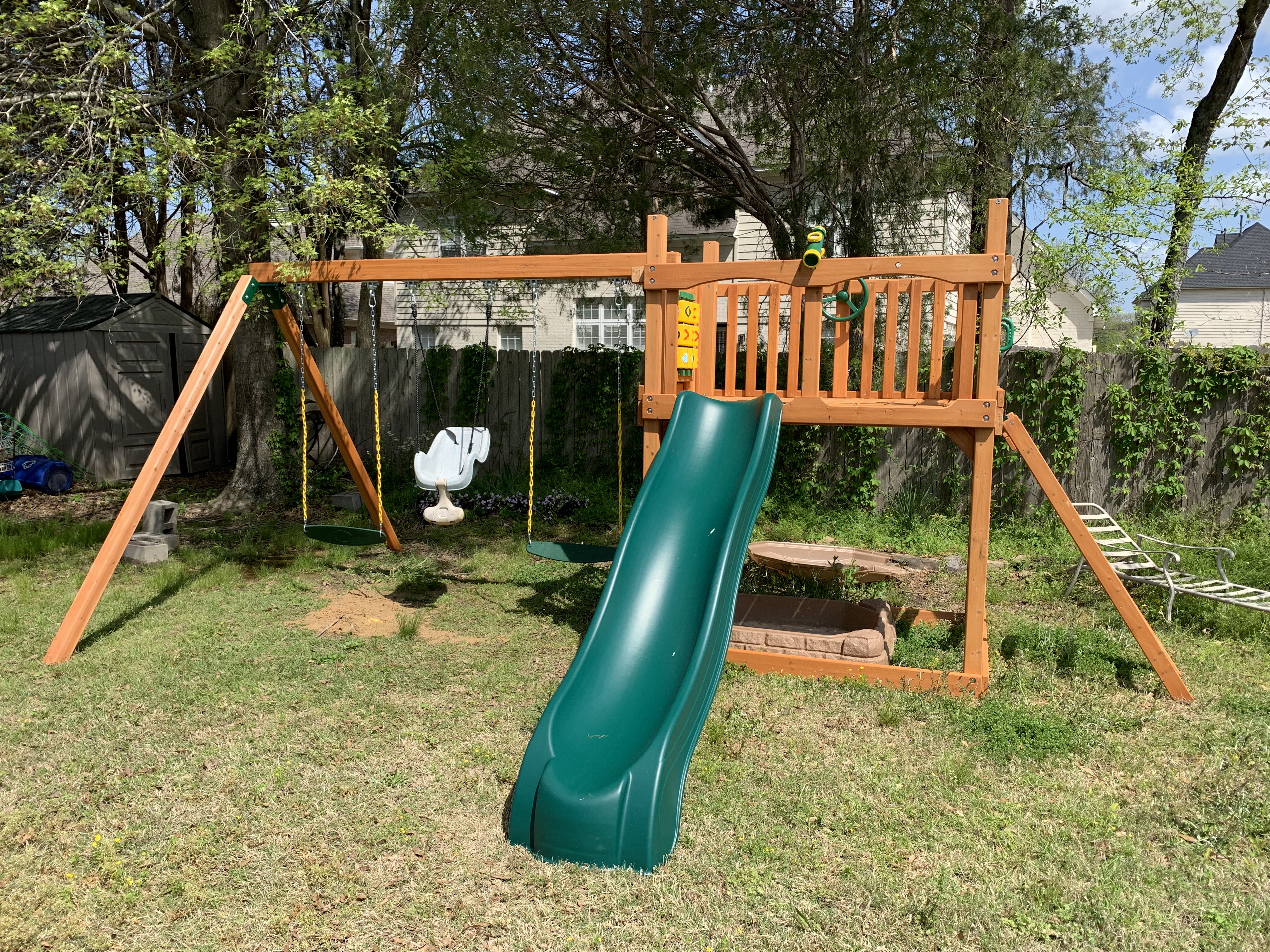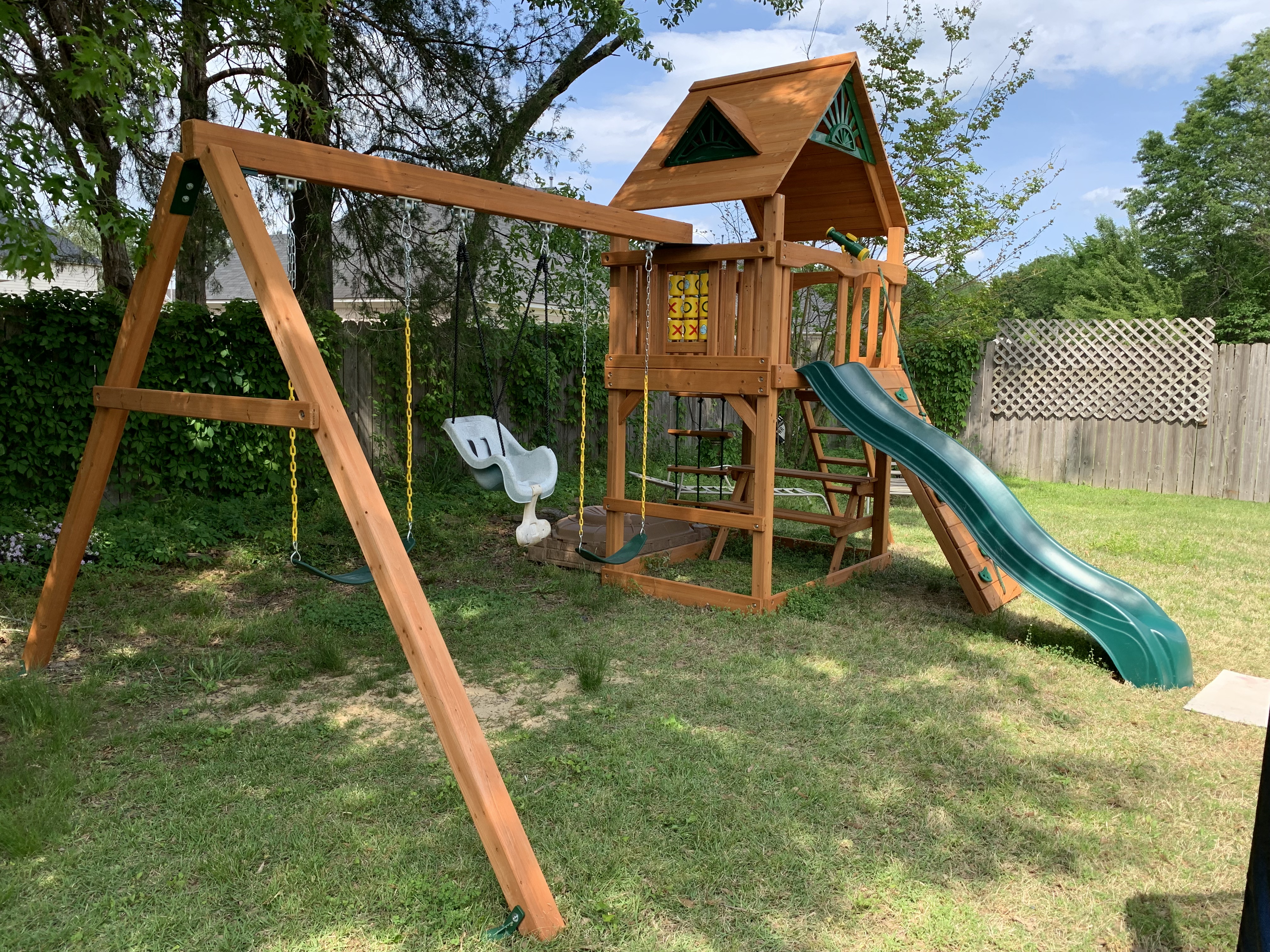 The next day I got rained out and on so on the fourth day, I really wanted to focus on trying to get the play set to a more safe and useable state. This involved installing the slide, the tic-tac-toe board, the telescope and of course, the steering wheel for my grandson who loves carrrrrs!
