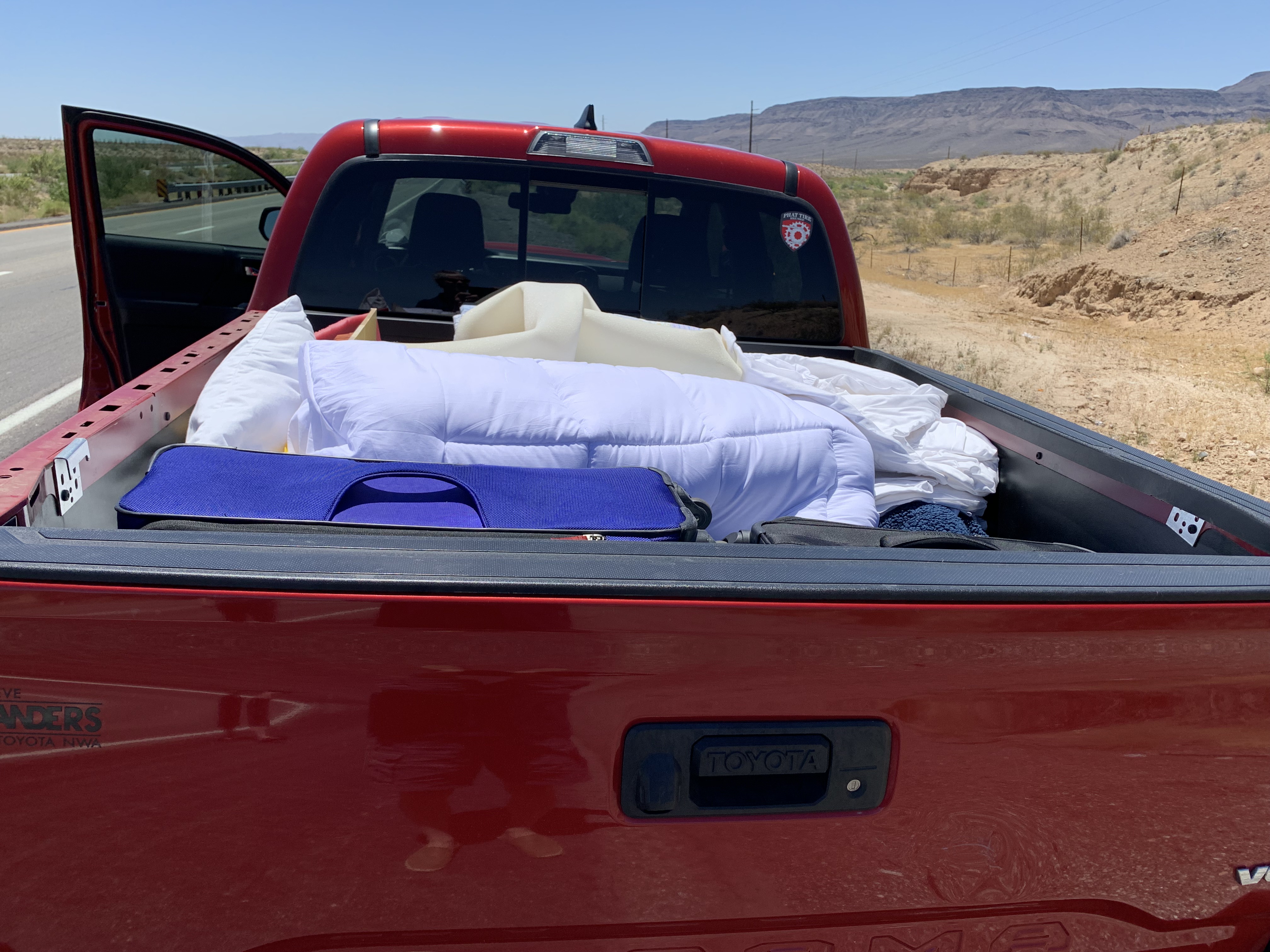 The whoosh that I had heard while driving was the tonneau cover taking flight off the truck bed. I had noticed the headwinds and crosswinds had increased significantly as we entered the essentially flat terrain and that extra wind speed coupled with our near 80 mile an hour speed was all it took to turn the cover into a hang glider.