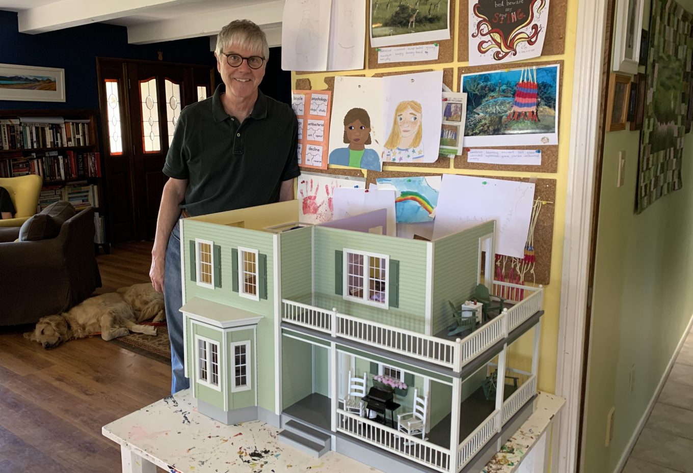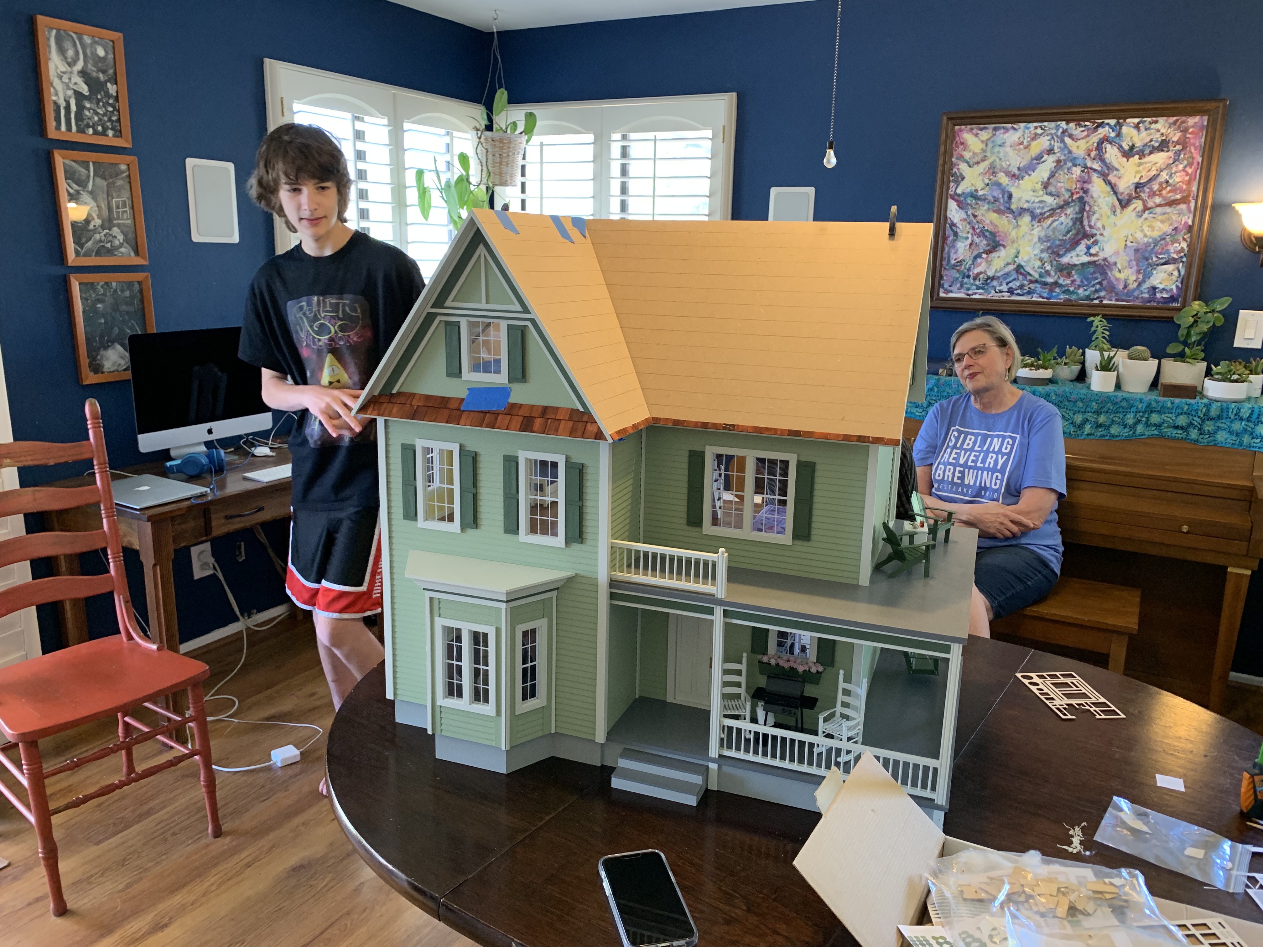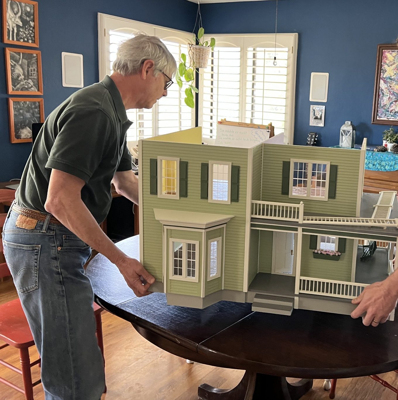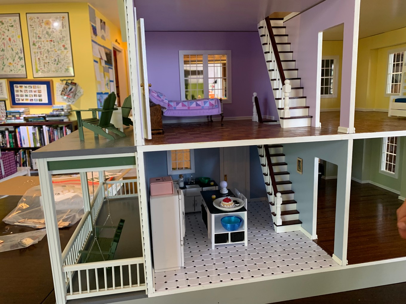 When we uncovered the doll house and removed it from the truck, we were glad to see that beyond the porch railings that had broken loose, only a few minor scrapes had been incurred during its over 1,500-mile journey. My sister’s son helped me to carefully bring the doll house in and place it front and center on the dining room table.