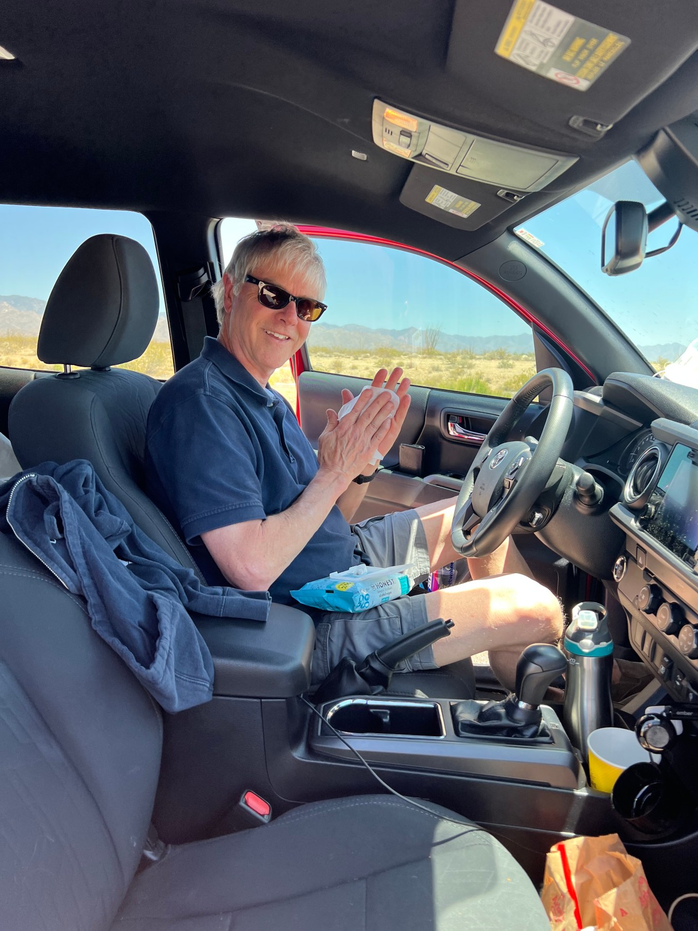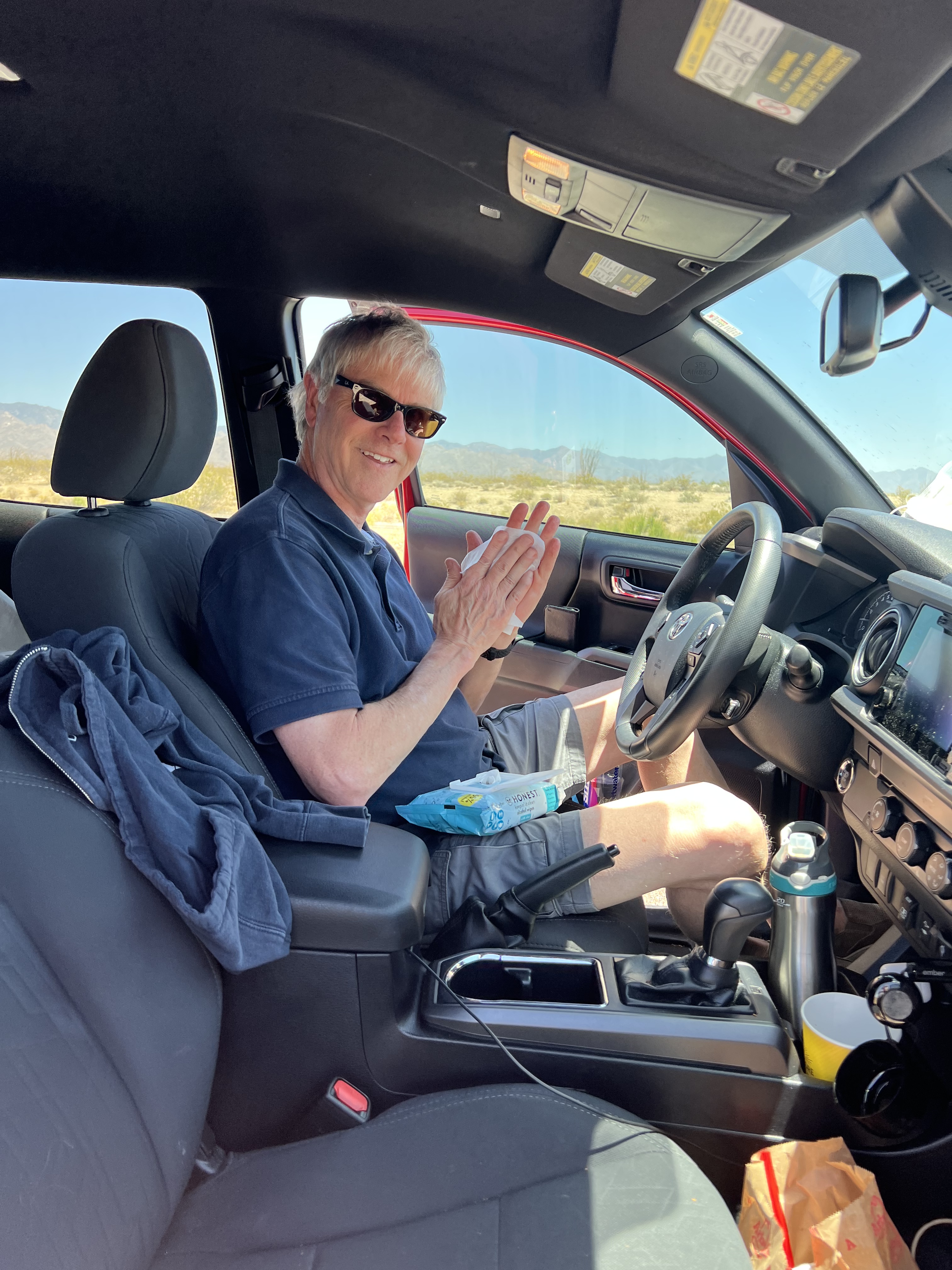 Once all reattached with the added bungy cord security, we were ready to resume our journey after I cleaned off my hands. As we started off, we both found ourselves frequently glancing back to make sure the cover wasn’t taking flight again. But the bungy cords did the trick and we arrived at our final destination before 6:00 PM local time.