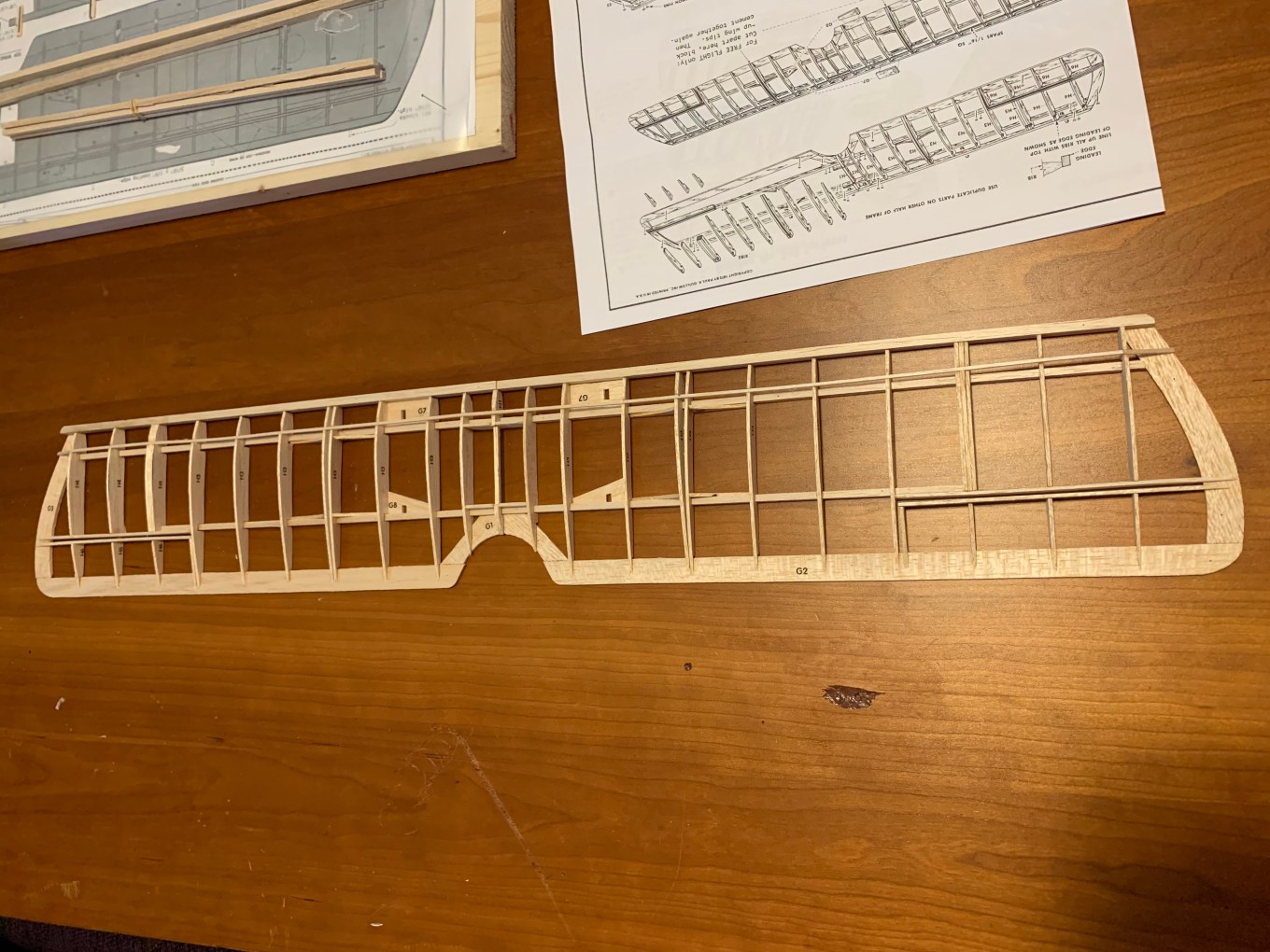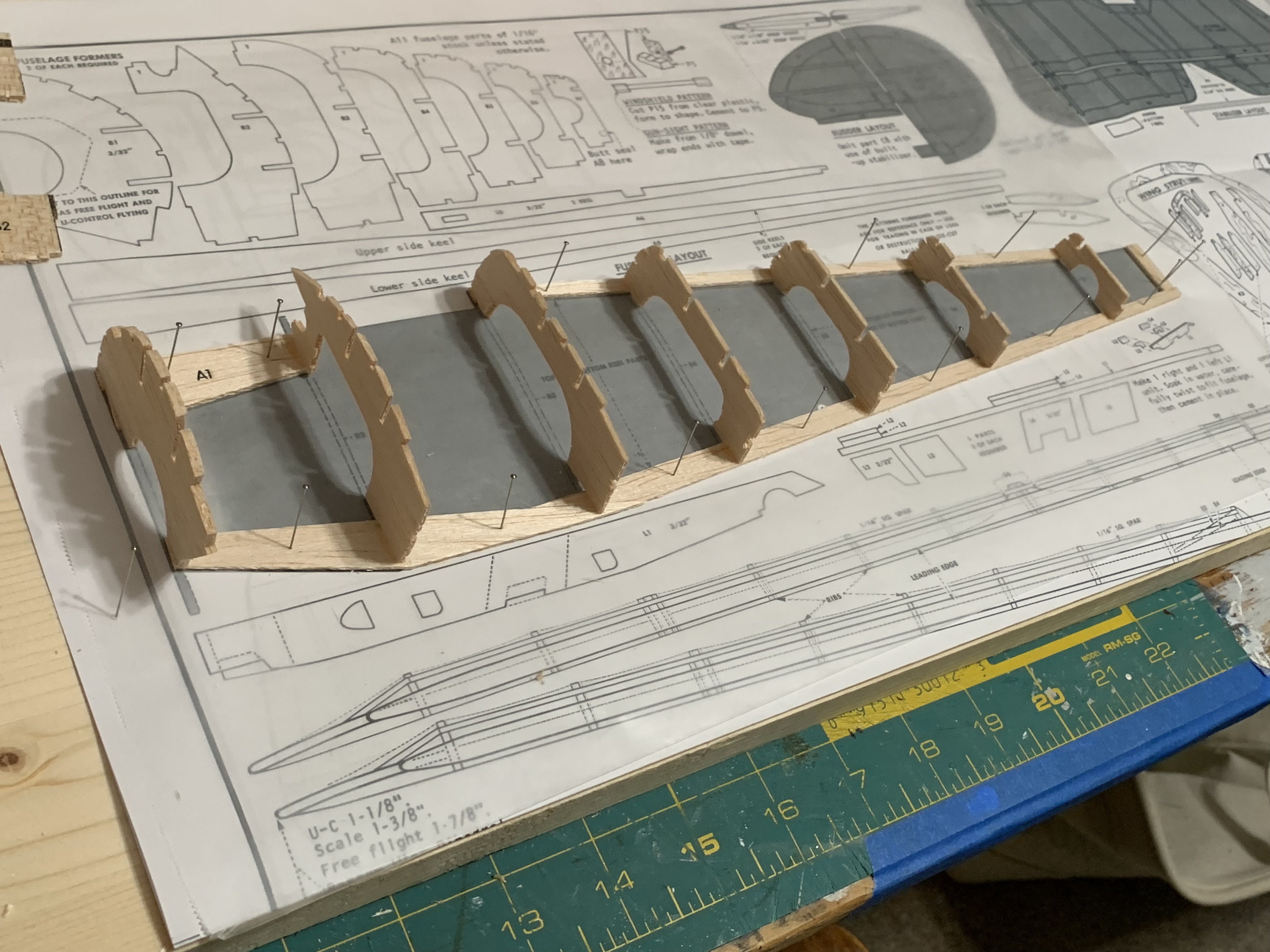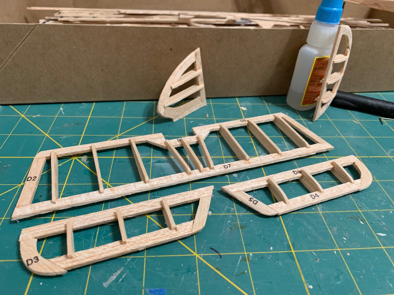 For anyone unfamiliar with this type of model, it all starts with building the frames.  This basic process is to first carefully cut out the die-cut frame pieces from the different balsa wood sheets, pin them down to the diagrams in the instructions, and then glue them together.  Once dry, strips of various sizes of balsa wood are then cut to length and glued to the frame pieces.  And the build board I had used previously for building my Chris Craft boat just fit for this model as well.