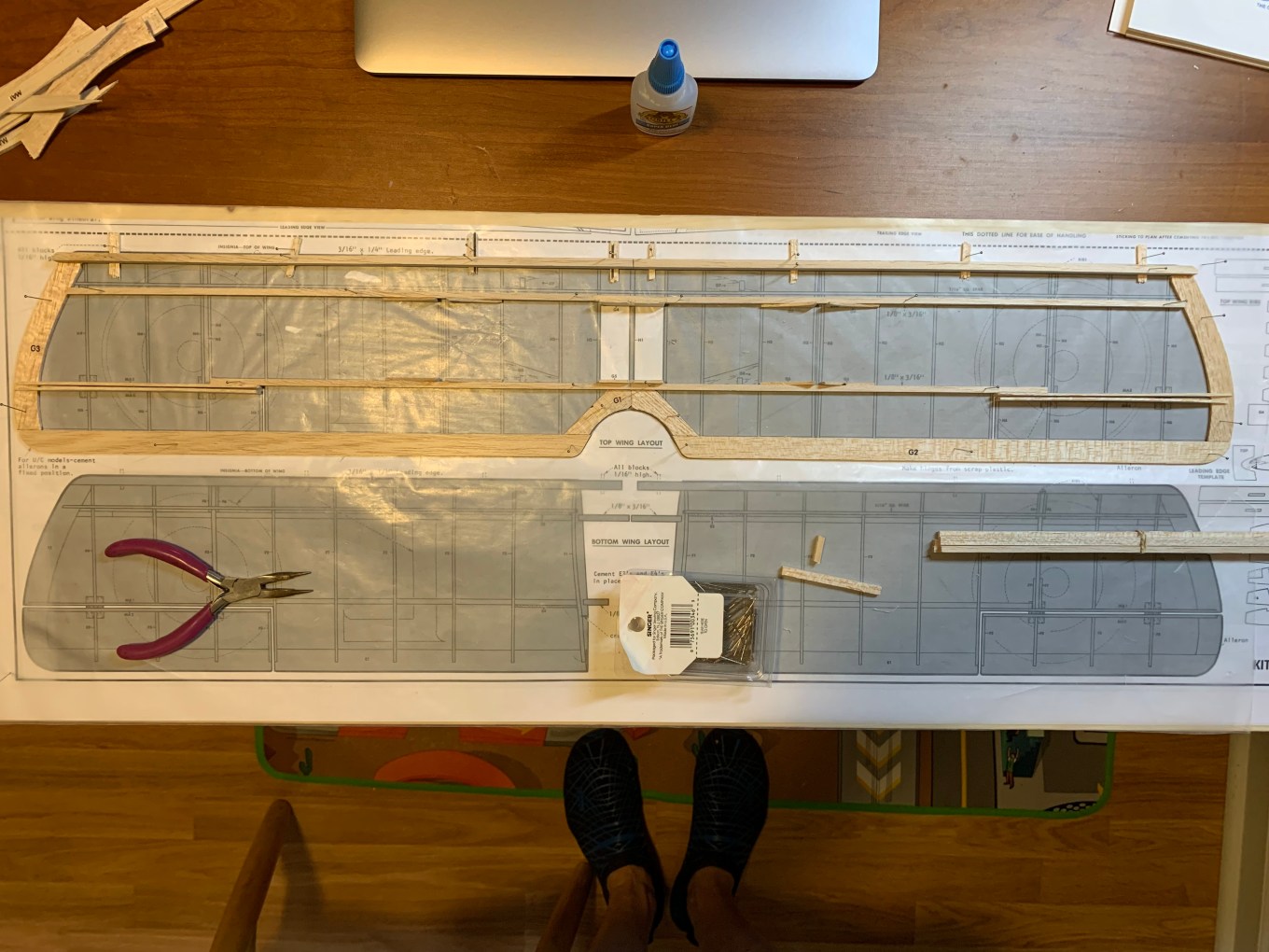 Being a biplane, there were two wings to build.  For no particular reason, I decided to start with the top wing and the first step was to pin down and glue together the leading edge, the trailing edge, and the wing tips.  Next up was to glue the two main spars in place.  The spars provide the longitudinal strength of the wing.