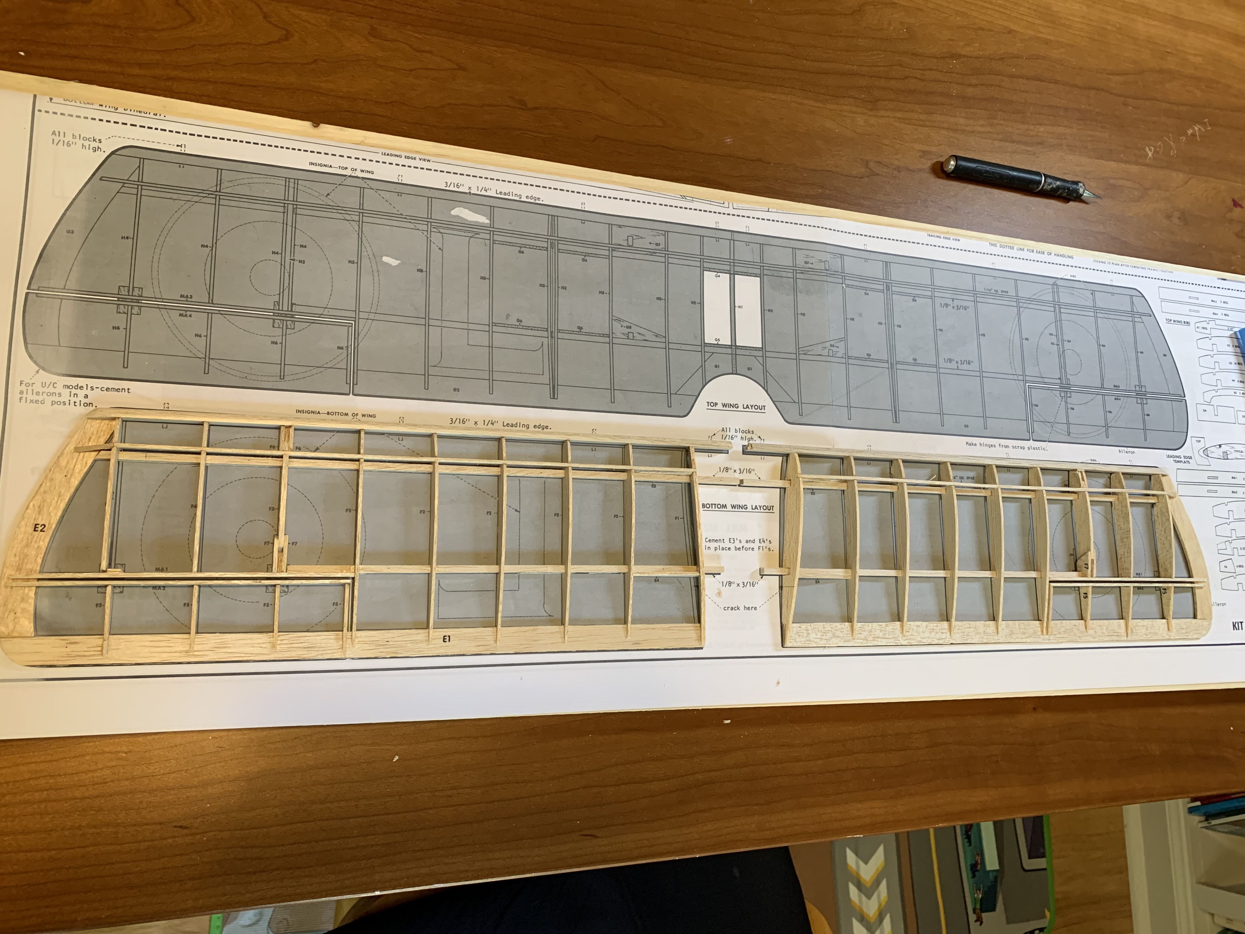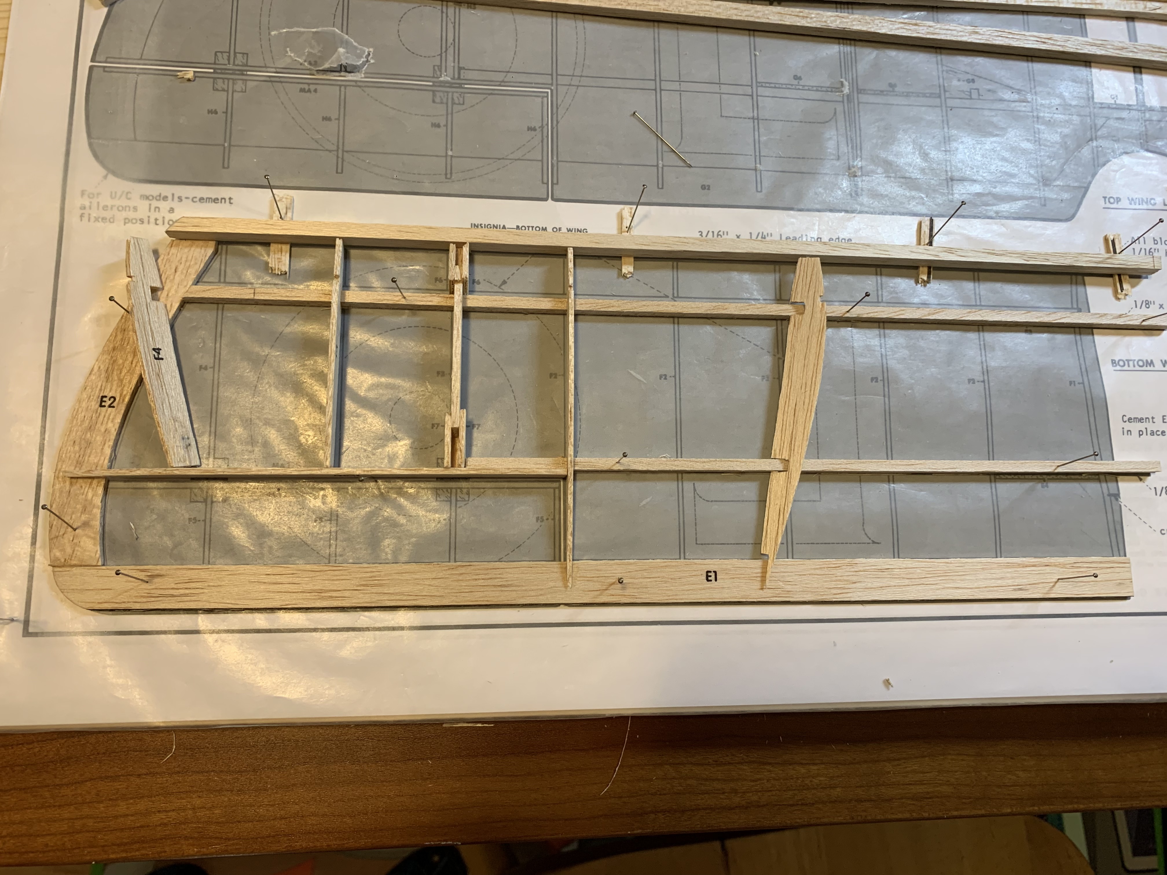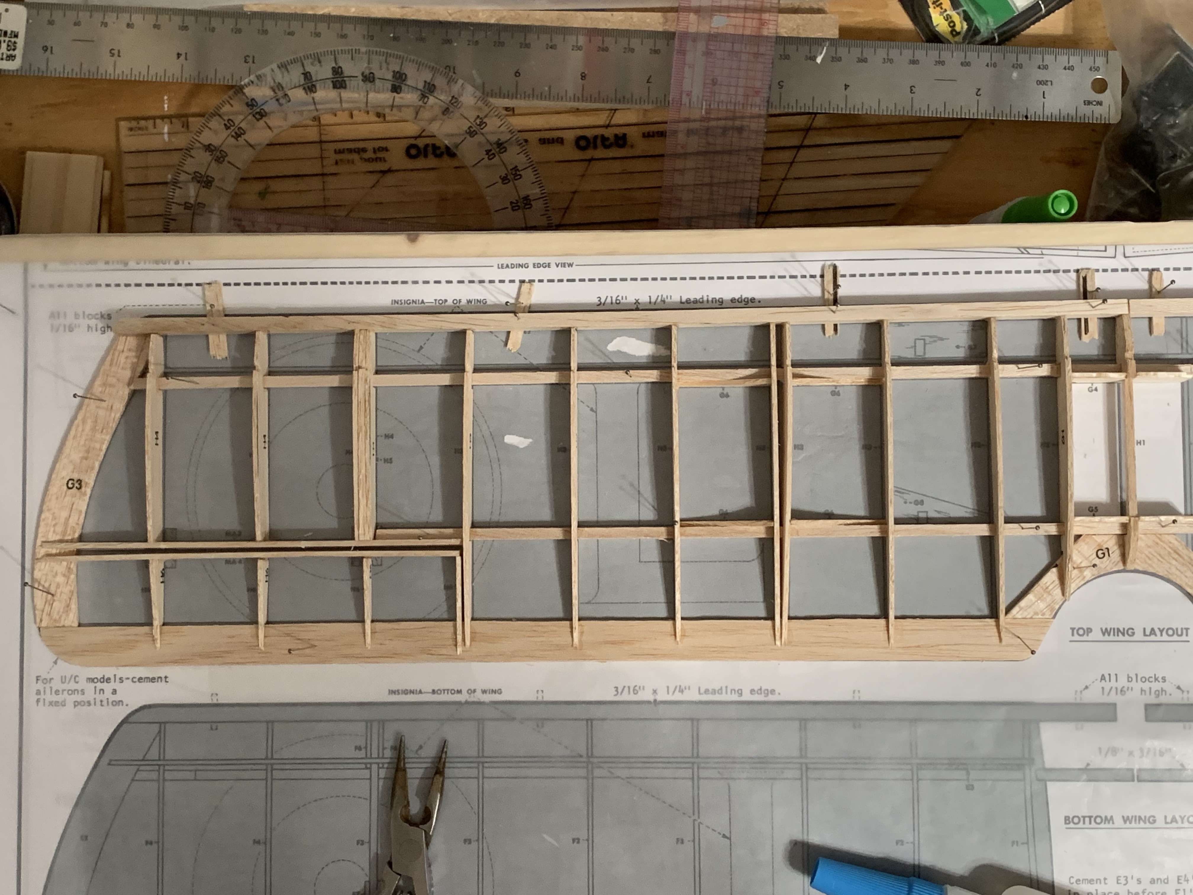 When I started on the bottom left-side wing, I decided to use an alternative construction approach since I had trouble with alignment on the top wing.  Rather than using the suggested 2-step approach of gluing the spars and front and back edges of the wing together before adding any ribs, I located the ribs in their proper place and then glued everything together at the same time.