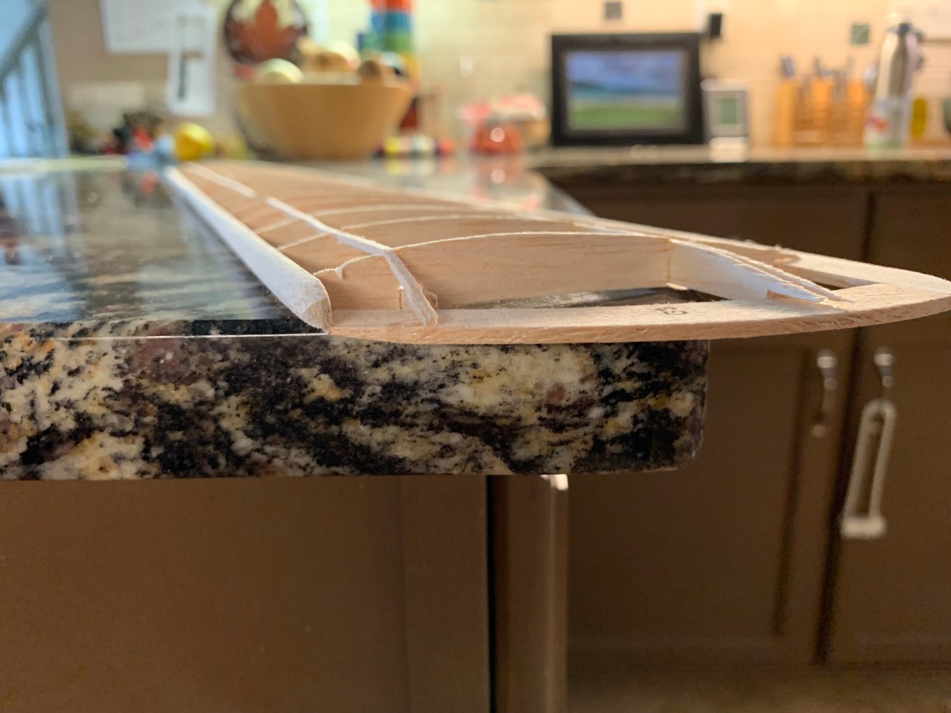 But there was one step left to finish the top wing.  It might not have been obvious from the previous top-down photos, but the leading edge was a large rectangular balsa strip.