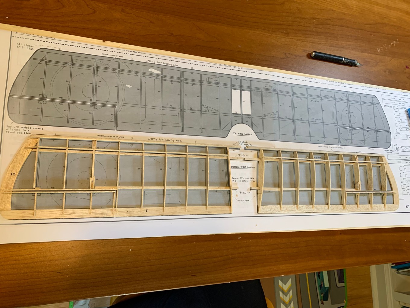 Working on the right side, they seemed to line up better so thankfully my misalignment had only occurred on the left side.  With the experience of completing the left side under my belt, I finished the right side soon after.  It felt like quite an accomplishment to remove the pins holding the wing down to the build-board and carefully pulling the finished wing from the wax paper.