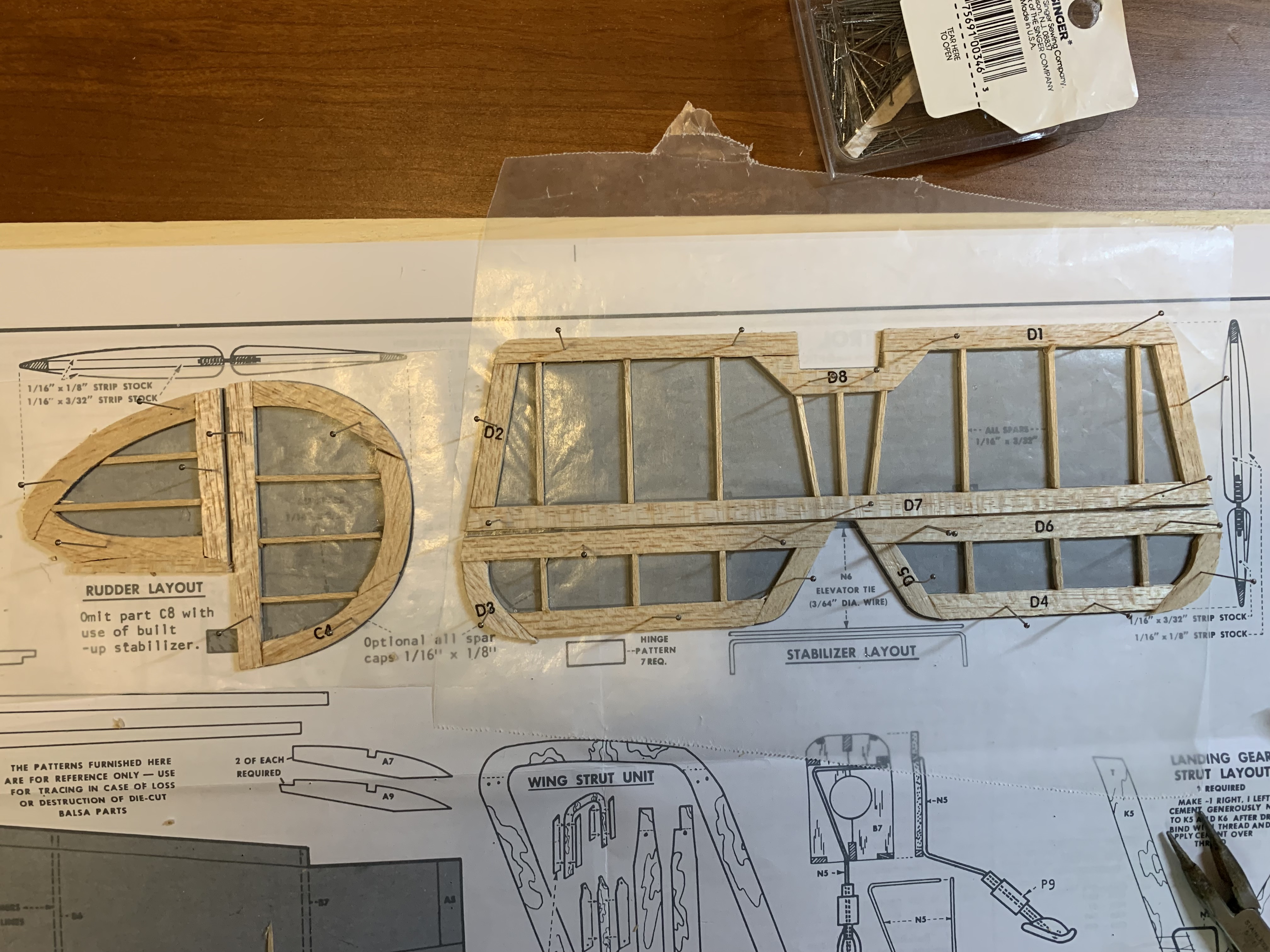 As with all the previous frame builds, I cut the individual pieces from the balsa sheets and then pinned and glued them down along the pattern on the instructions.  Then small spars were cut from balsa strips and glued between the tail frames.