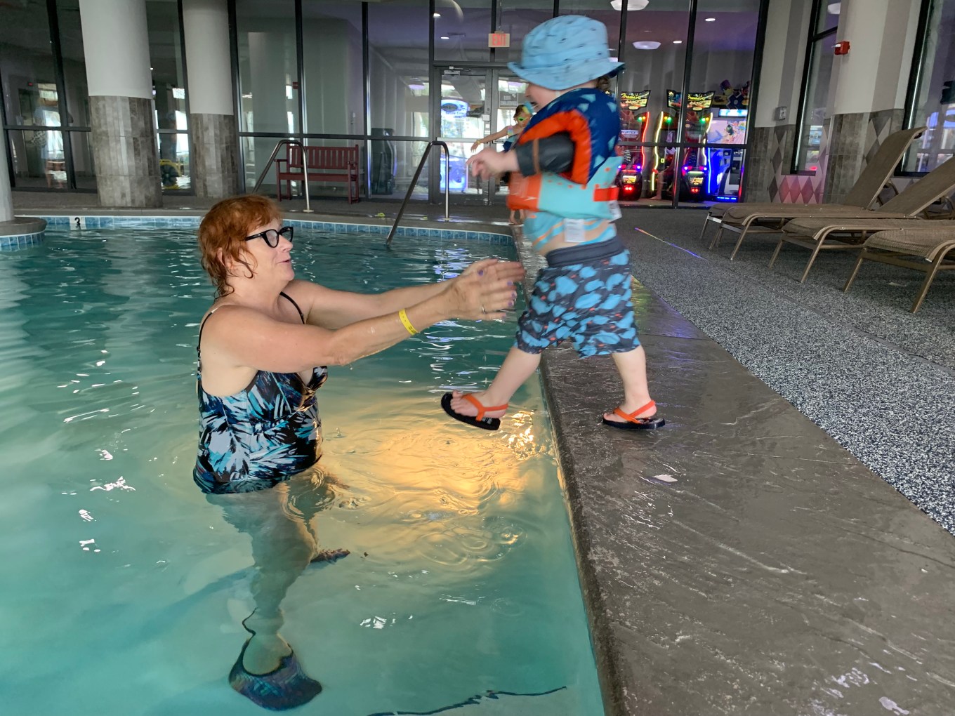 But this time, rather than just being along for the ride, our grandson was fearlessly launching himself into the water to my wife.