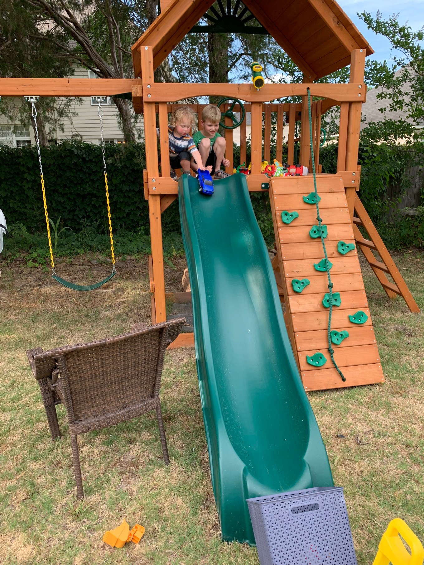 …while our oldest grandson enjoyed rolling cars down the slide with our youngest grandson on the new play gym I had built.