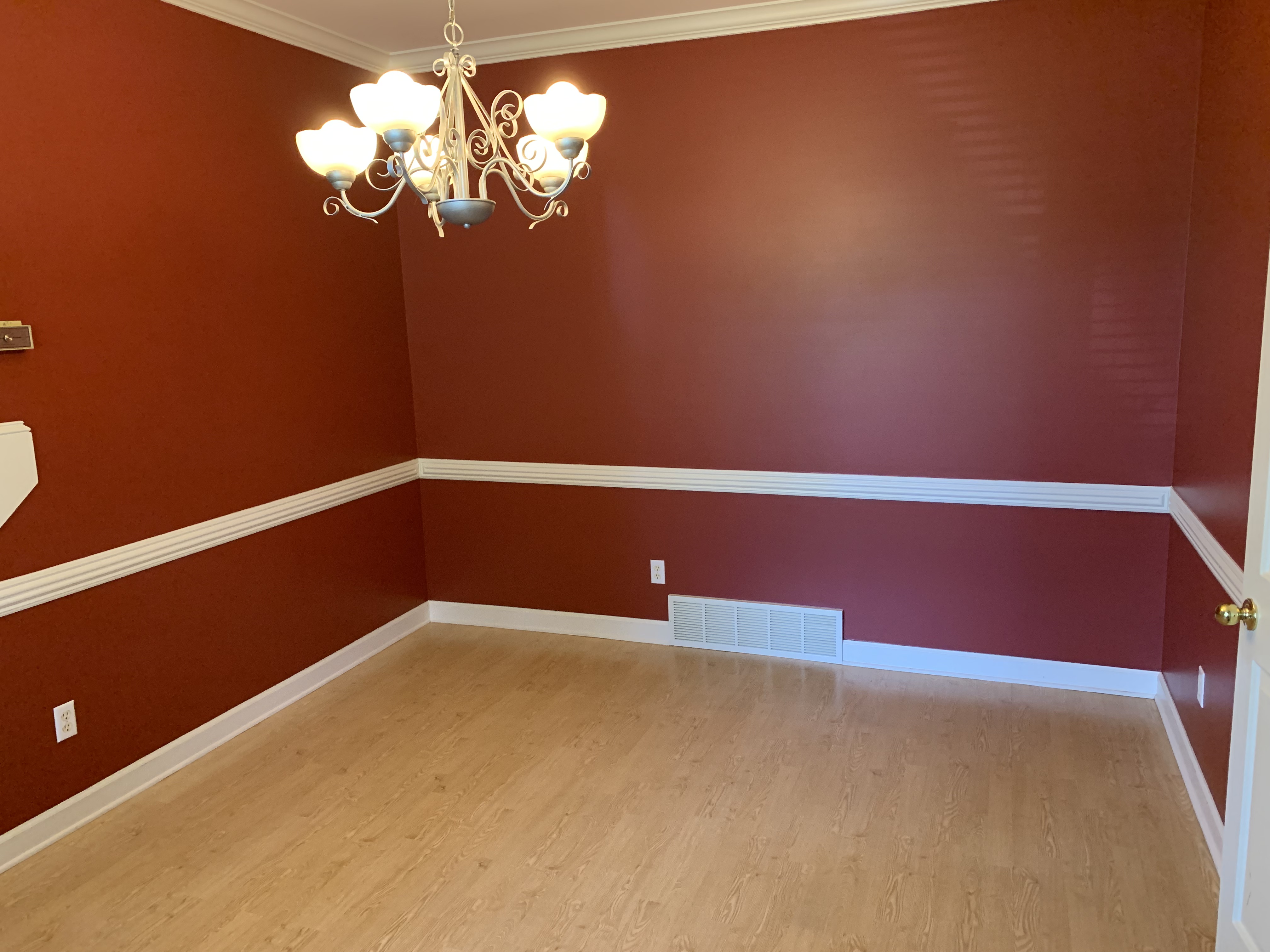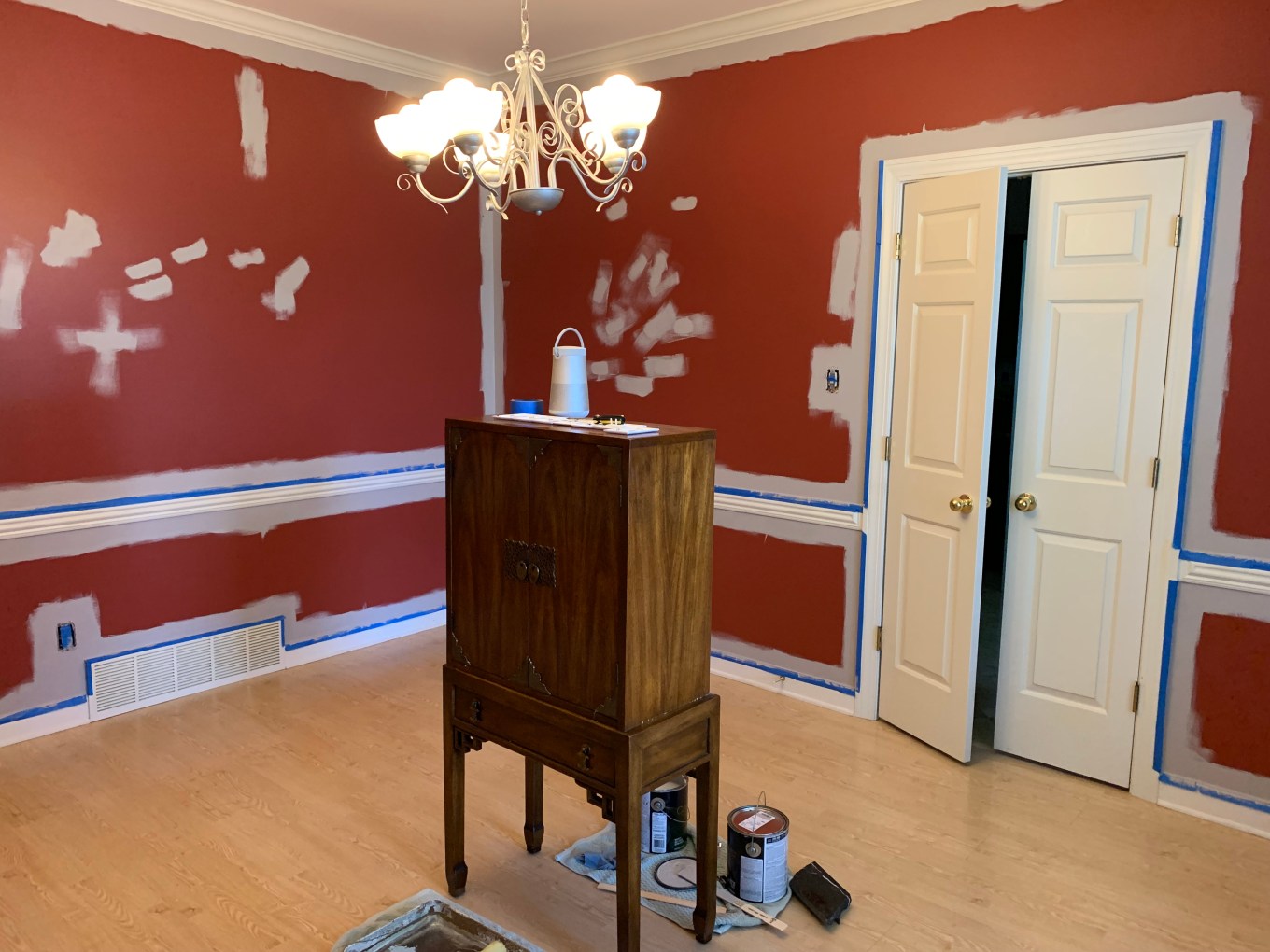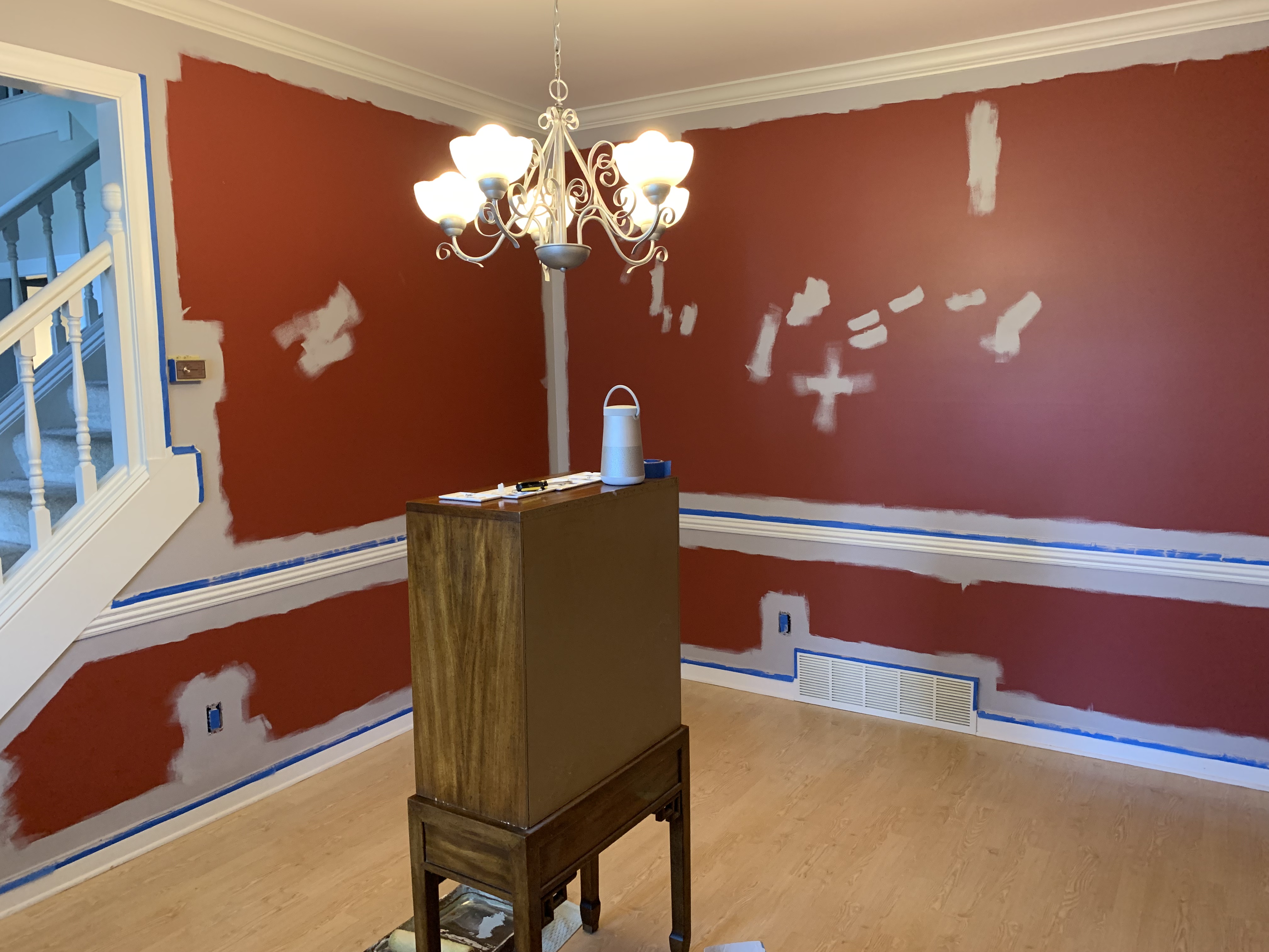 I typically let the paint fully dry overnight before removing the tape, so the new paint does not peel off with the tape. The next day as I carefully pulled off the tape, I discovered a number of places where I had accidently taped over some of the previous red paint. This is the downside of not painting the trim first but since the room was rarely used, it did not need to be repainted.