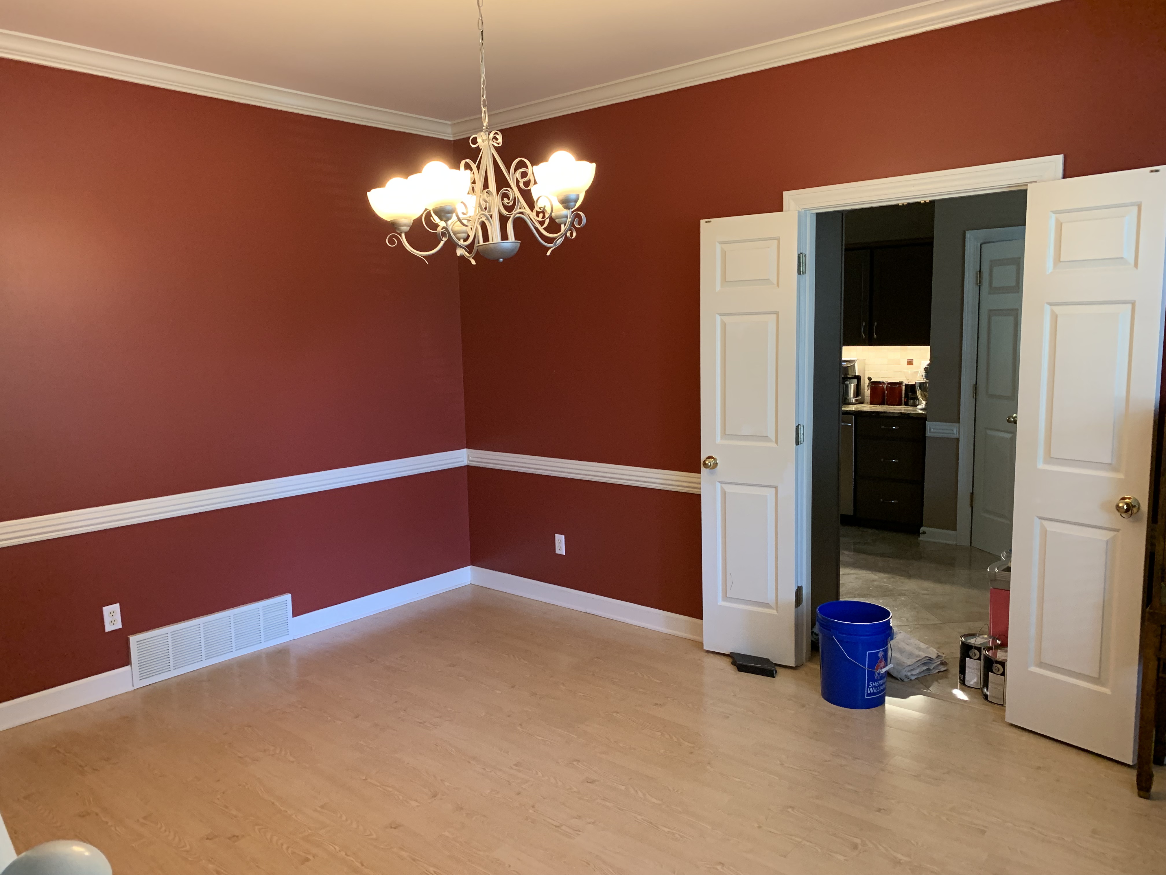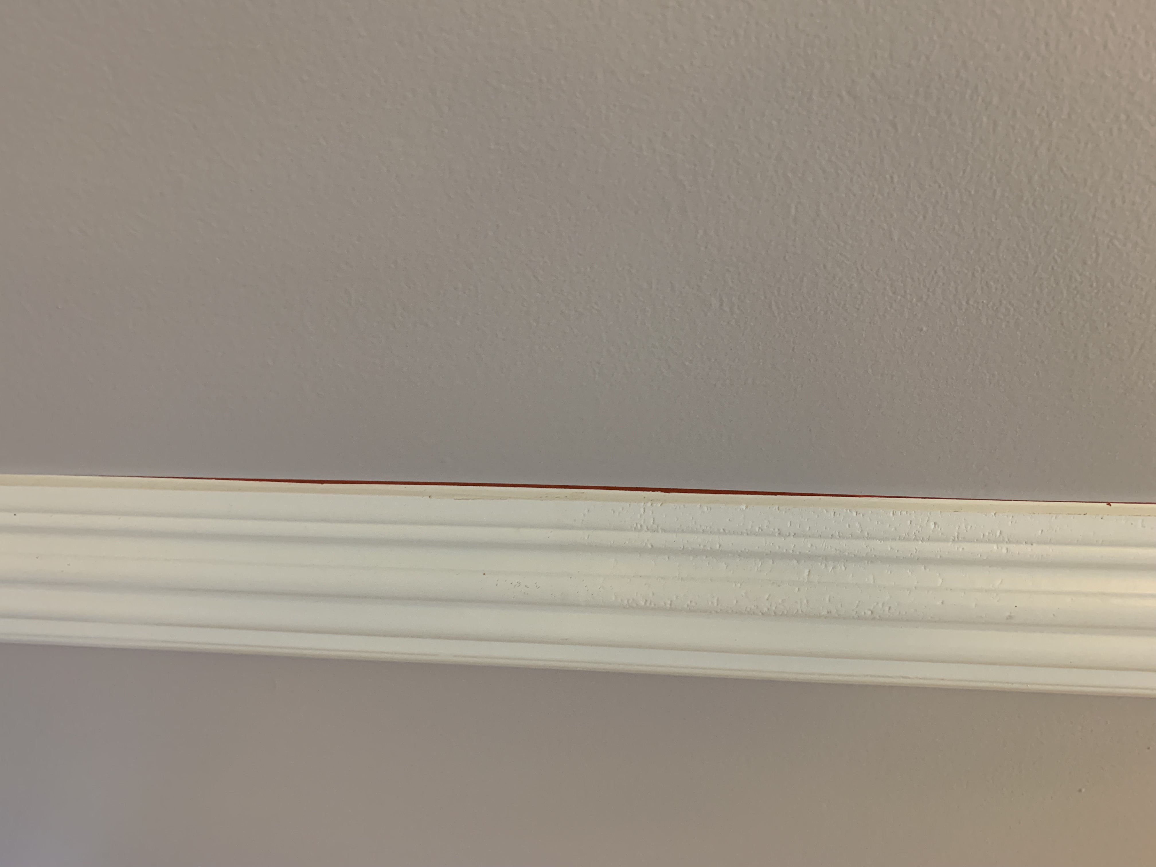 My remedy for this is to go around painting with a small model brush to cover the red and using a damp shop towel to wipe the excess paint off the white trim. My wife had been off at work all day and so when she came home and saw the finished room, she was most pleased.