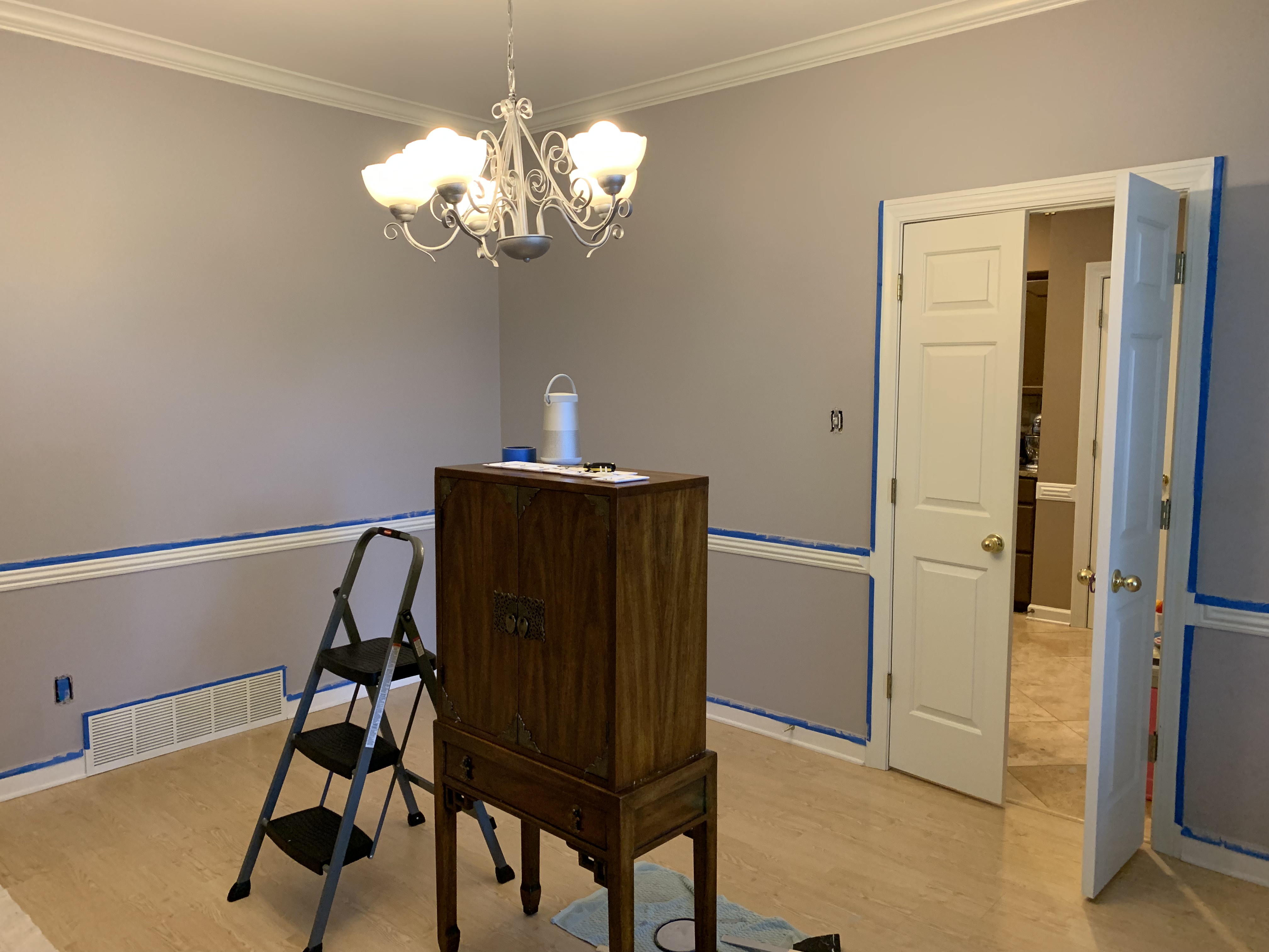 That accomplished, I next taped off the doors, windows and chair rails before applying two coats of paint with a brush.