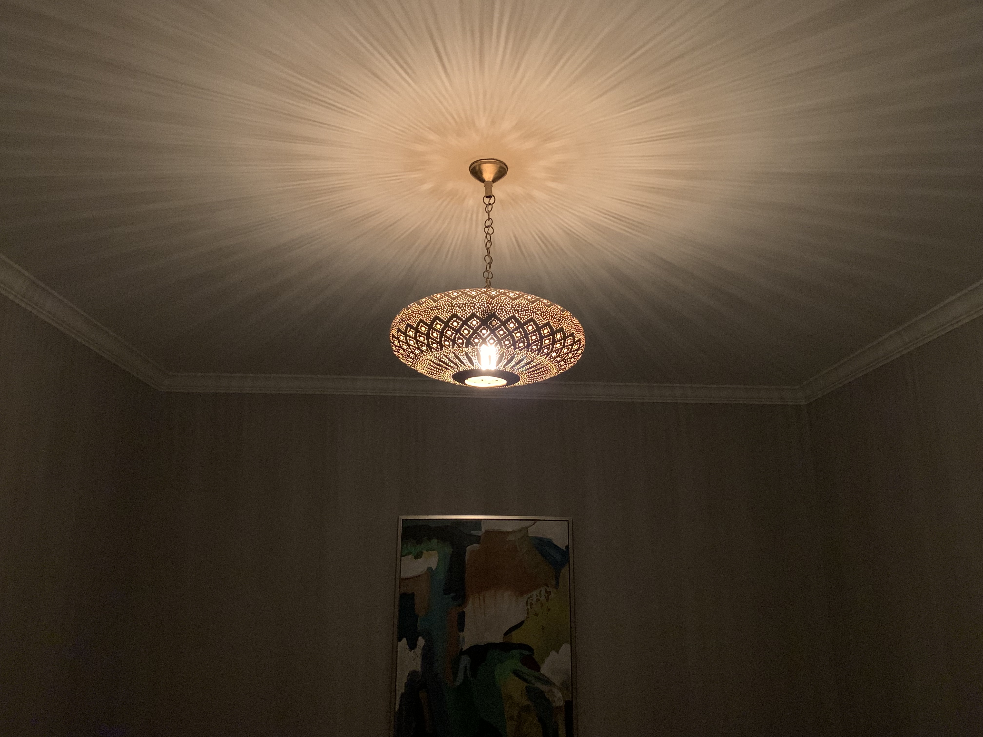 The Moroccan-style fixture had been hand made by someone and the canopy it came with was so small, it did not cover the poor job the builder did to cut into the ceiling board for the junction box. I explored replacing it with a larger canopy and even purchased one online but due to the unique nature in how the fixture had to be hung, none of the replacement canopies I saw would work. So, in the end, I did a repair job around the junction box to be able to use the canopy that came with the fixture.