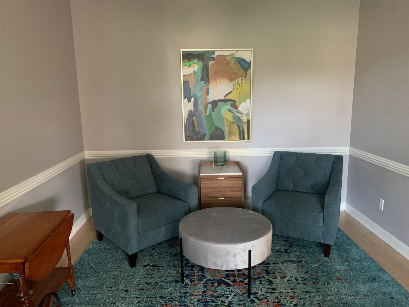 She also purchased an ottoman, a new end table, and a new painting for the wall, retaining the tea cart that had previously been her mother’s.