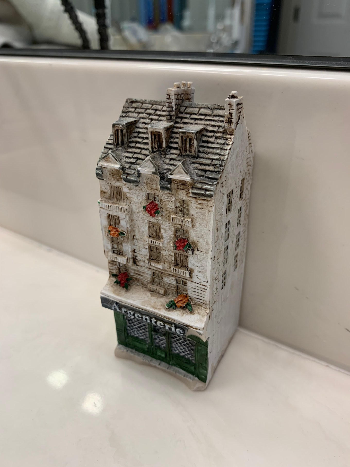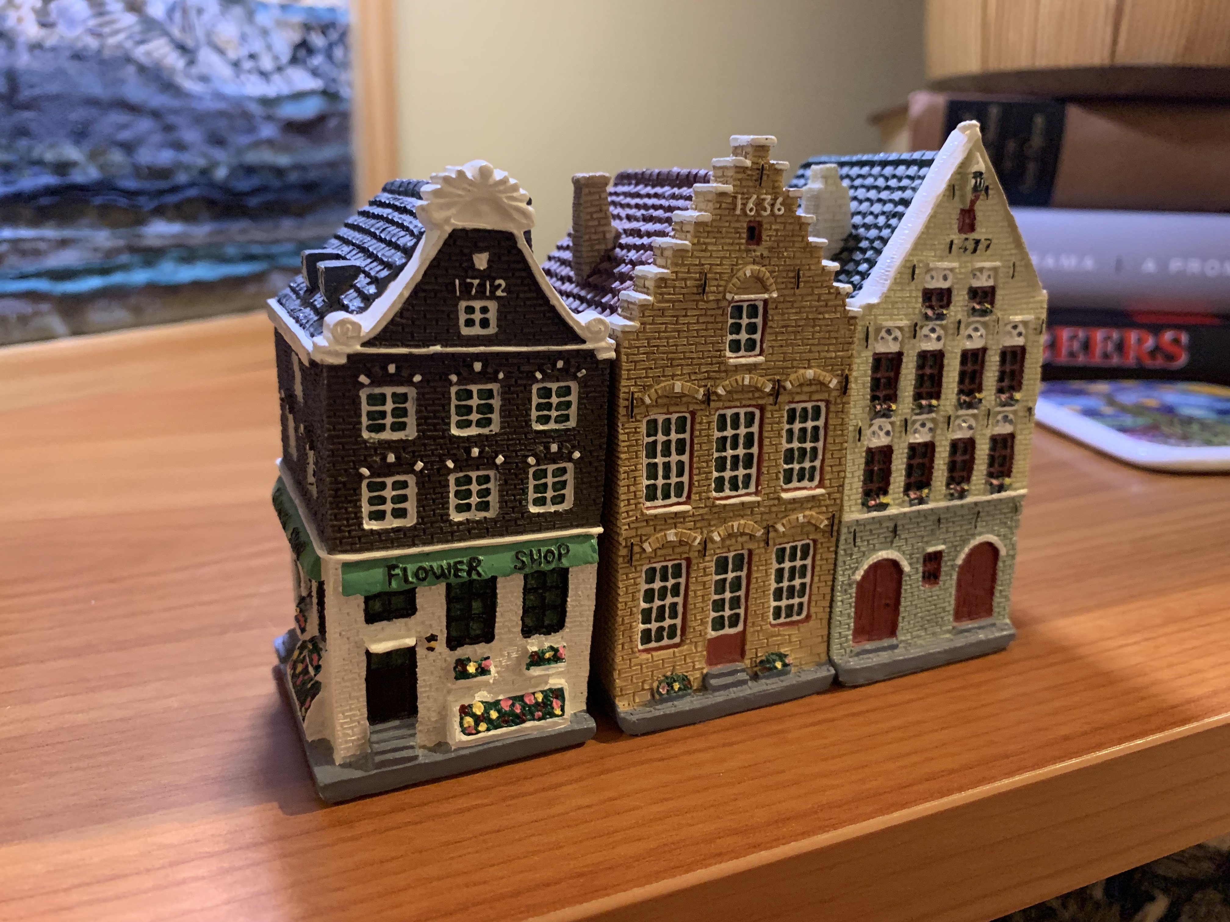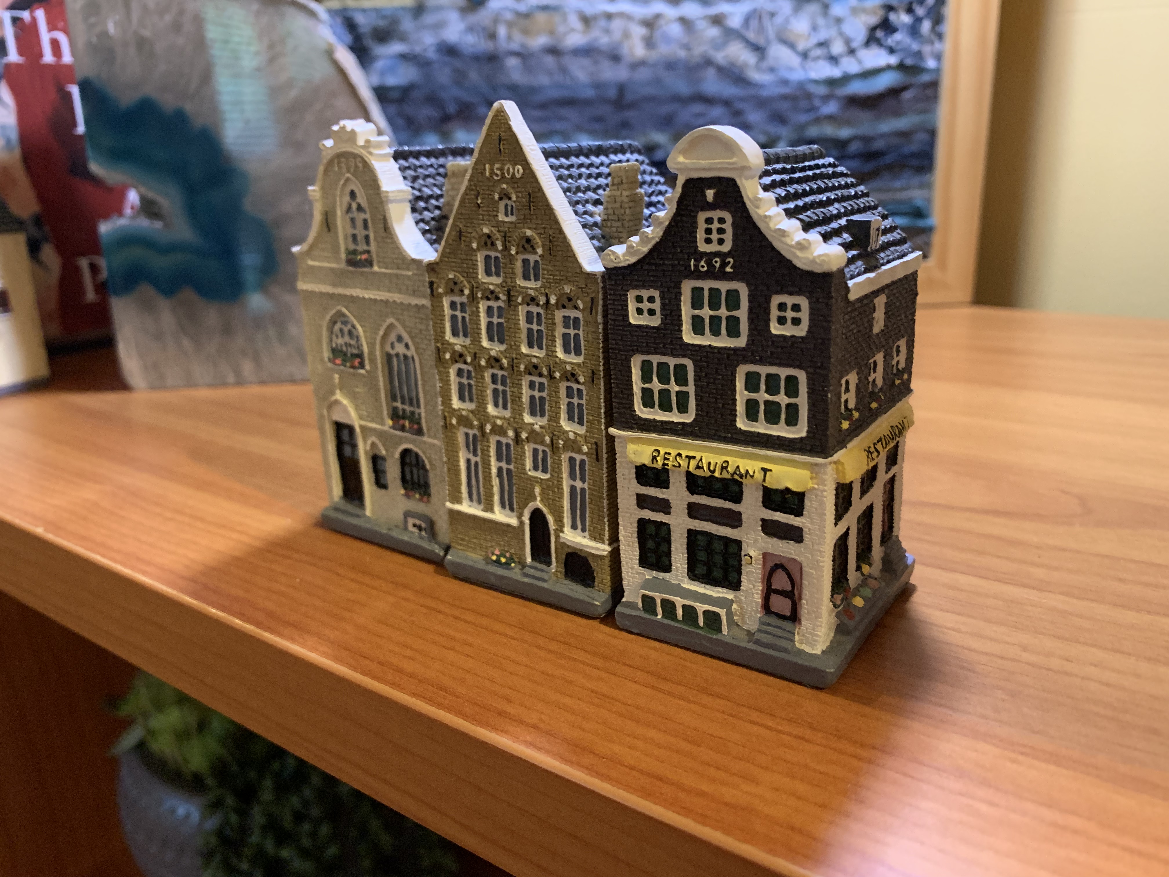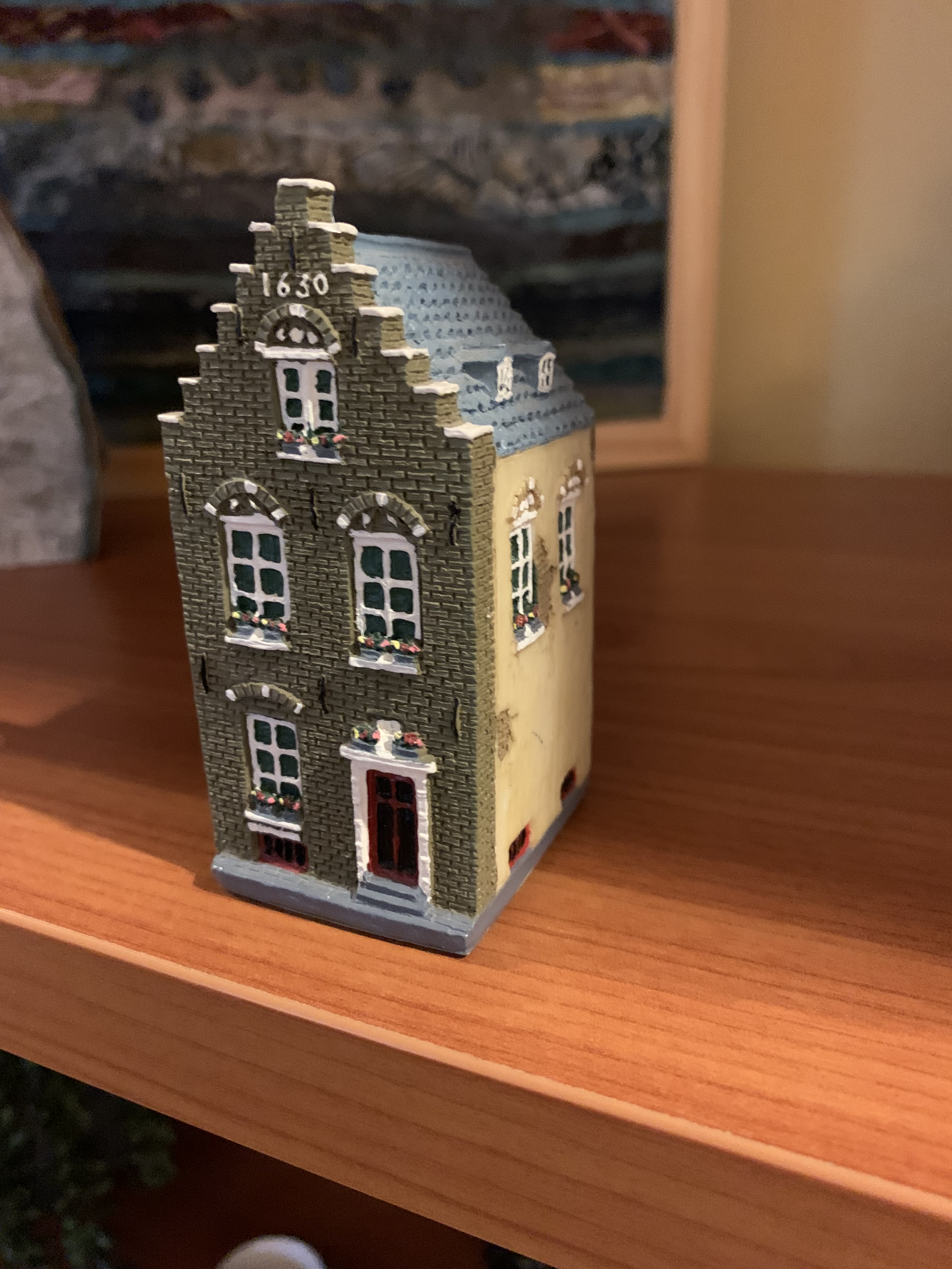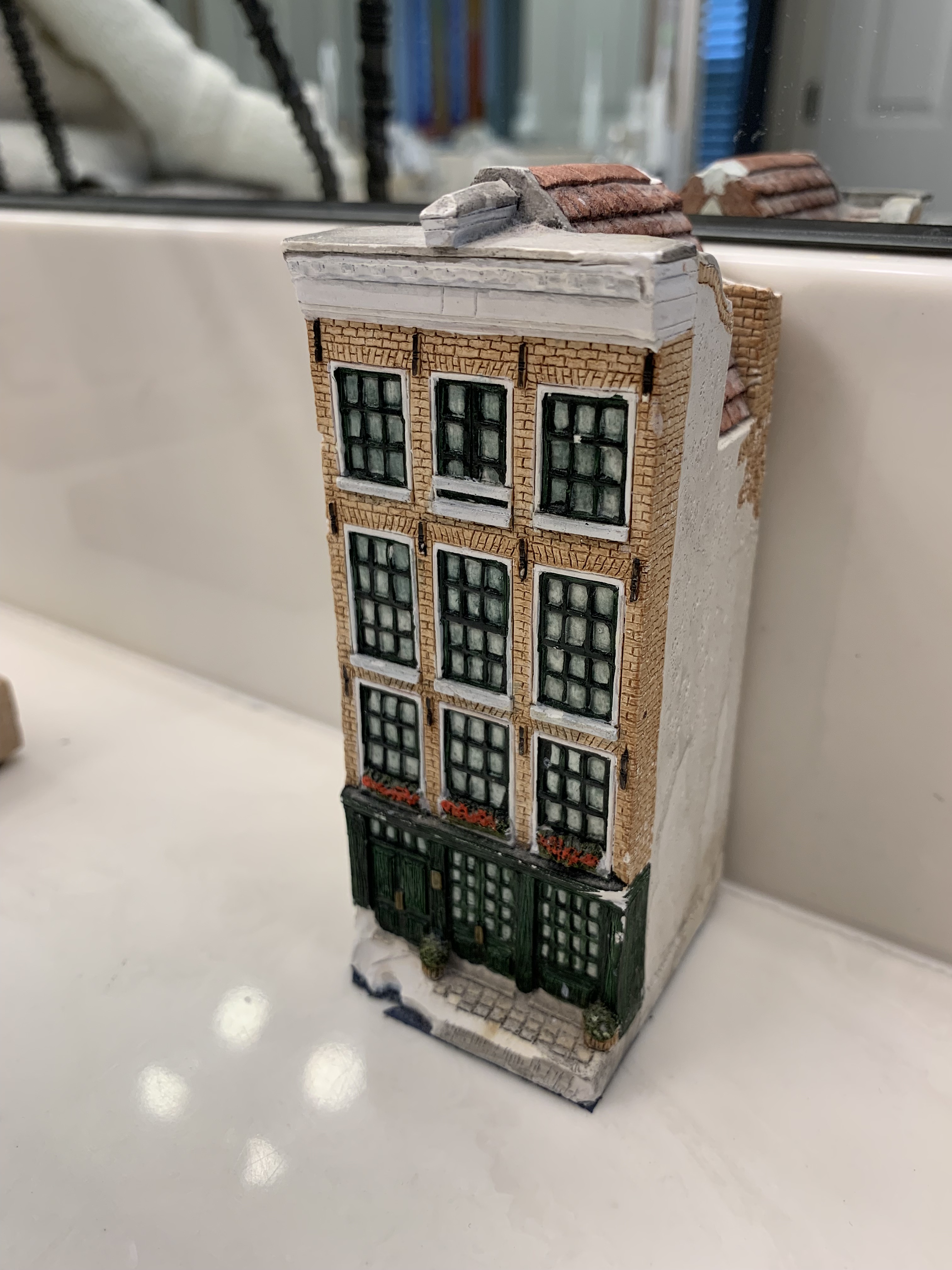 Walking in, I immediately recognized the one modeled after the Anne Frank house. I thought what better souvenir than a miniature of where she and family hid during the German occupation of Holland and I had visited on one of my previous trips. Over the years, as you can see, it has not fared very well having been dropped several times. But it still sits on my side of the vanity in our bathroom at home.
