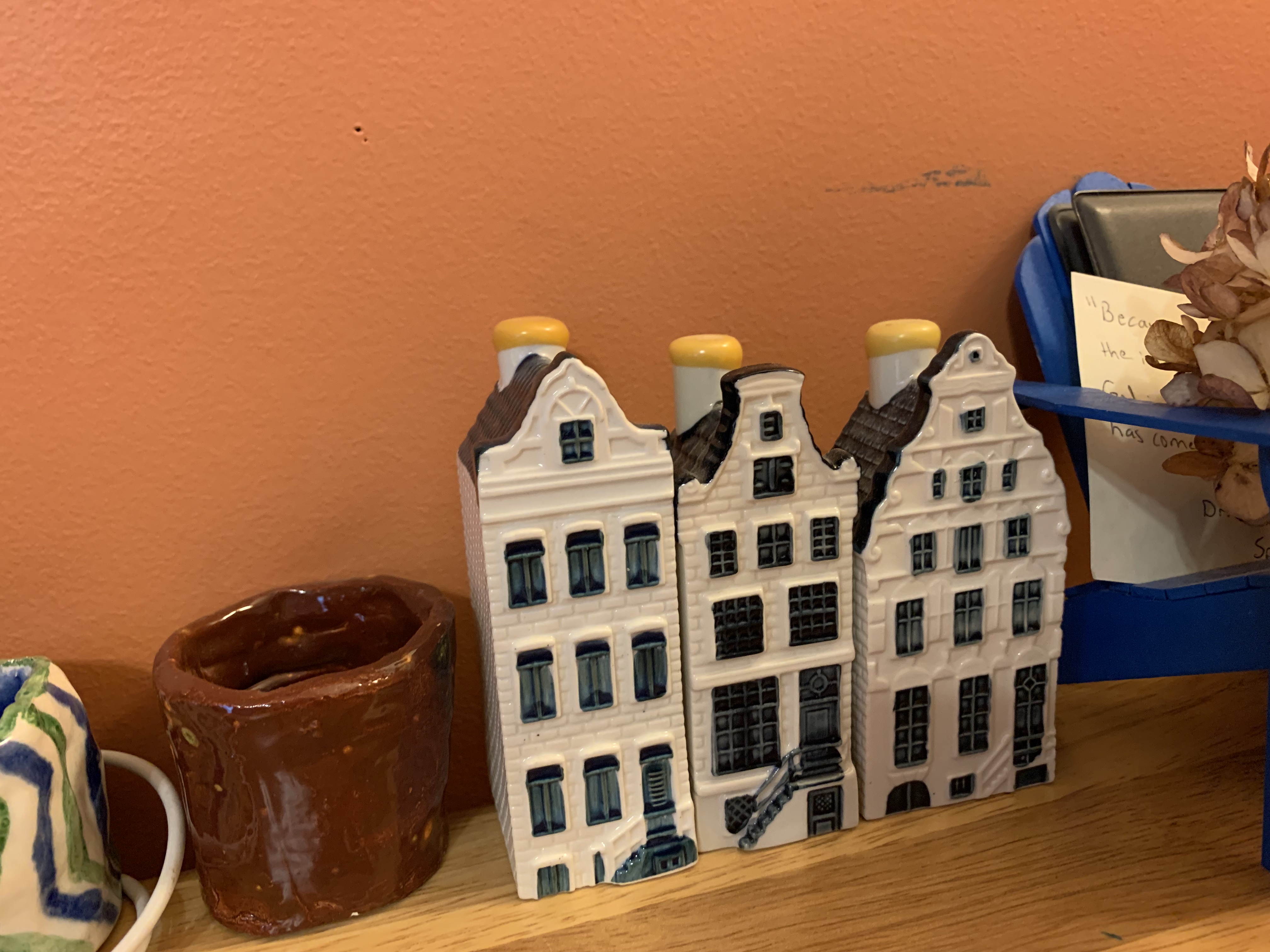 On the rare occasion when I was fortunate enough to fly Business class on KLM, I began to collect some of their Blue Delft homes filled with BOLS liqueur. Ironically, these three have sat on my work desk at home ever since I retired in 2017 but have not prompted the same reaction I had recently to this first one I had collected so many years ago. I guess seeing these on the desk all the time, it just did not stick out in my consciousness.