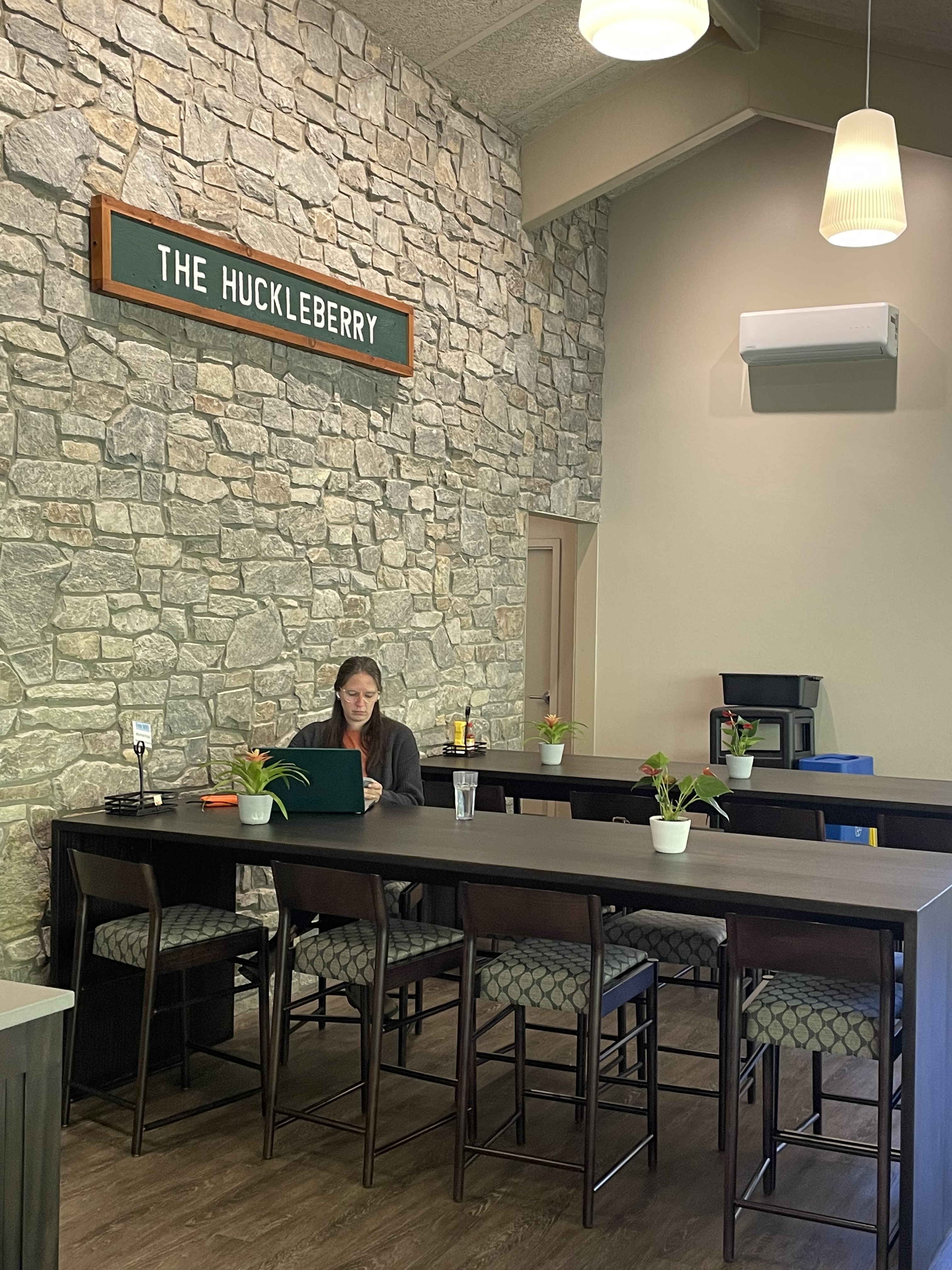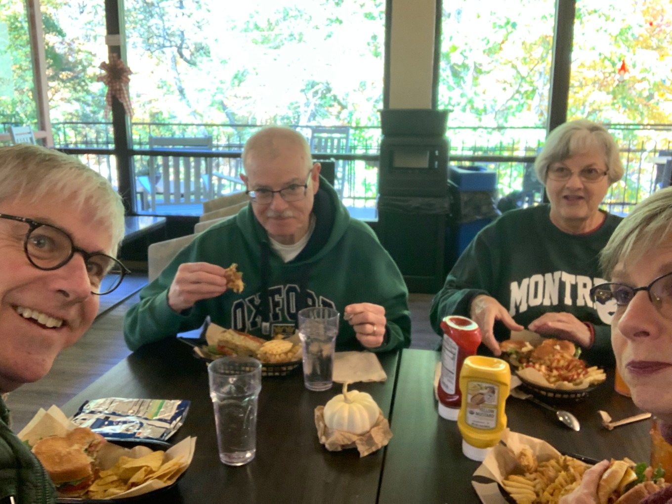 On Tuesday, our last day together we awoke to a much colder day. For my oldest sister and I, it was too cold to even consider a walk. So, she and I drove down to the Moore Center (building with the bookstore and porch) to meet our brother and sister (who had hiked over) to enjoy for the first time in I don’t know how many years, a burger at the grill we always looked forward to eating at growing up.