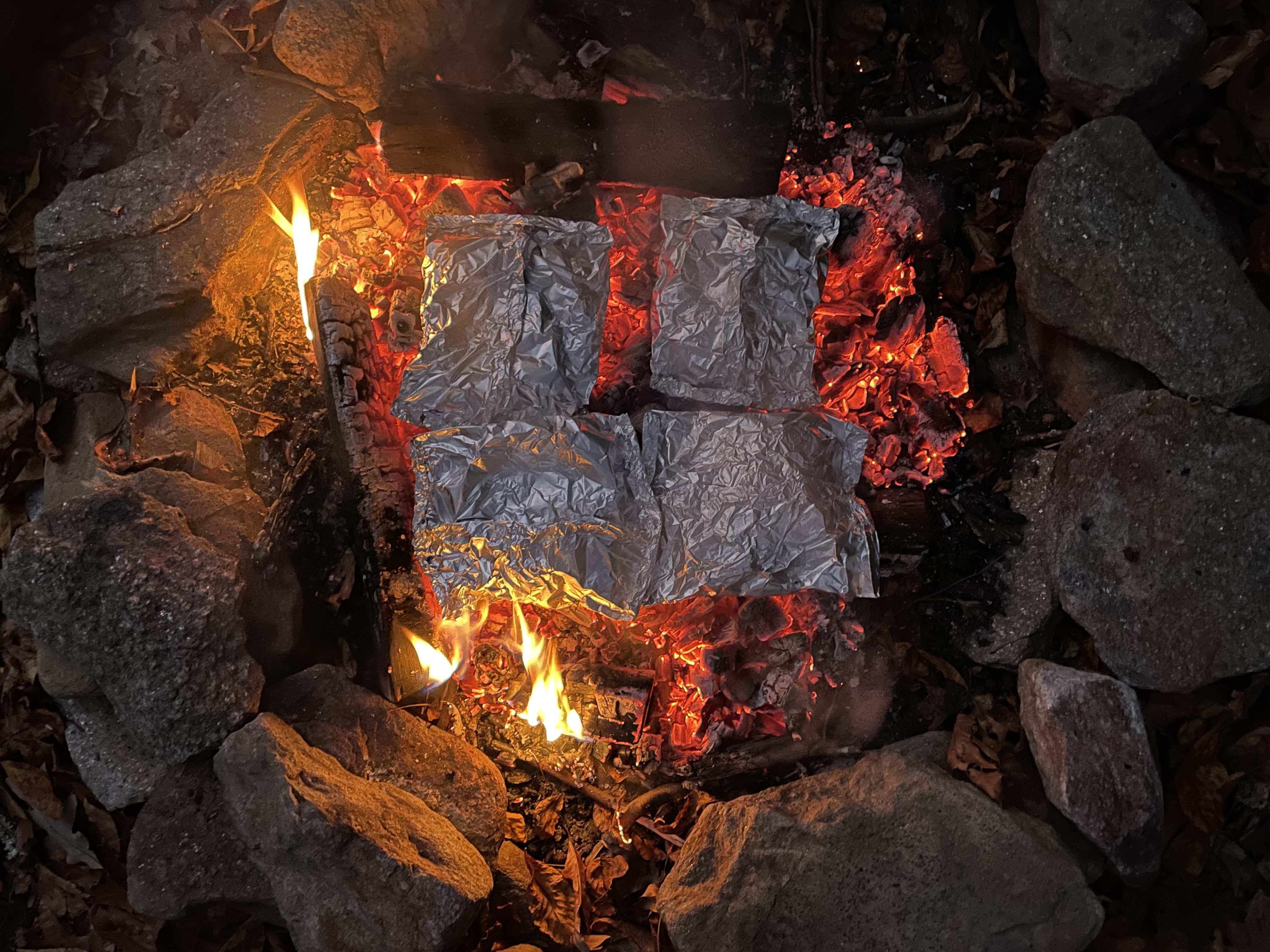 Once we had a good bed of coals, she tossed them on to cook while we continued to enjoy the warmth of the fire as the weather turned colder.