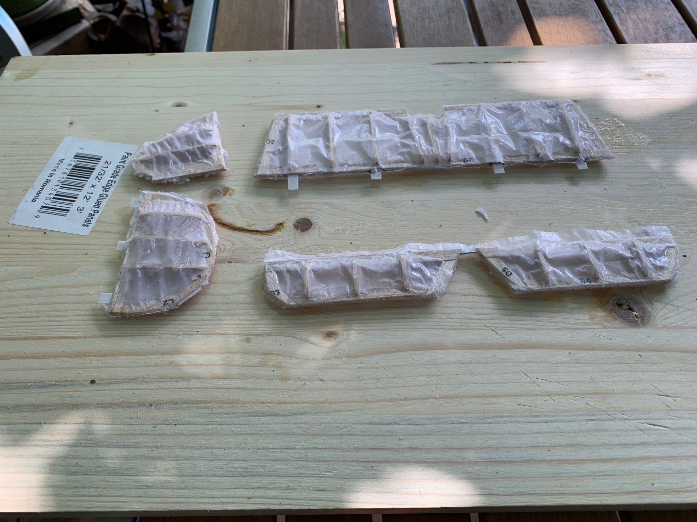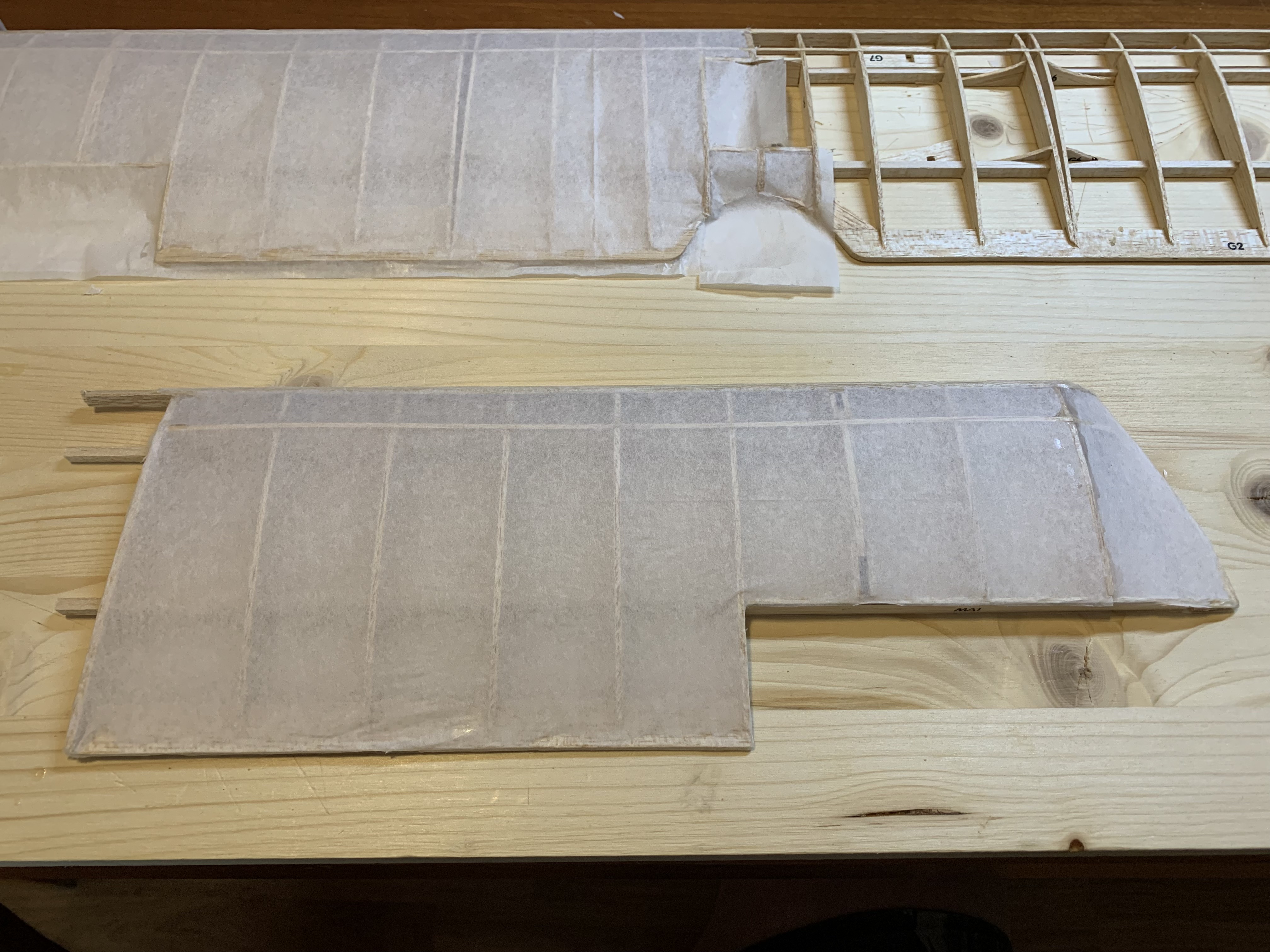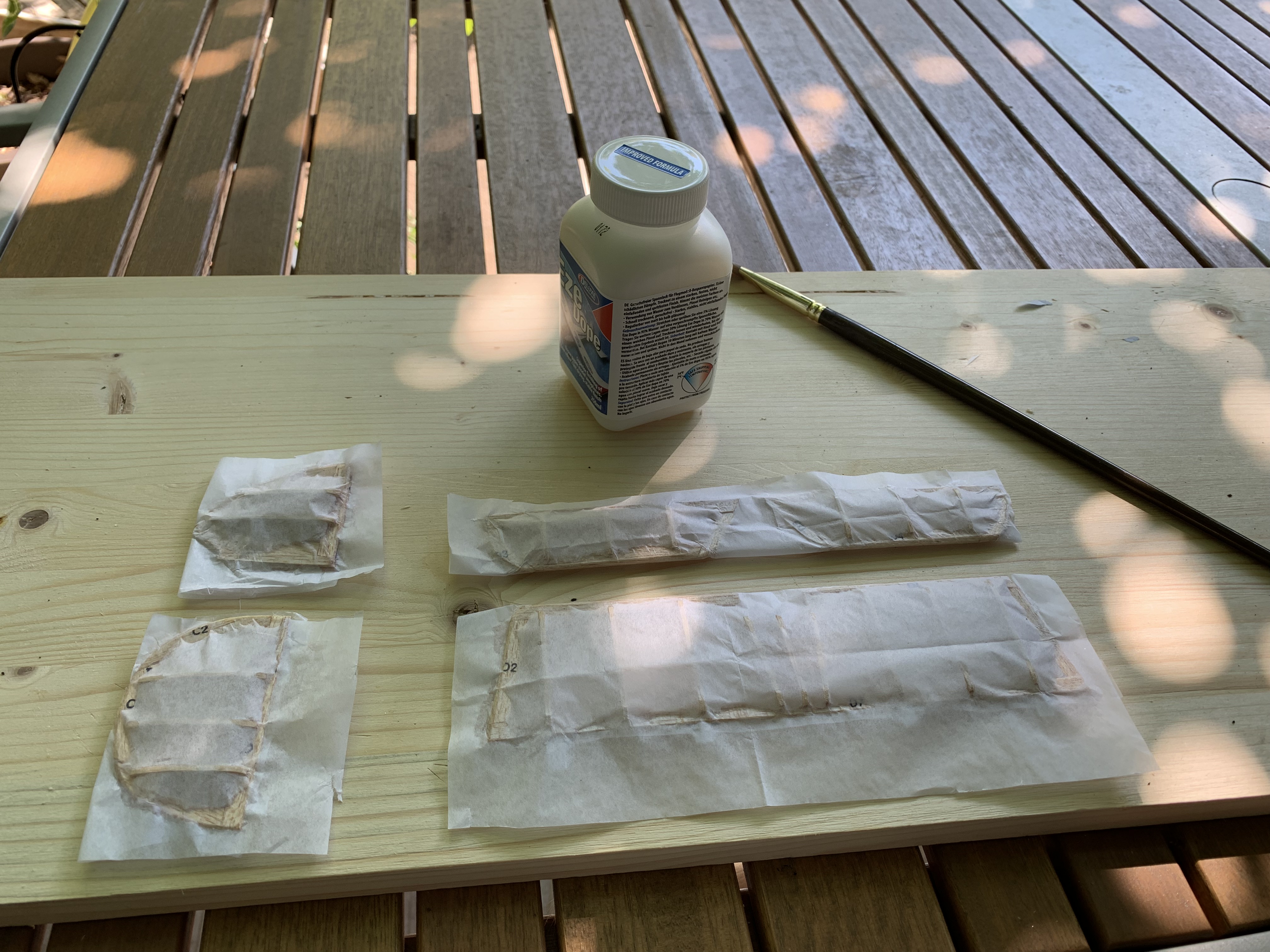 I was a bit timid in this first attempt and had to occasionally add additional dope to get the tissue to adhere to the outer surfaces of the frames. Following the instructions, I then tried to stretch out any wrinkles. I then left them to dry outdoors.