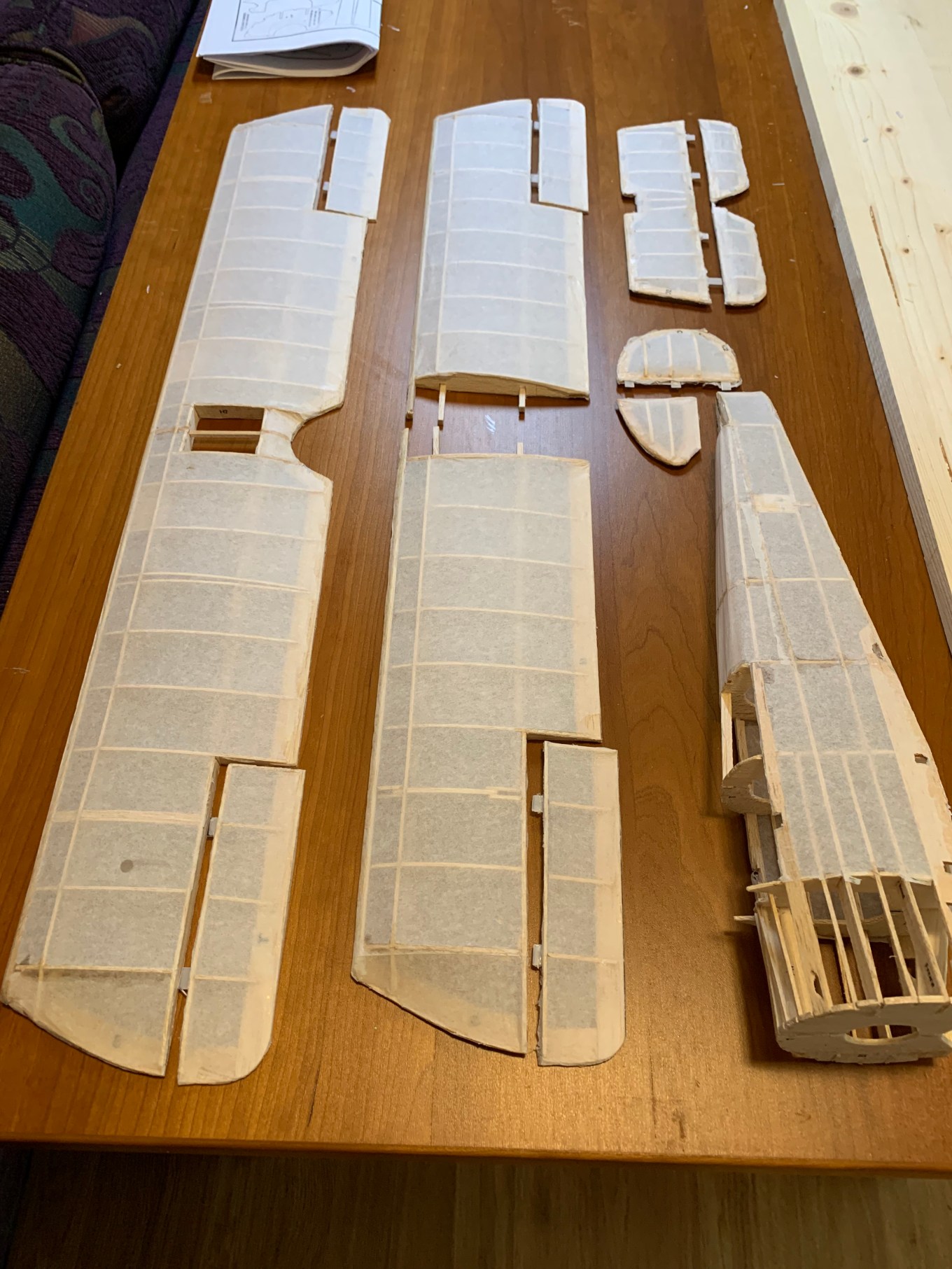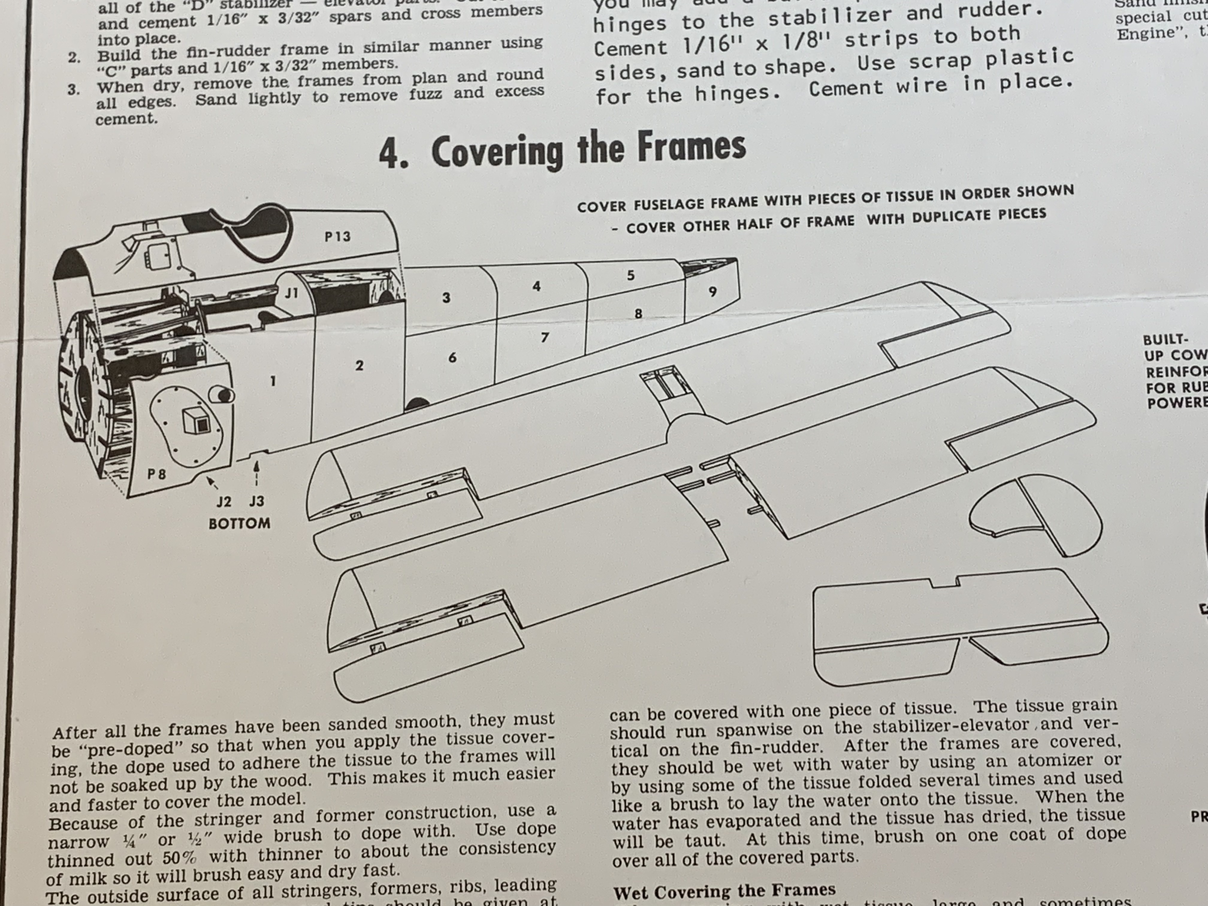 It was to be covered in individual sections, no doubt since it was tapered from front to back which would leave numerous wrinkles as less and less tissue was needed. I did a few sections and began to feel more confident. I did learn that once the dope dried, you had to be very careful when trimming the excess tissue not to cut into the overlapped tissue sections already finished (which I did more than once).