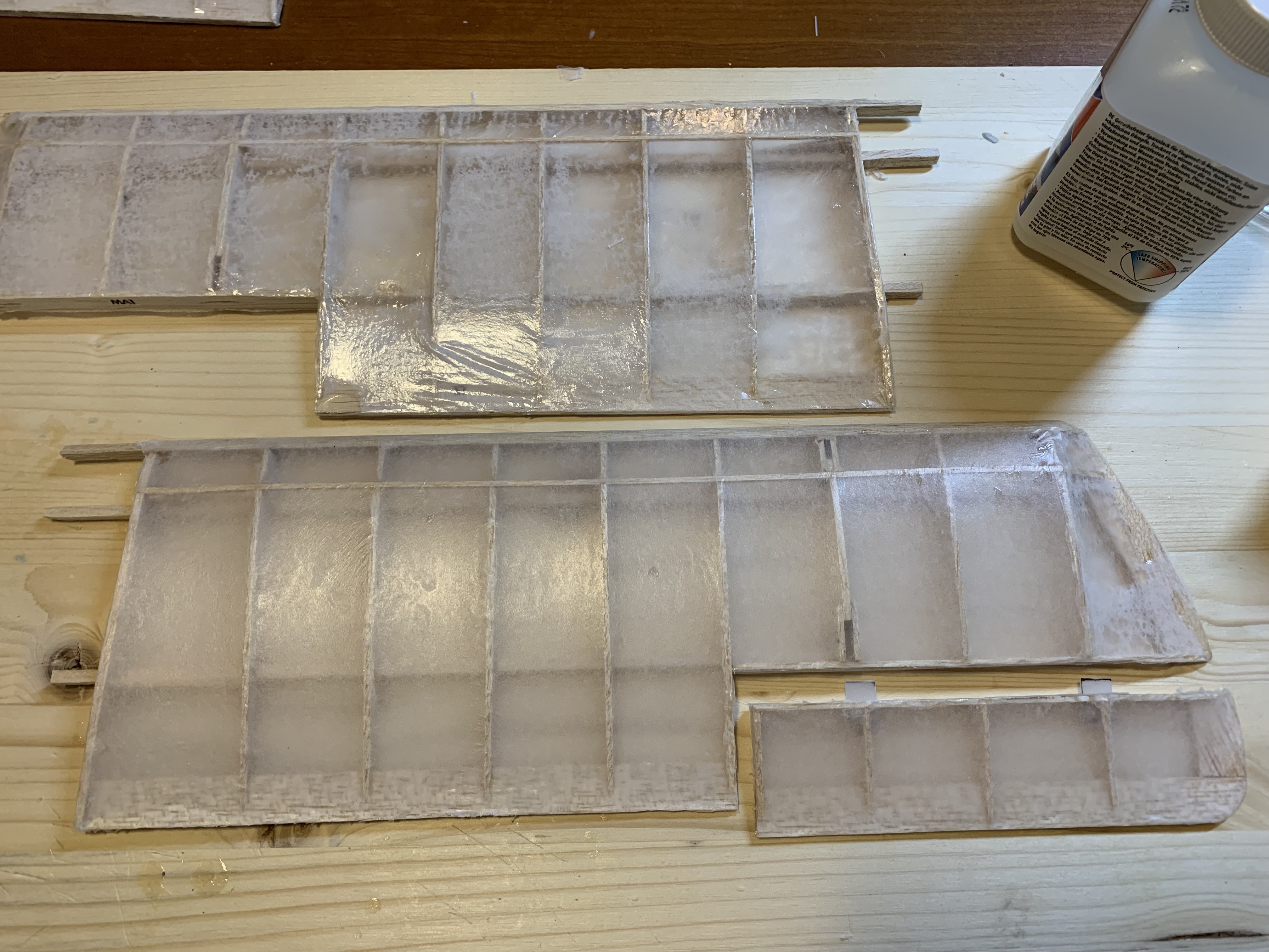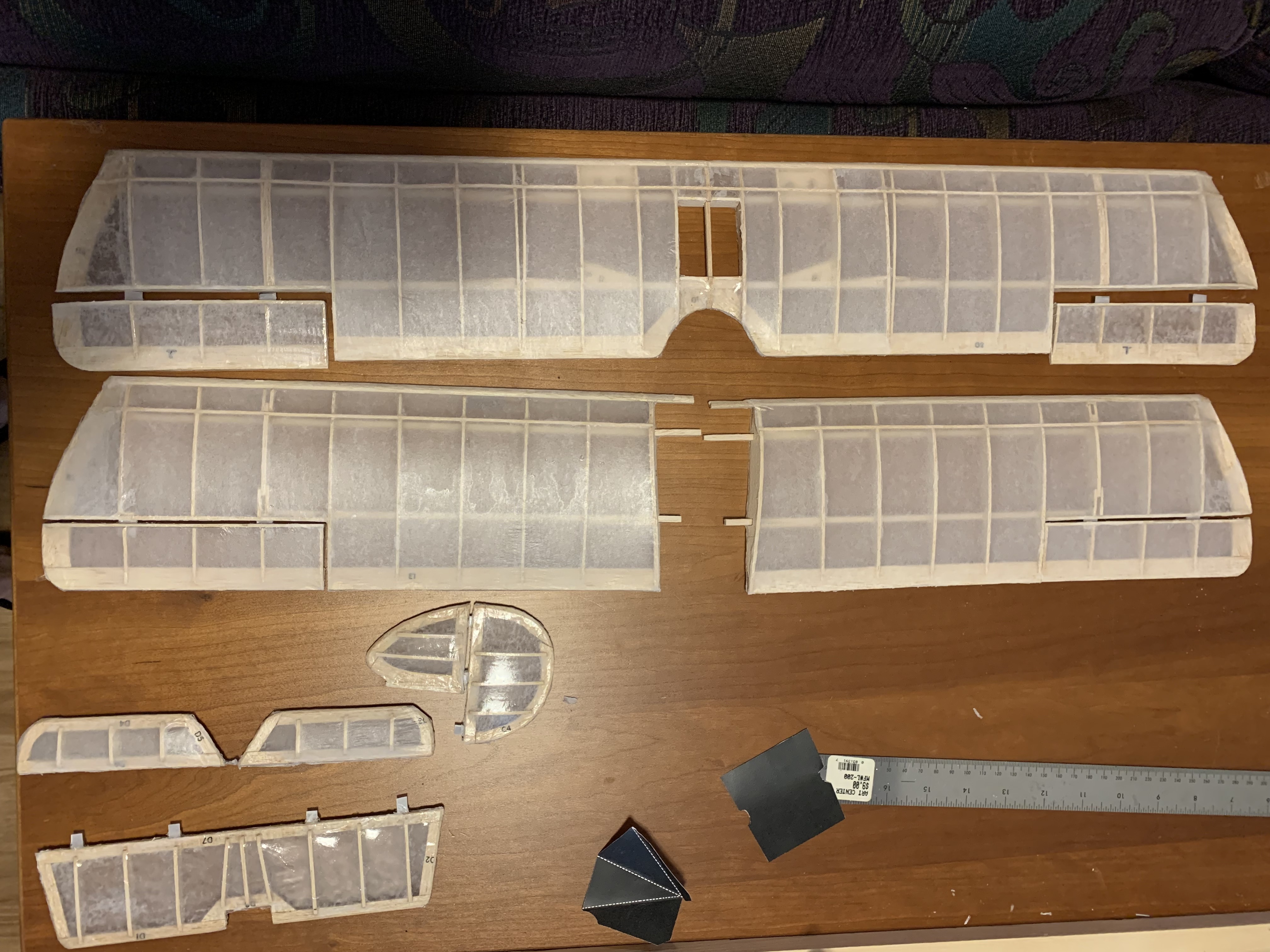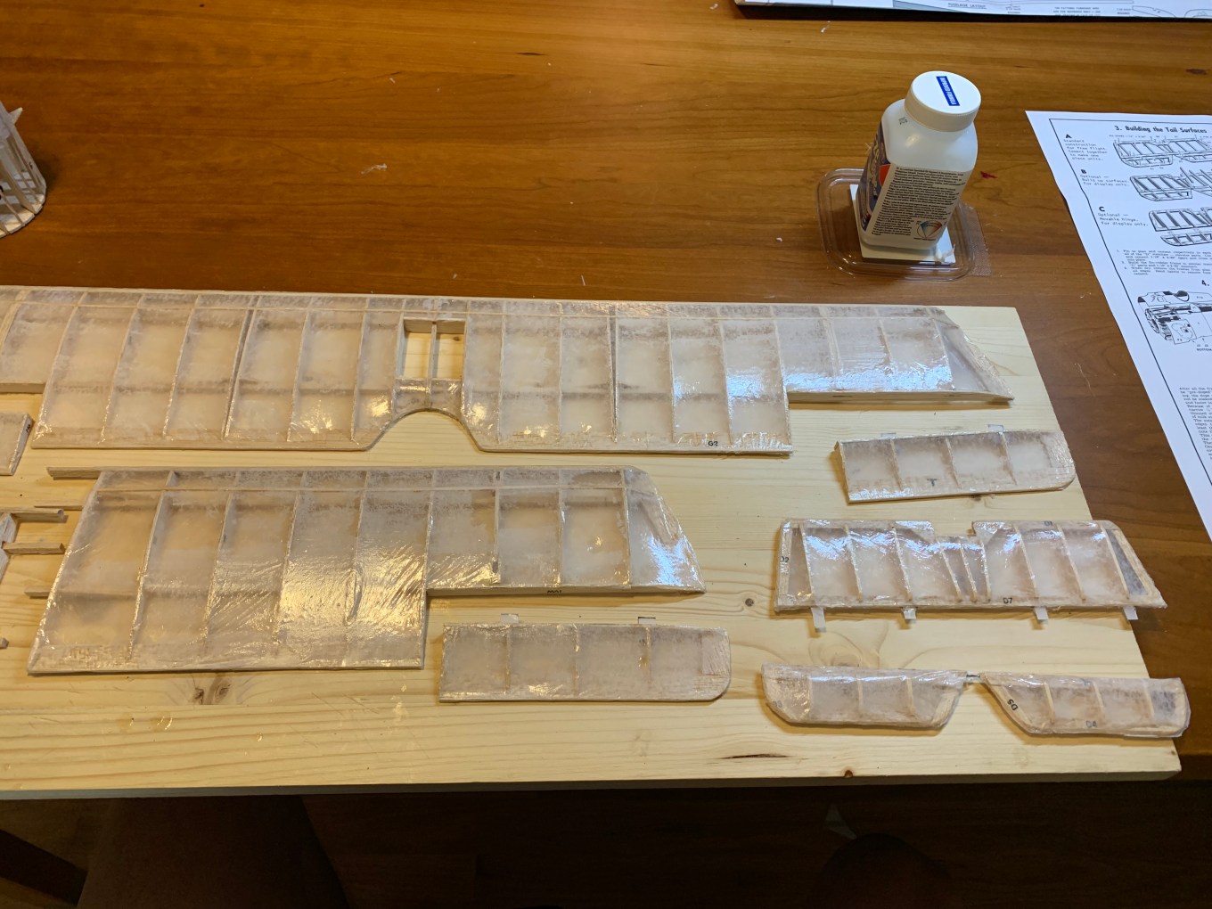 At this point, I was sort of committed to my path forward and so finished applying full strength dope to the rest of the frames. Once dry, I applied dope to the bottom side of all the wings and tail sections. These all demonstrated the same effect—wrinkling upon application but once dried, mostly, though not completely wrinkle-free.