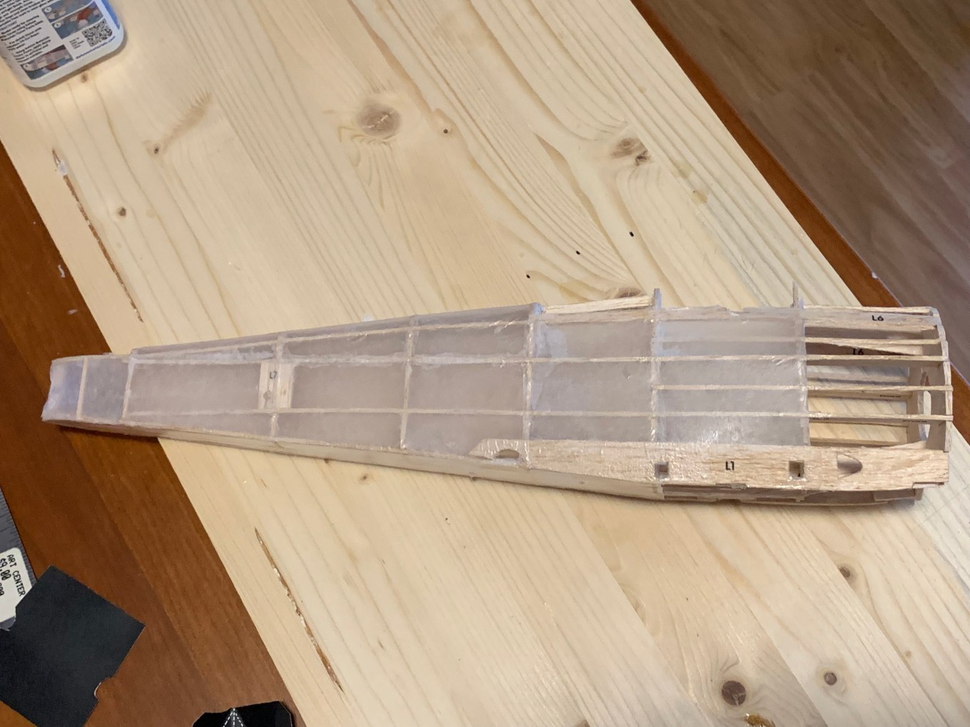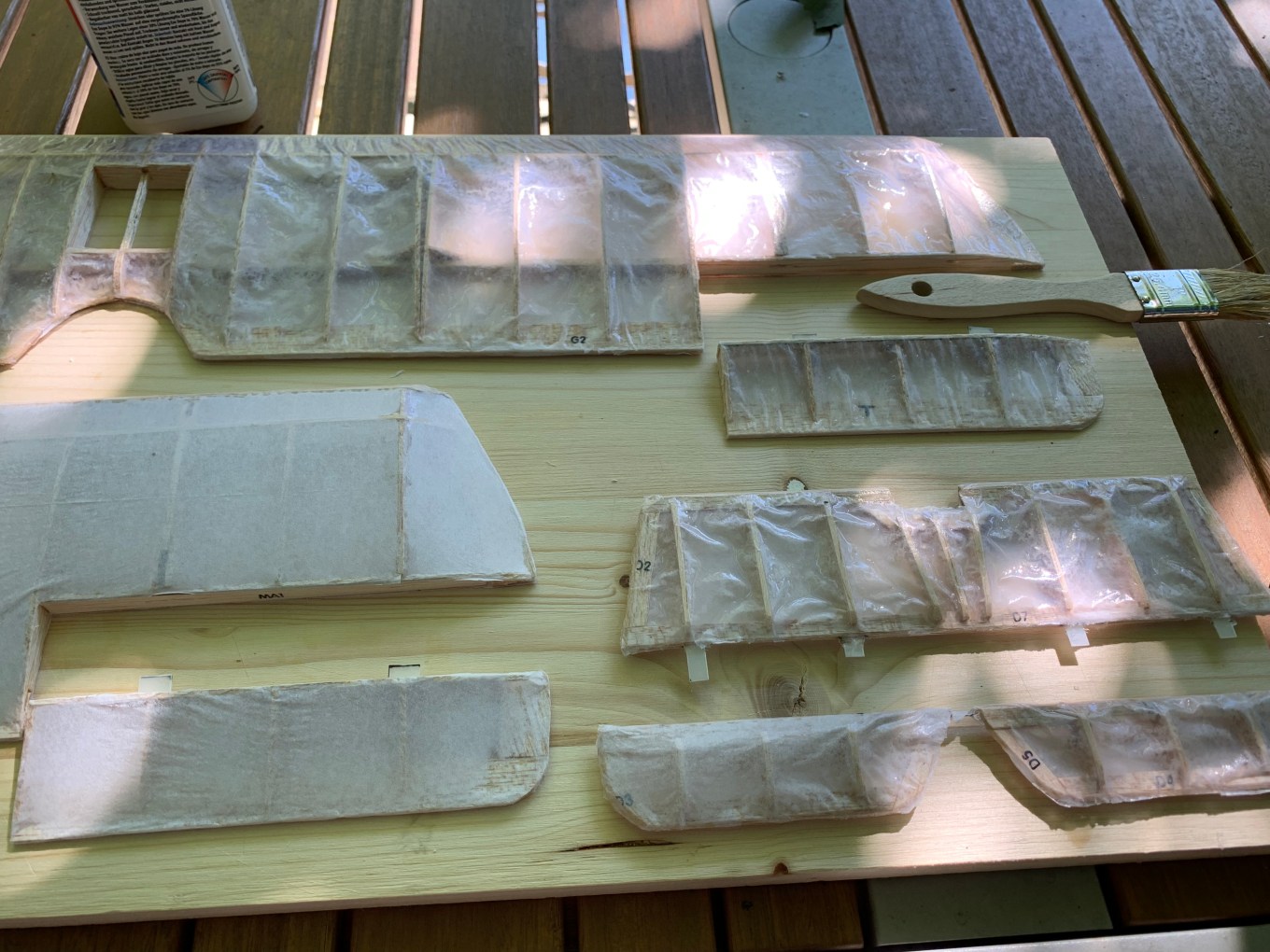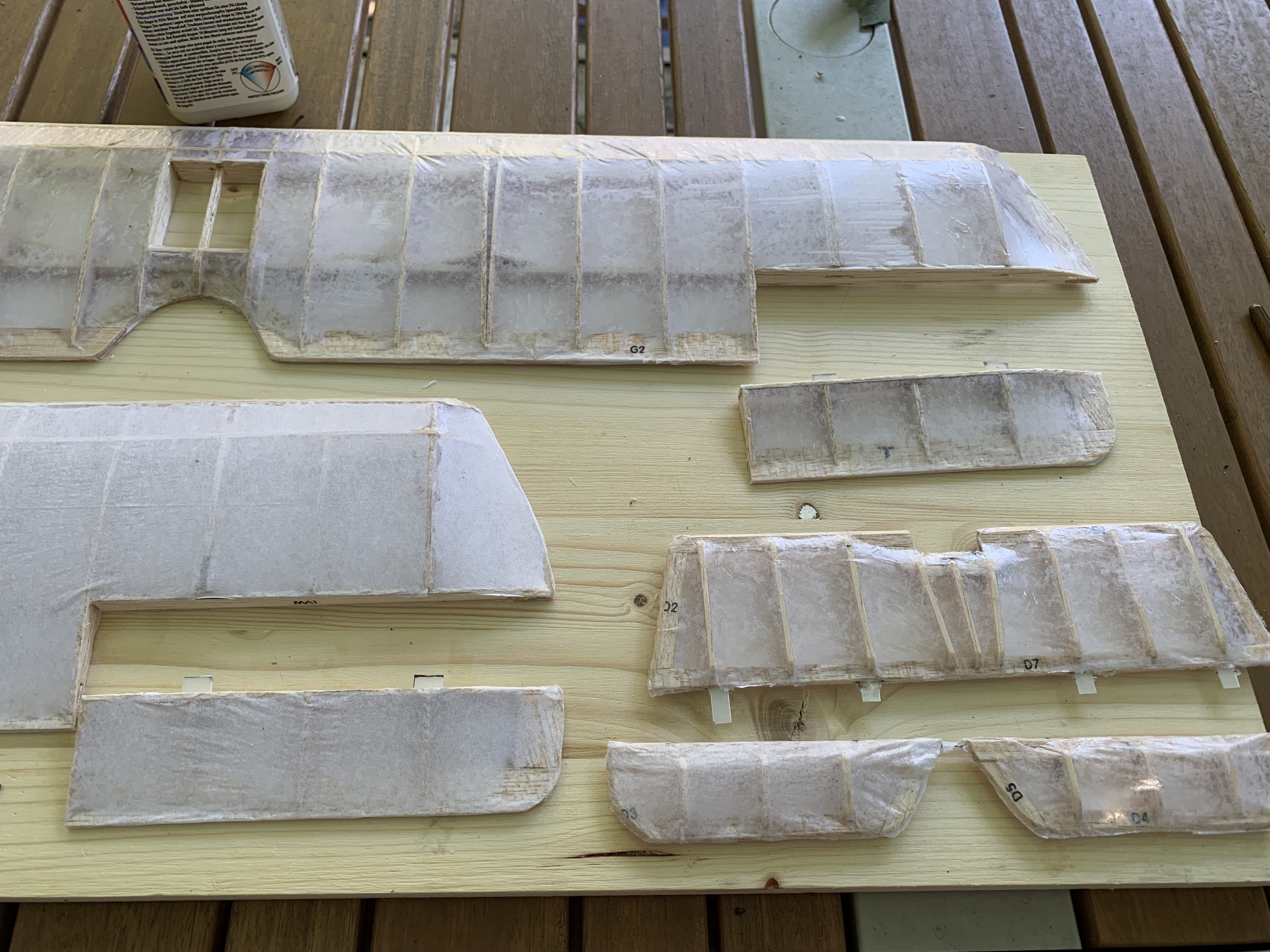 At this point, I was sort of committed to my path forward and so finished applying full strength dope to the rest of the frames. Once dry, I applied dope to the bottom side of all the wings and tail sections. These all demonstrated the same effect—wrinkling upon application but once dried, mostly, though not completely wrinkle-free.