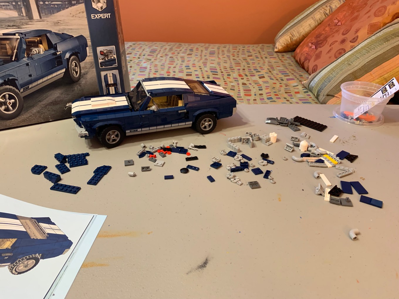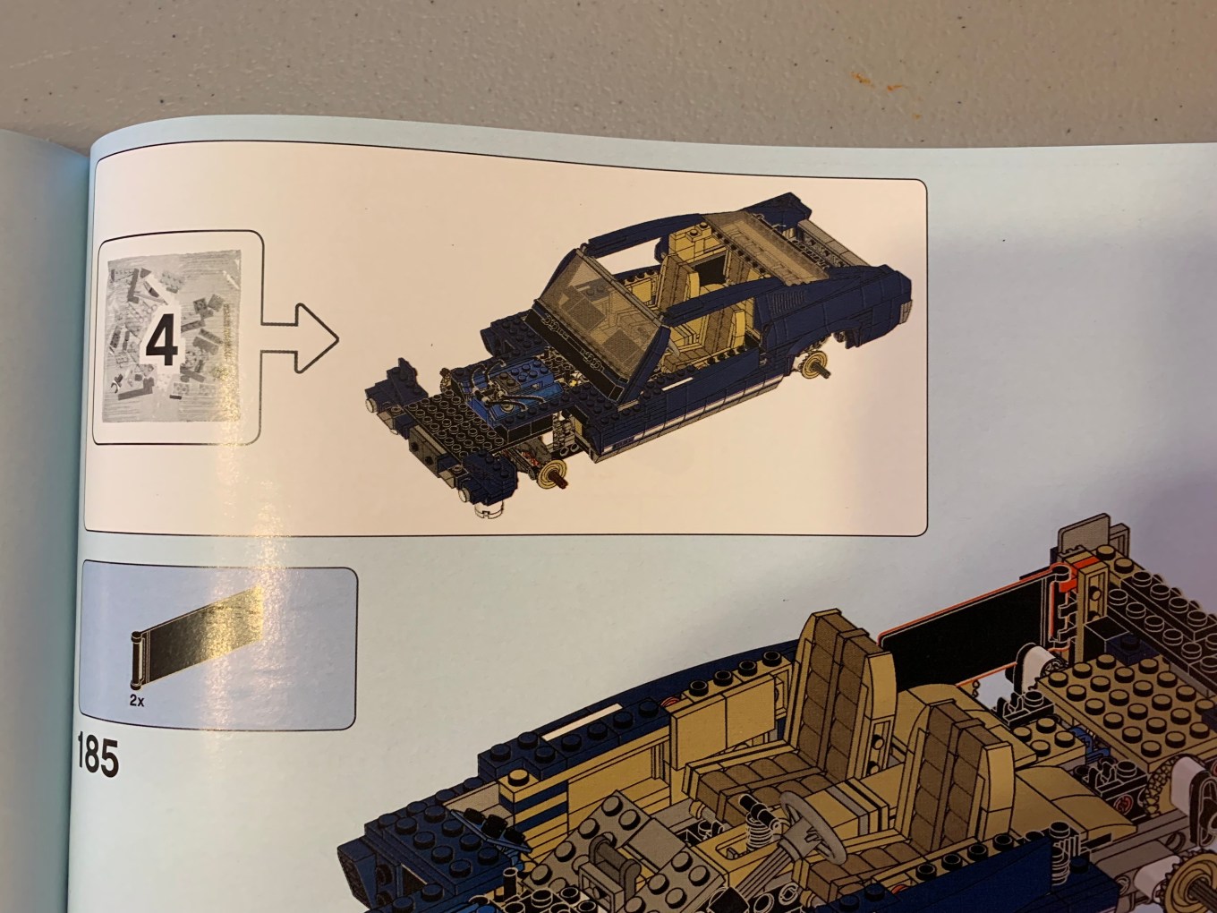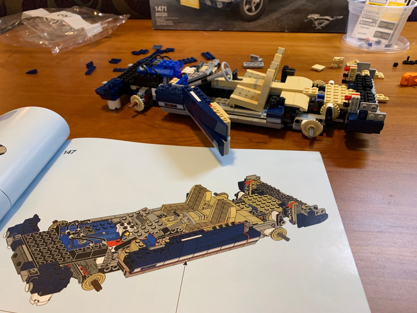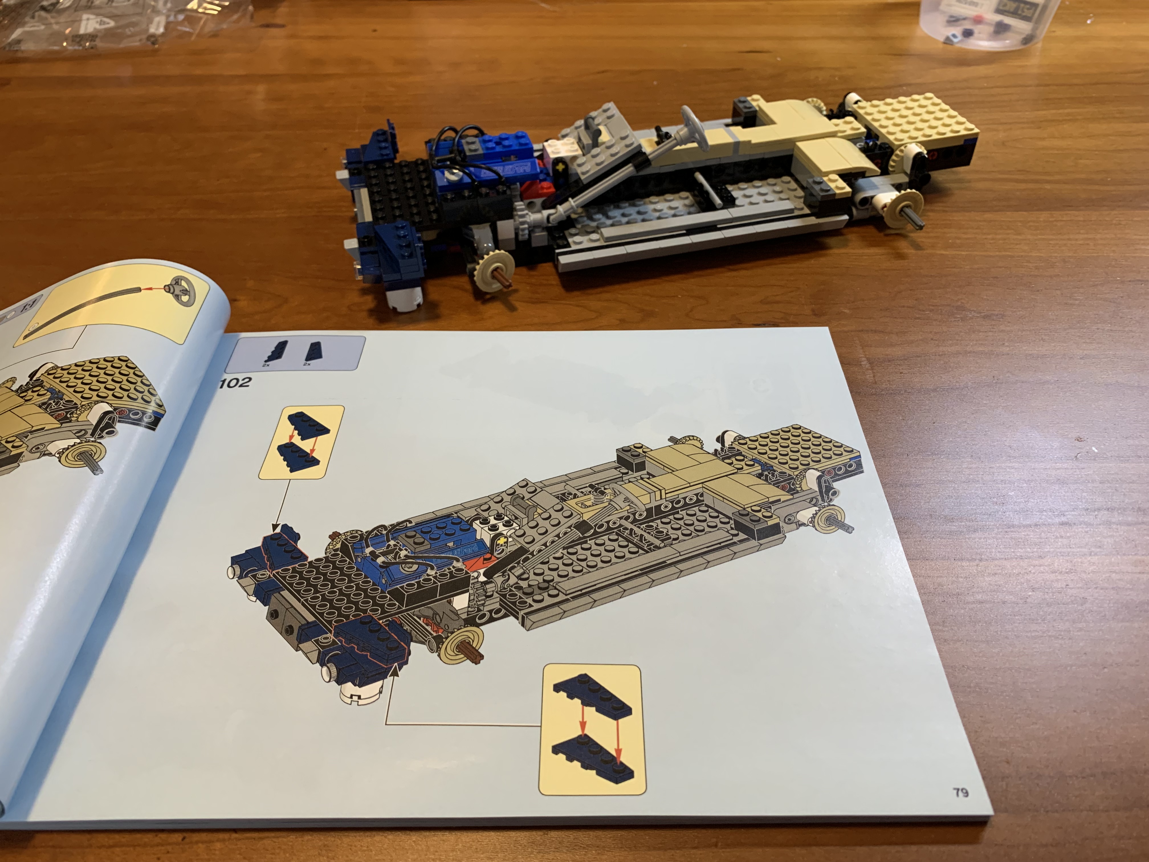 When I was almost at the end of this phase and down to just a few remaining pieces, I realized that I was missing two smooth rectangular body-colored pieces that would attach to the bottom of the A-pillars (the car body structures that support the windshield).  The last time this happened, I discovered that I had used the wrong-colored pieces in a previous step.  But this time, I did not have the right shapes remaining in a different color.  I searched the floor to make sure I had not dropped any pieces but found none.