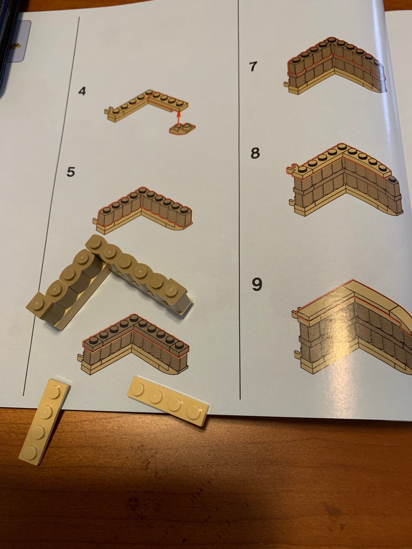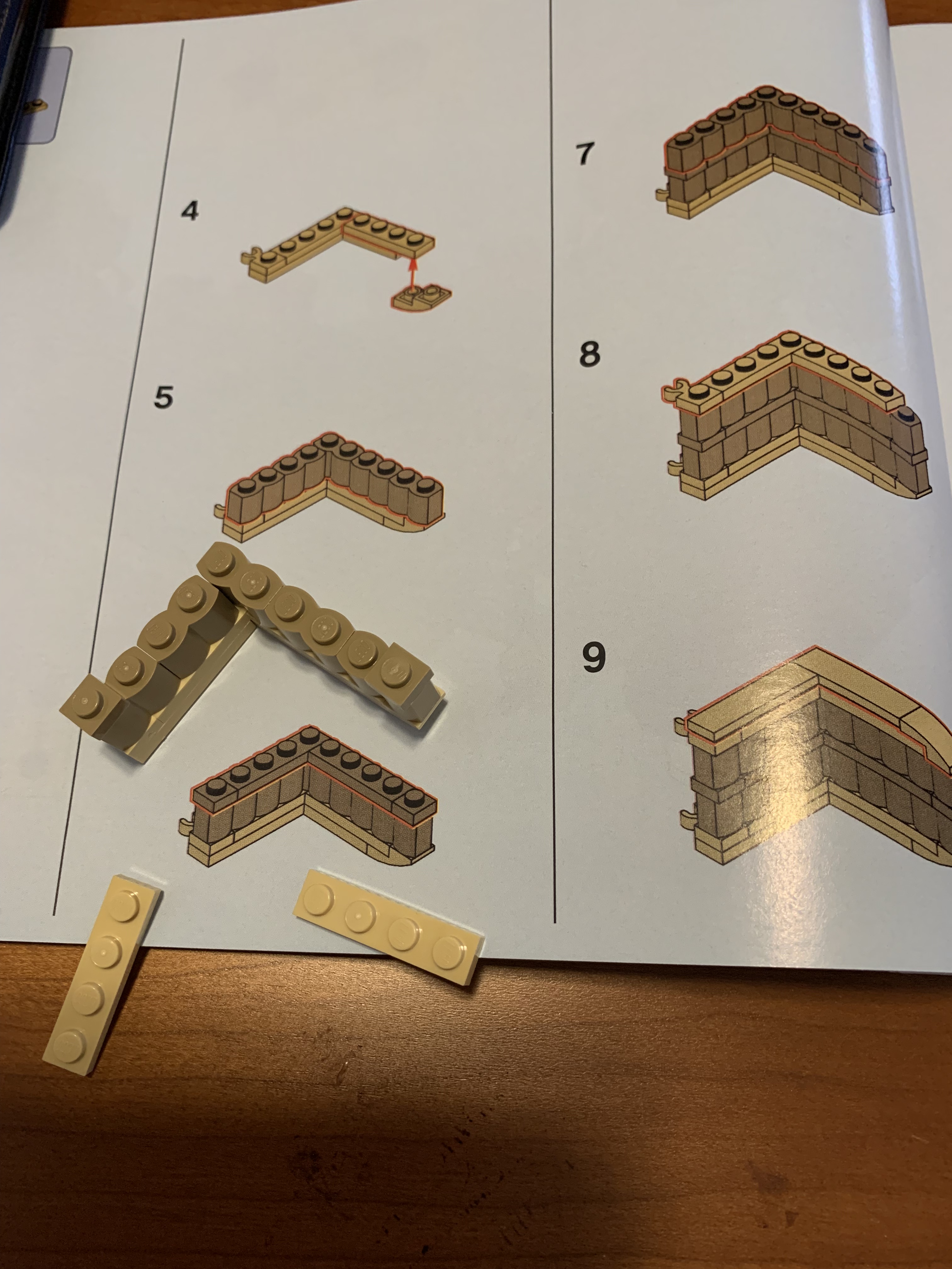 At first thinking I had some pieces missing, I decided to look back through the directions to see if I had made a mistake on a previous step.  Sure enough, I discovered I had used the wrong tan-colored pieces in an earlier step (there were two shades of tan pieces).  I then had to work backwards to remove the incorrect pieces and then rebuild through those steps.
