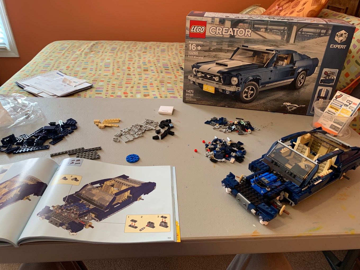 Looking into the unopened bags, I did not find the same two pieces that I could “borrow” from.  Instead, I had to improvise using square pieces of the right color hoping where these would be needed in a future step would not be critical.  Attaching the last few pieces, I was pleased with the way the car was looking (You will notice in the photo below that I had to relocate my miniature car factory as its previous real estate was supplanted by the beginning of our winter puzzling).
