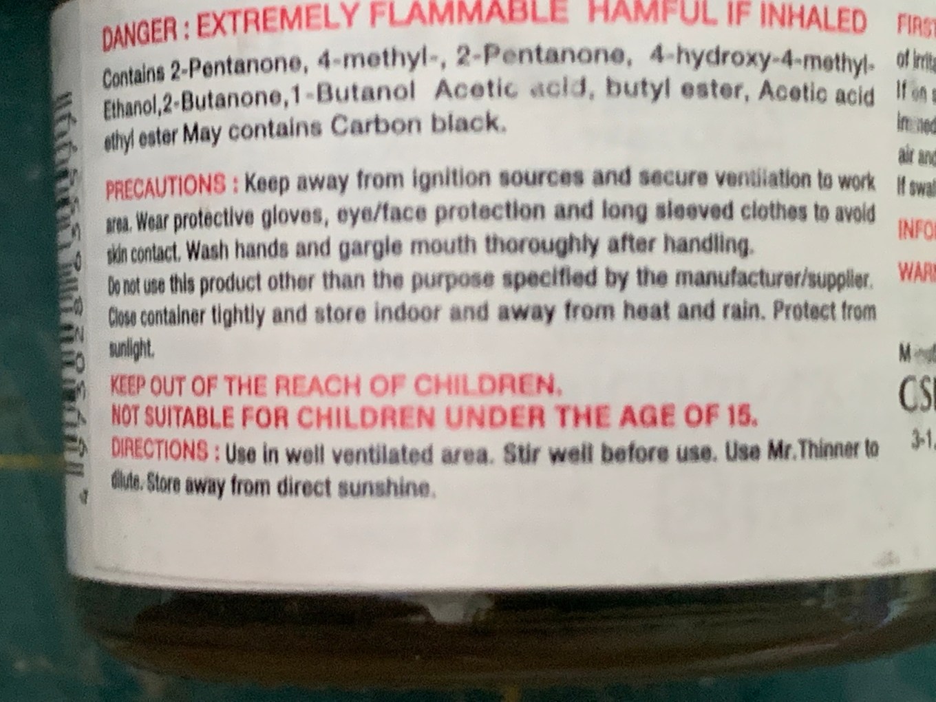 I then tried to read the label to see if it included brush cleaning instructions. If it looks blurry to you that’s how it looked to me too through these 60+ year-old eyes. In this photo, you can see how small the font is. Clearly this label was not designed for poor sighted senior citizens in mind. Straining, I could just read that the paint should be diluted with “Mr. Thinner” (blown up below with my phone camera so you can read).