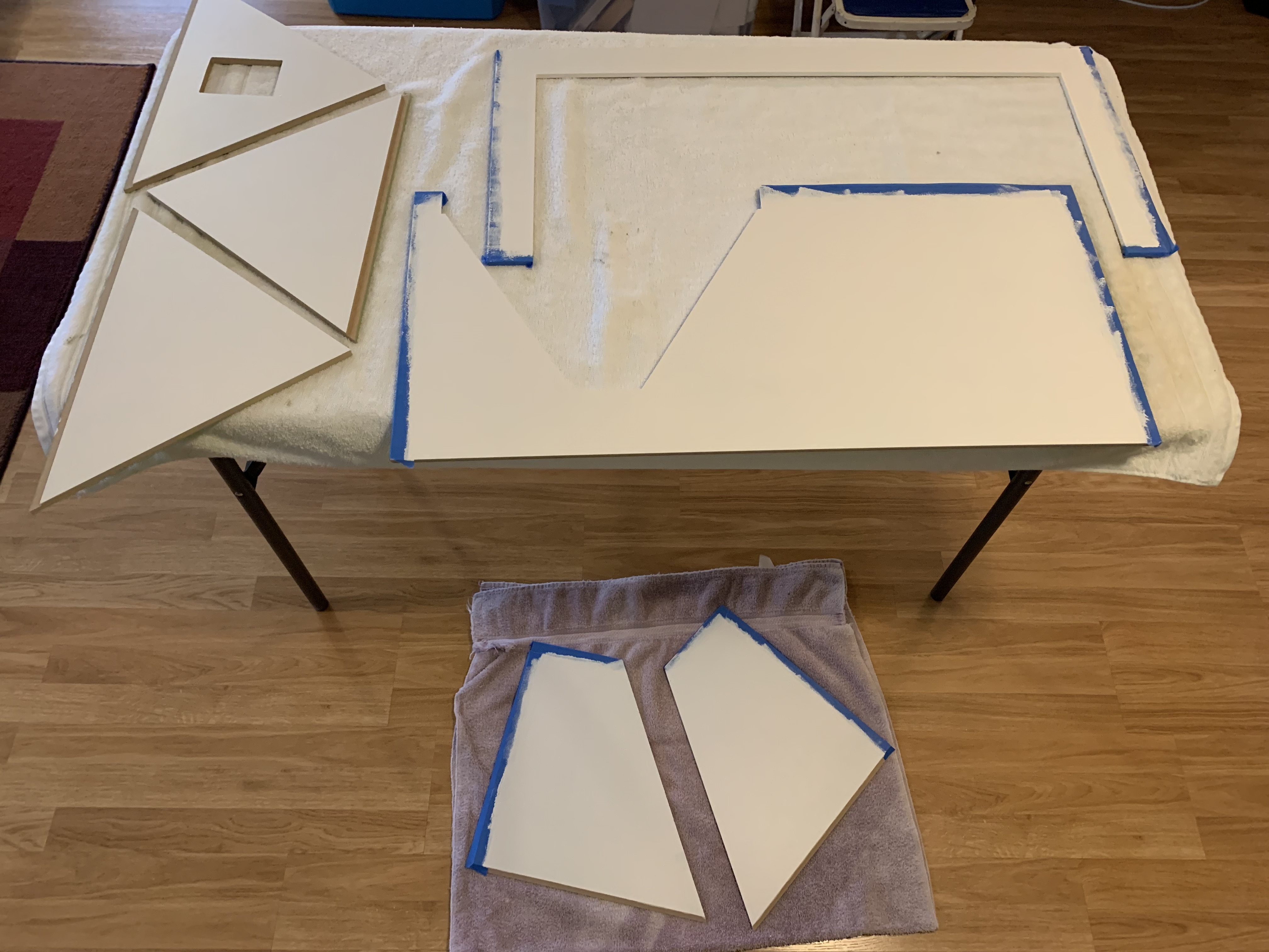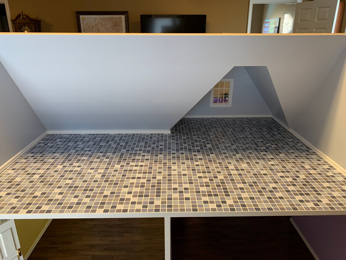 And to not detract from any future colorful creative projects that might take place in this miniature space, my sister chose to paint the walls a neutral white. This choice actually worked out well as the ceiling on the third floor, being the underside of the roof, reaches all the way to the floor. If she had chosen a non-white wall color, I would have had to figure out where to paint a “pseudo-wall” line to demarcate the transition from wall to ceiling.