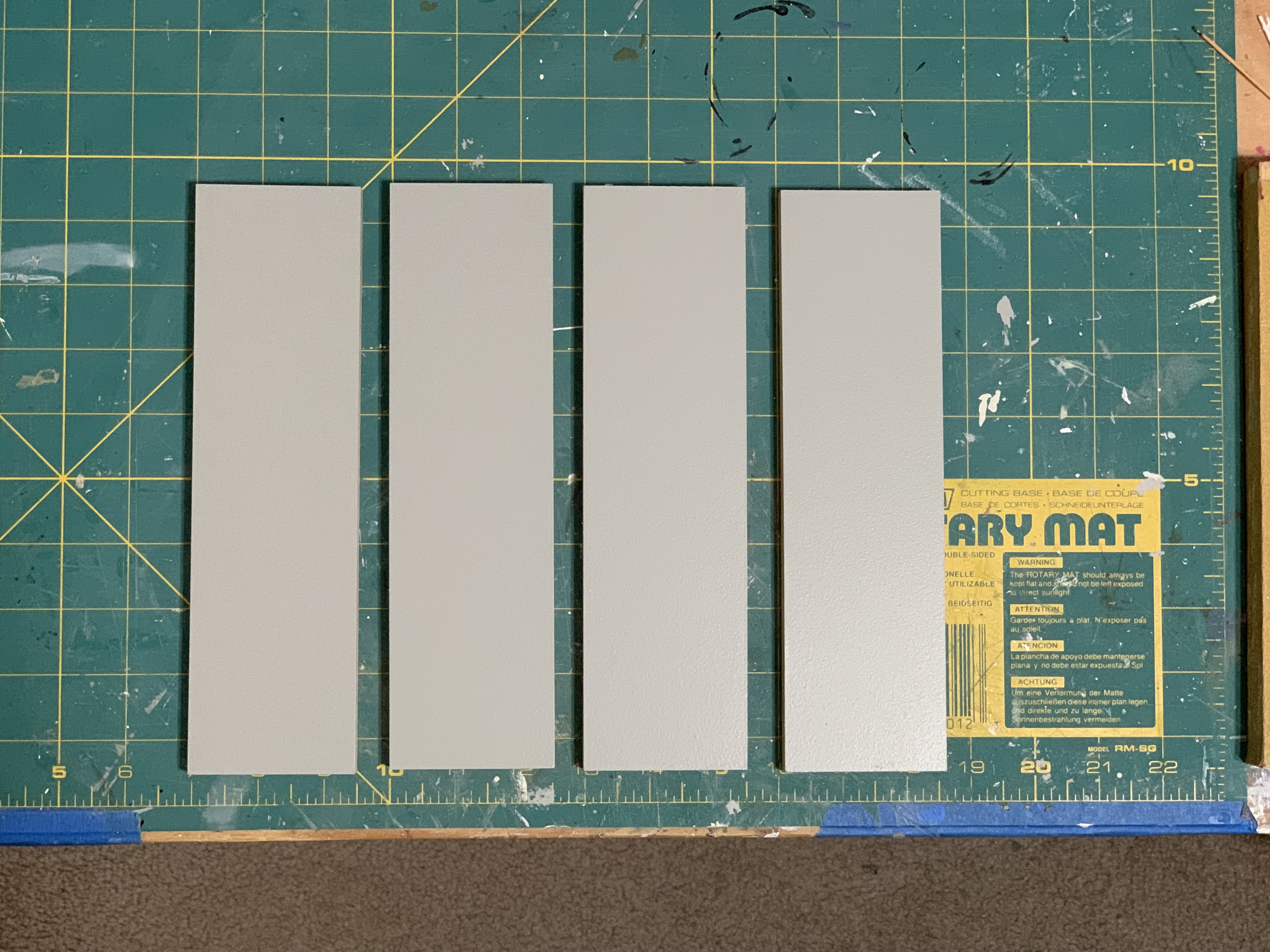 We then both had the same idea—why not mimic acid washed concrete for the third floor? This we could do ourselves with the possibility of only needing to purchase some paint or stain to achieve the effect. To give my sister several “test floors” to experiment with, I painted four pieces of MDF with the cement-colored paint I had used for the foundation.