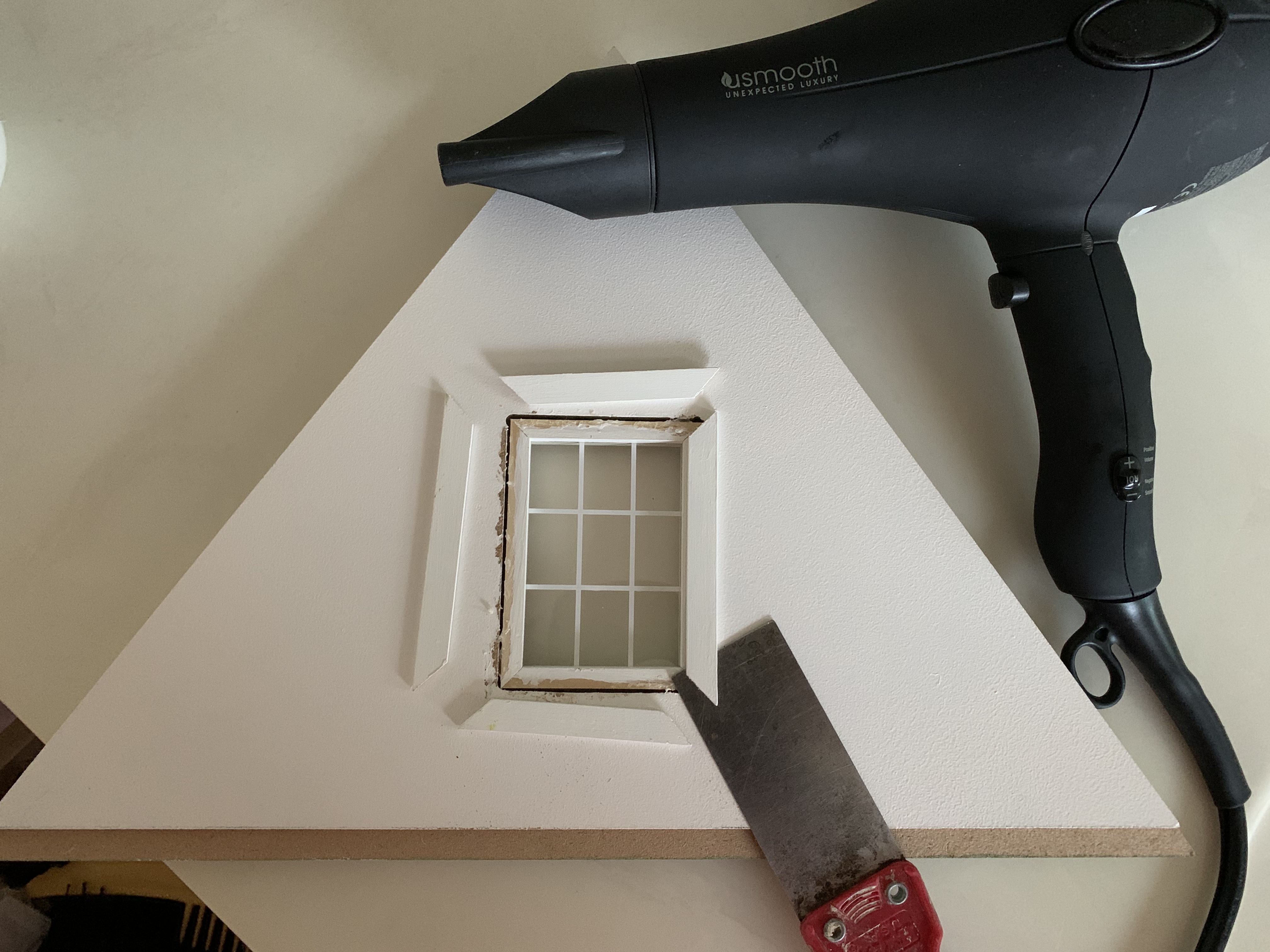 Thinking the walls were fully painted in their final color, I had already glued the interior window frame onto the gable wall. I figured I would have to mask off the window frame to prevent blue wall paint from getting on it. But then I remembered a video I had seen made by the kit manufacturer that showed how to separate previously glued pieces. With just a little heat from a hairdryer to soften the glue, I could then peel off the frame from the gable wall using a sharp putty knife without damaging or breaking them.