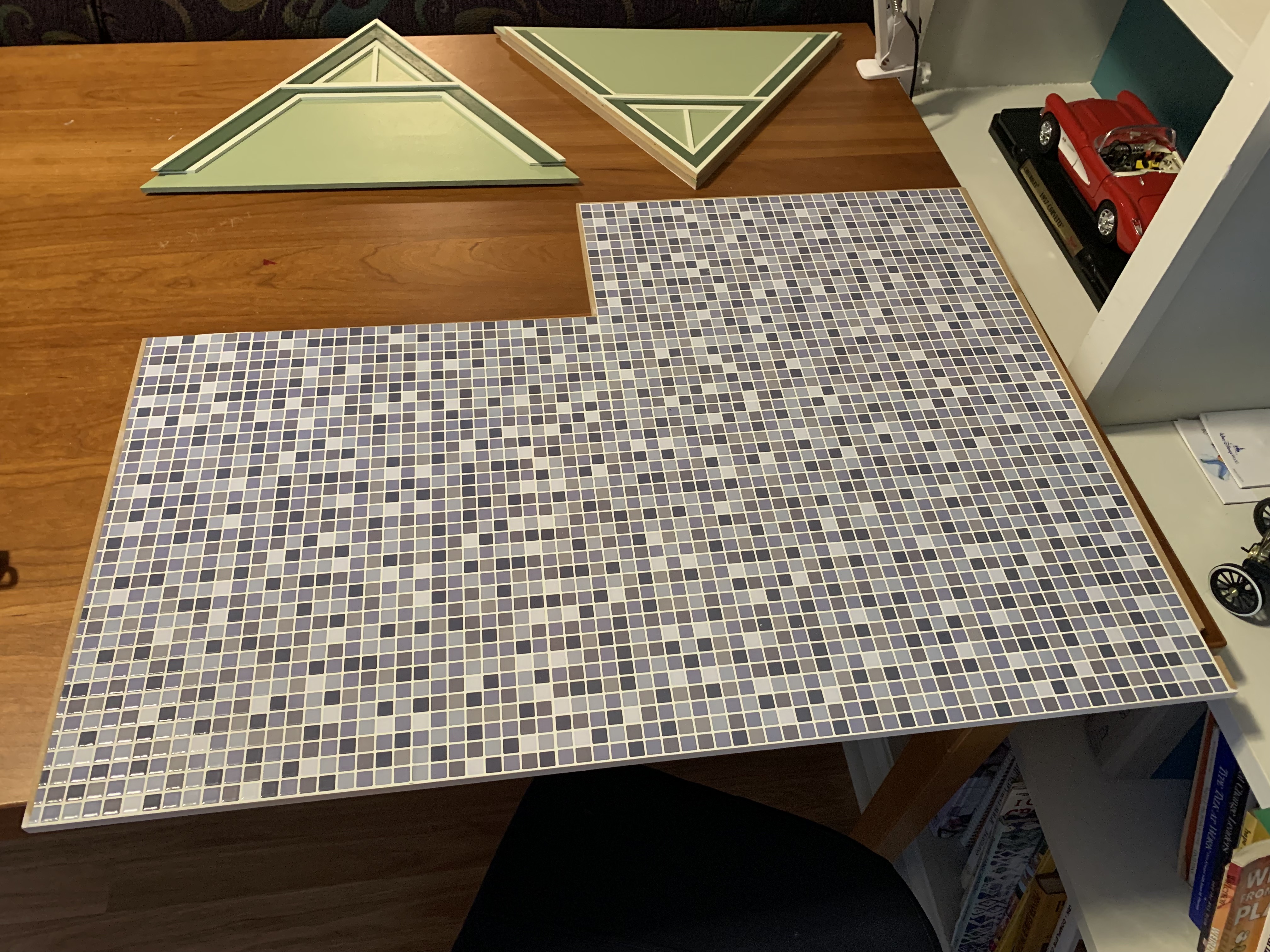 It just so happened that my sisters were driving back through town from North Carolina and stopped to spend the night with us. We decided to go look at our local hobby store where I have purchased most of the doll houses and doll house furniture. There my sister found a sheet of self-adhesive tile.