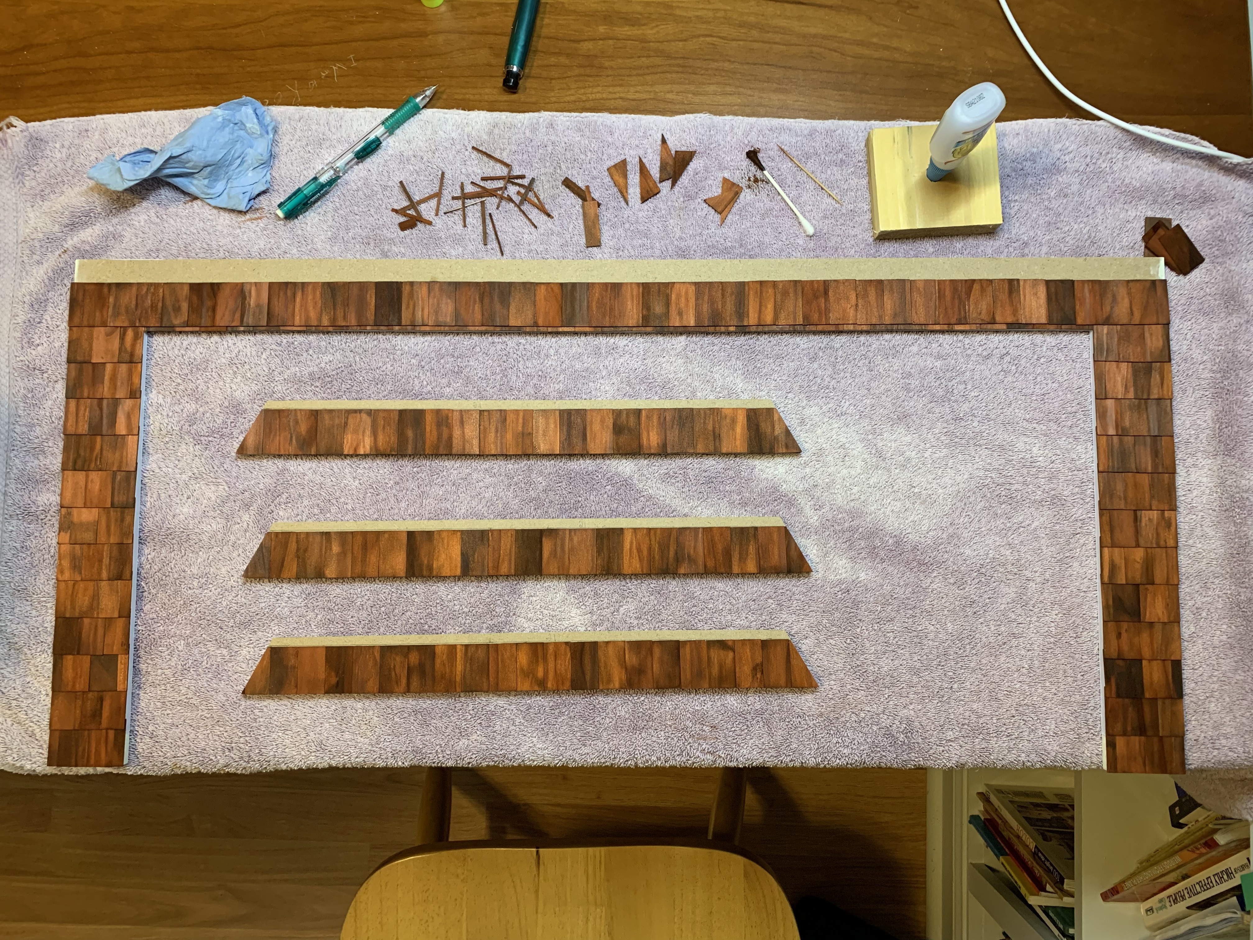 The last shingling step was to add a “Boston Lap” to the apex of the roof. The instructions indicated that a pair of shingles should be placed longitudinally on either side of the peak to form an inverted “V.” However, a whole shingle would not maintain the same 1 inch “reveal” of the other shingles…