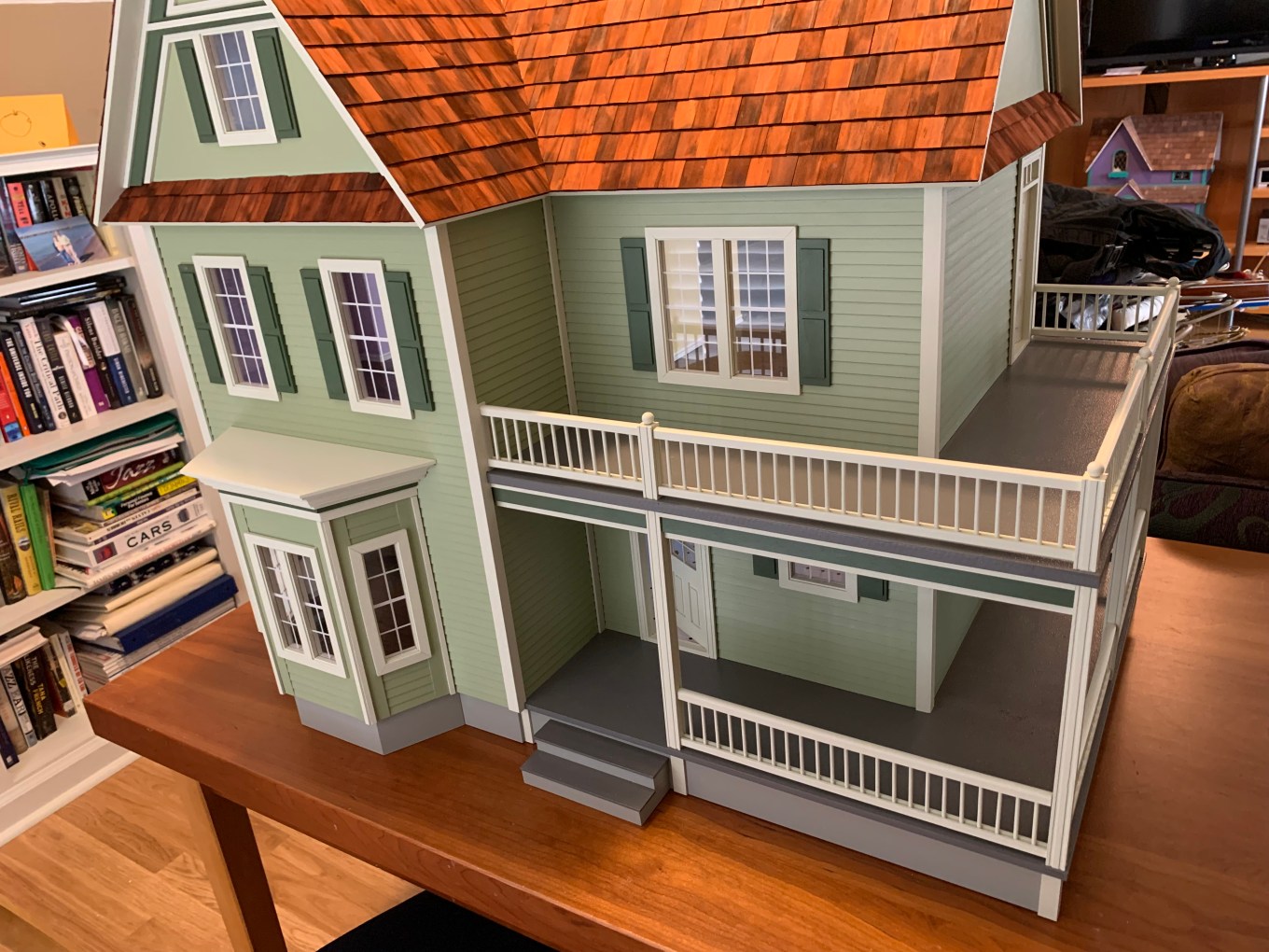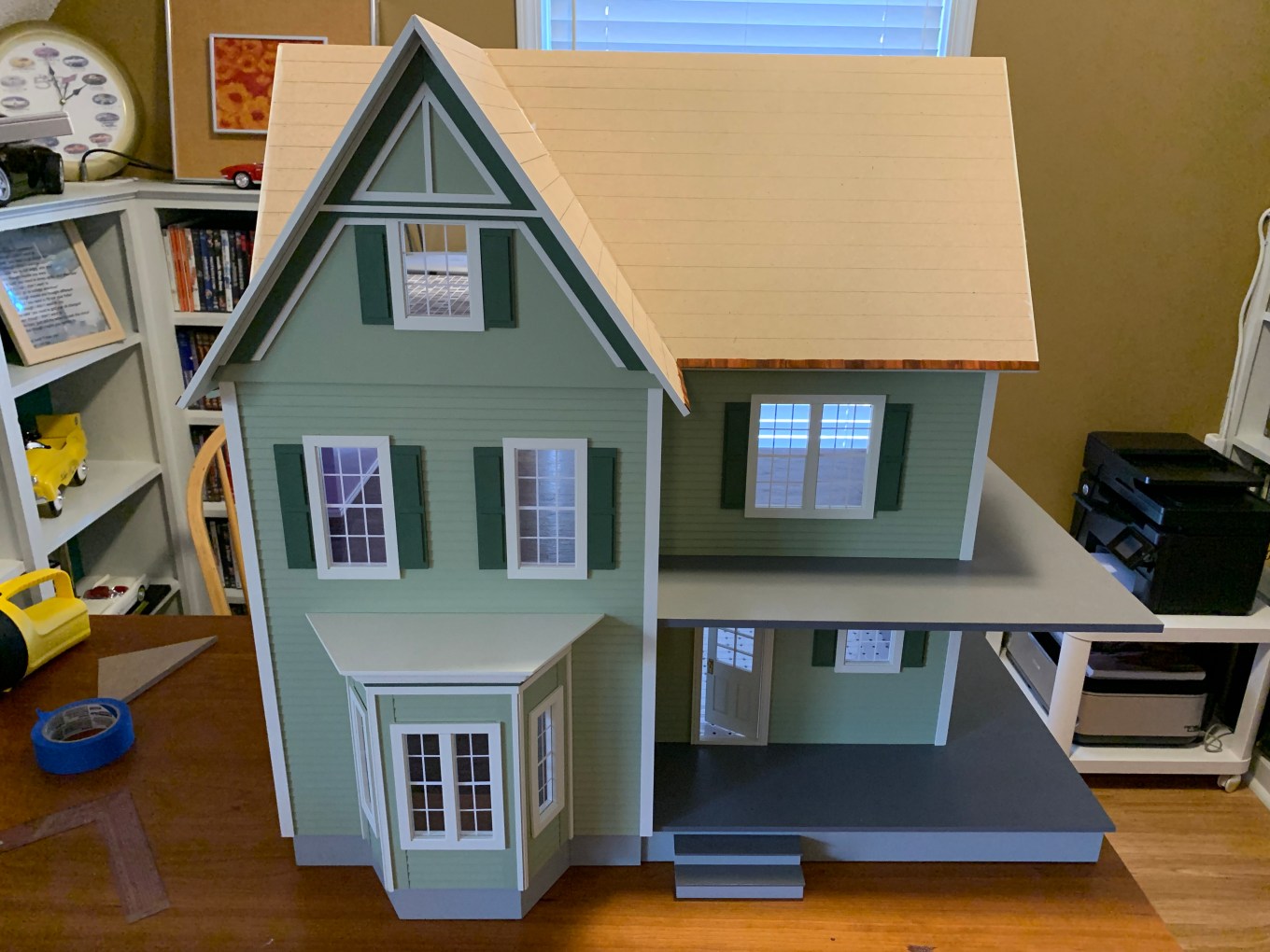 The last construction step was then to add the previously painted and assembled porch railings and then add the “3-layered” trim to the tops of the first-floor porch.