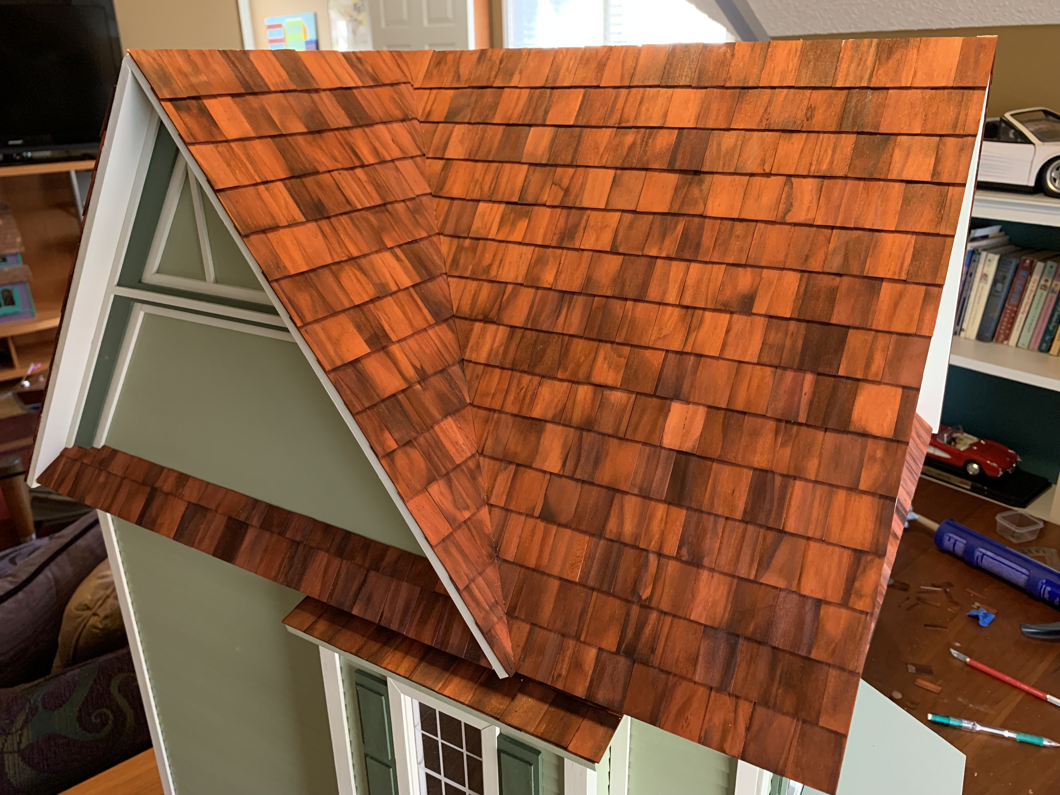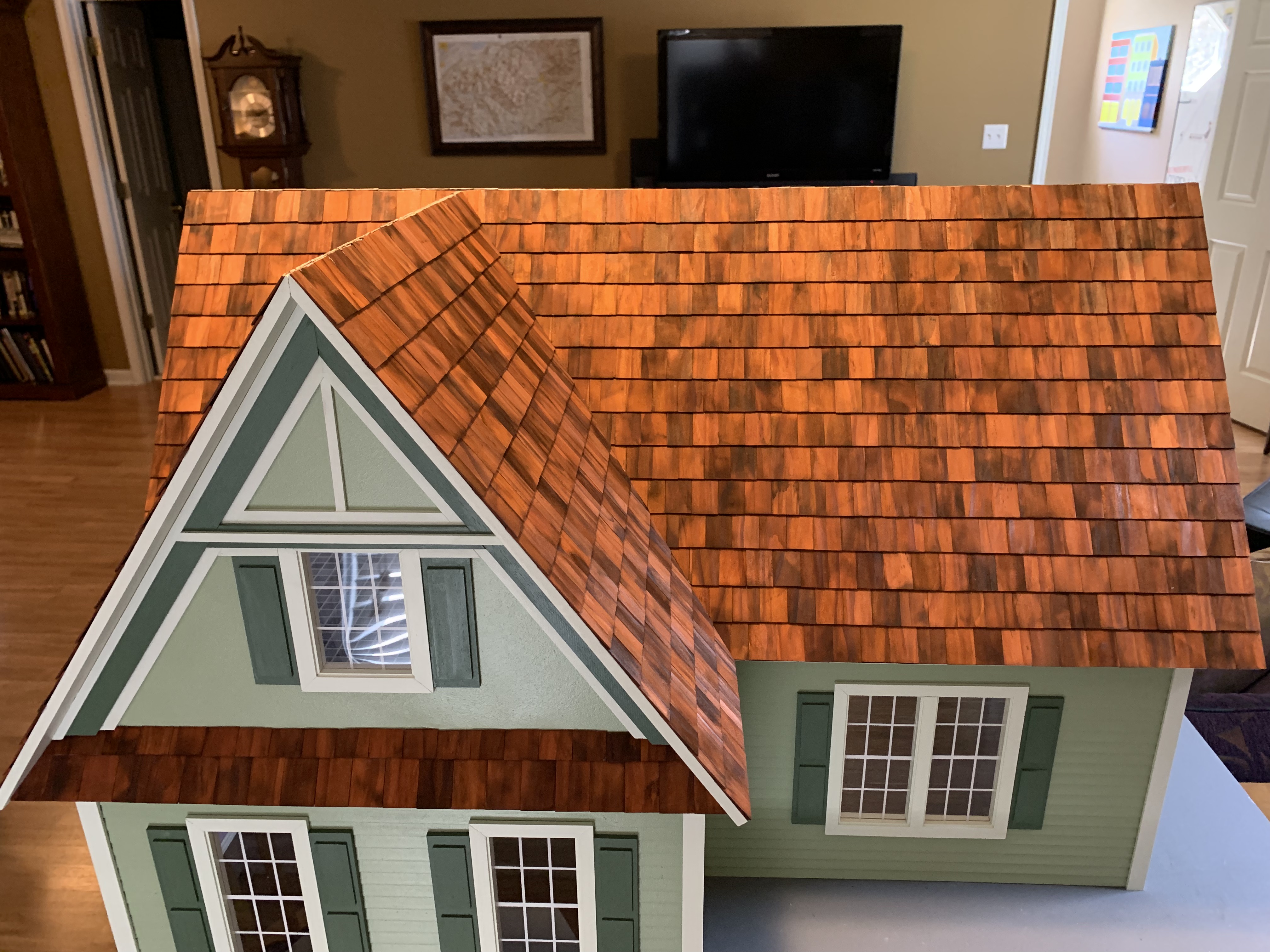 With the third floor interior complete, I began in earnest to shingle. One difference between this doll house and the ones I had previously built was that the gable front created a valley where the roof sections met. According to the instructions, here it was necessary to cut and glue triangular pairs of shingles, the left and rights side each with a different angle.