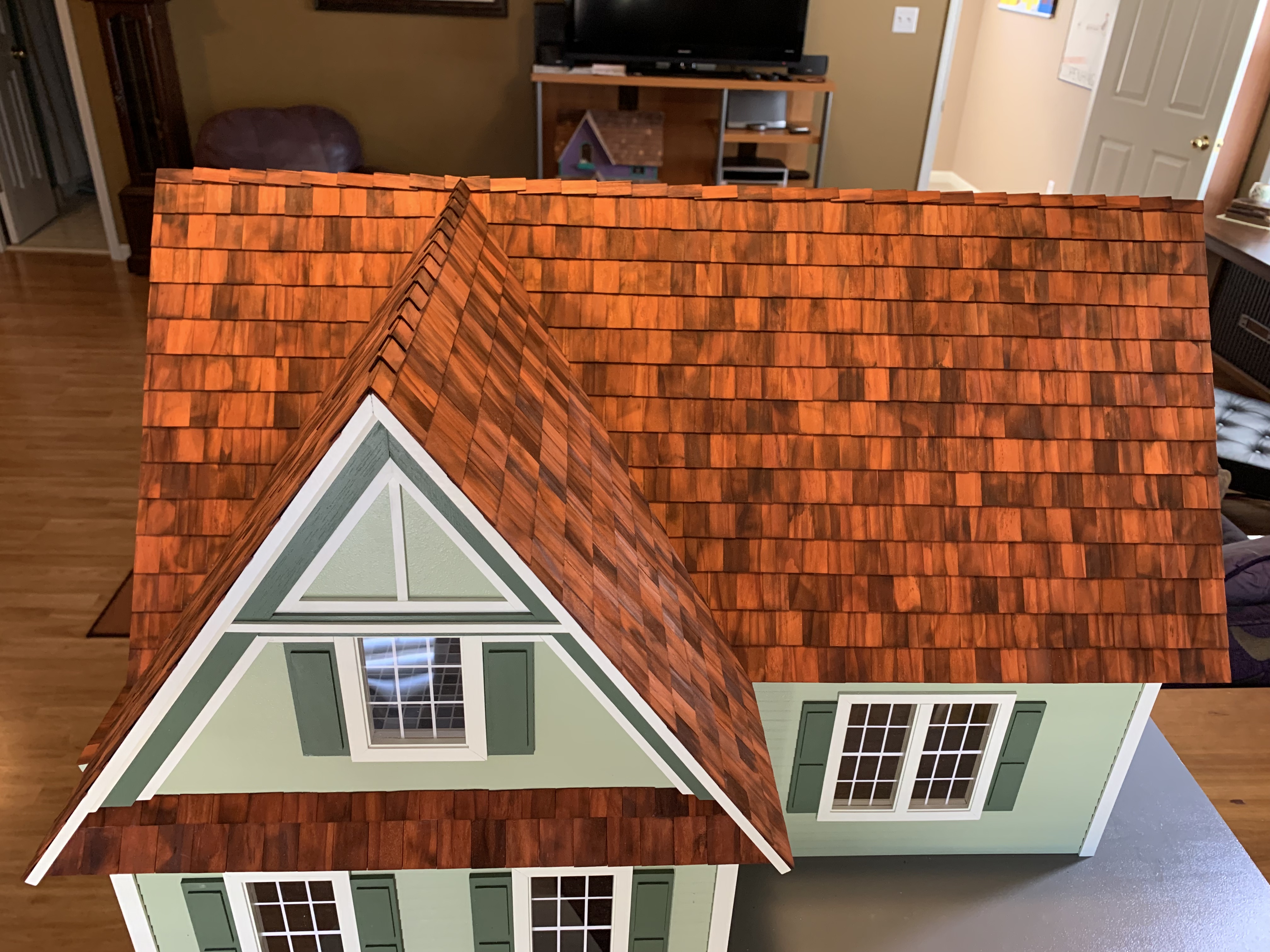 To get this doll house to the exact same level of partial completeness as we did for the one we built for my sister’s grandchildren (since they wanted to finish out the 3rd floor themselves), I next would have installed the railings, dyed the shingles, and started the shingling process. But those steps could actually wait as for this house, my sister wanted me to finish the third floor. This house, unlike the previous one, would be complete and “move-in-ready” prior to it making its trek across the state to my sister’s home in Northwest Arkansas.