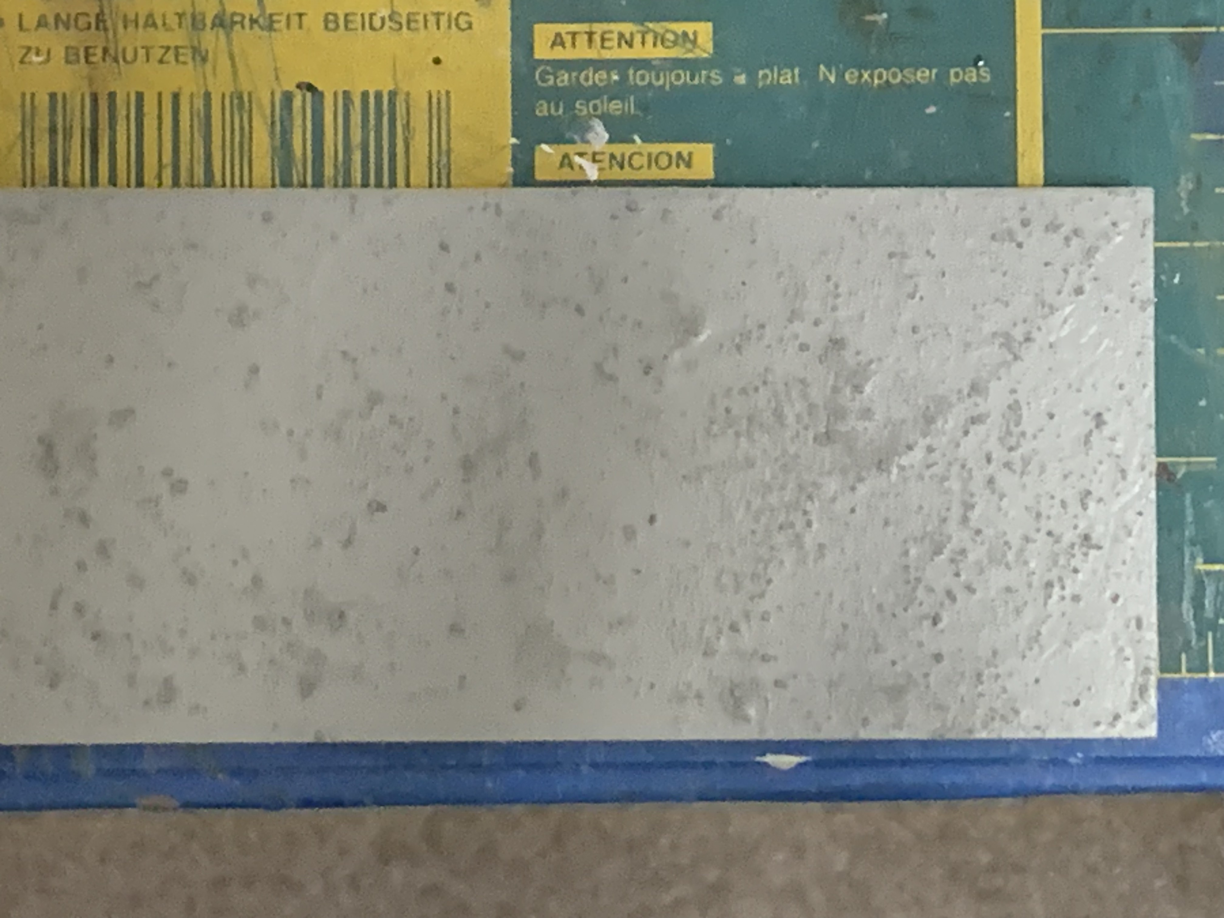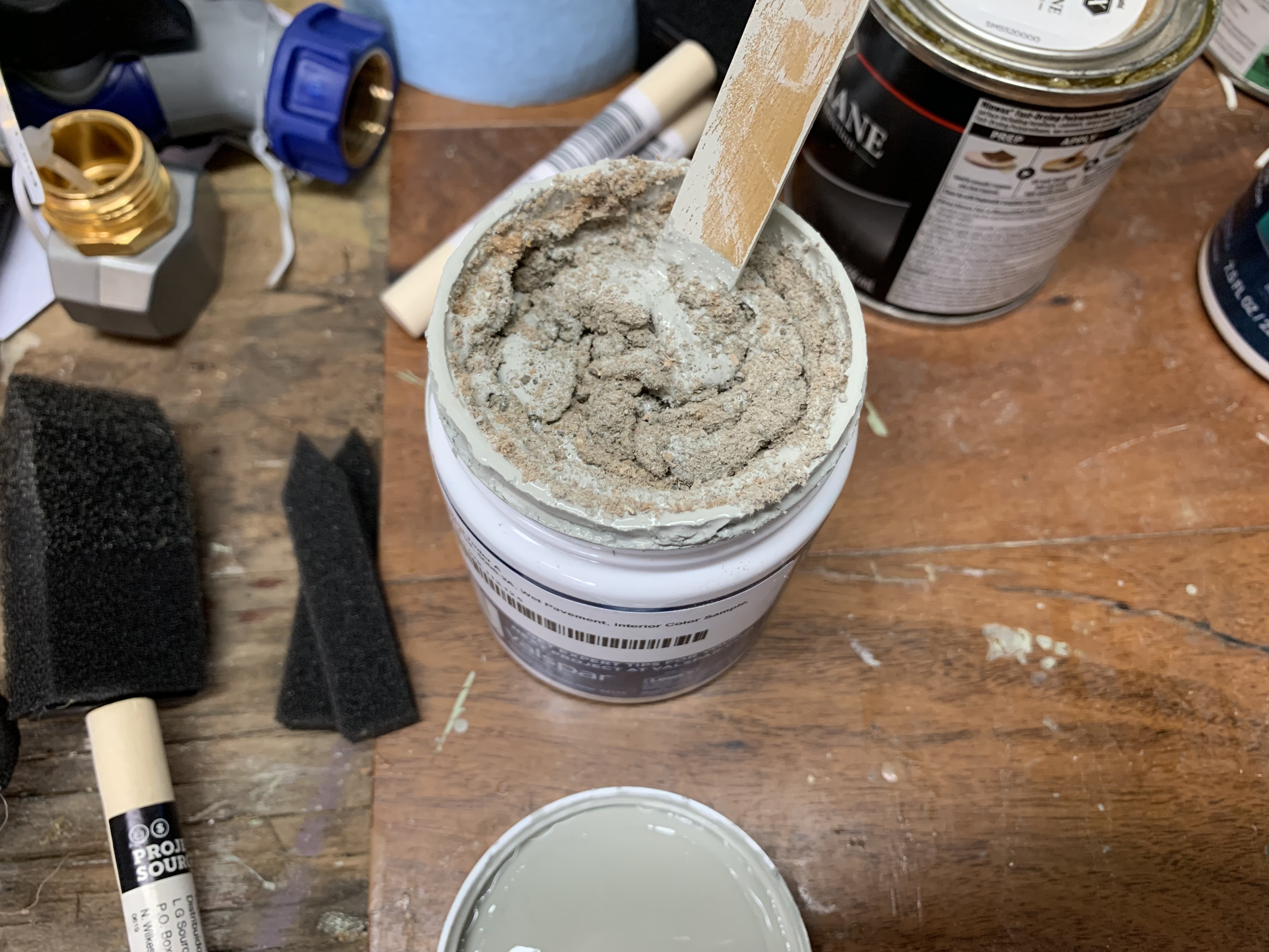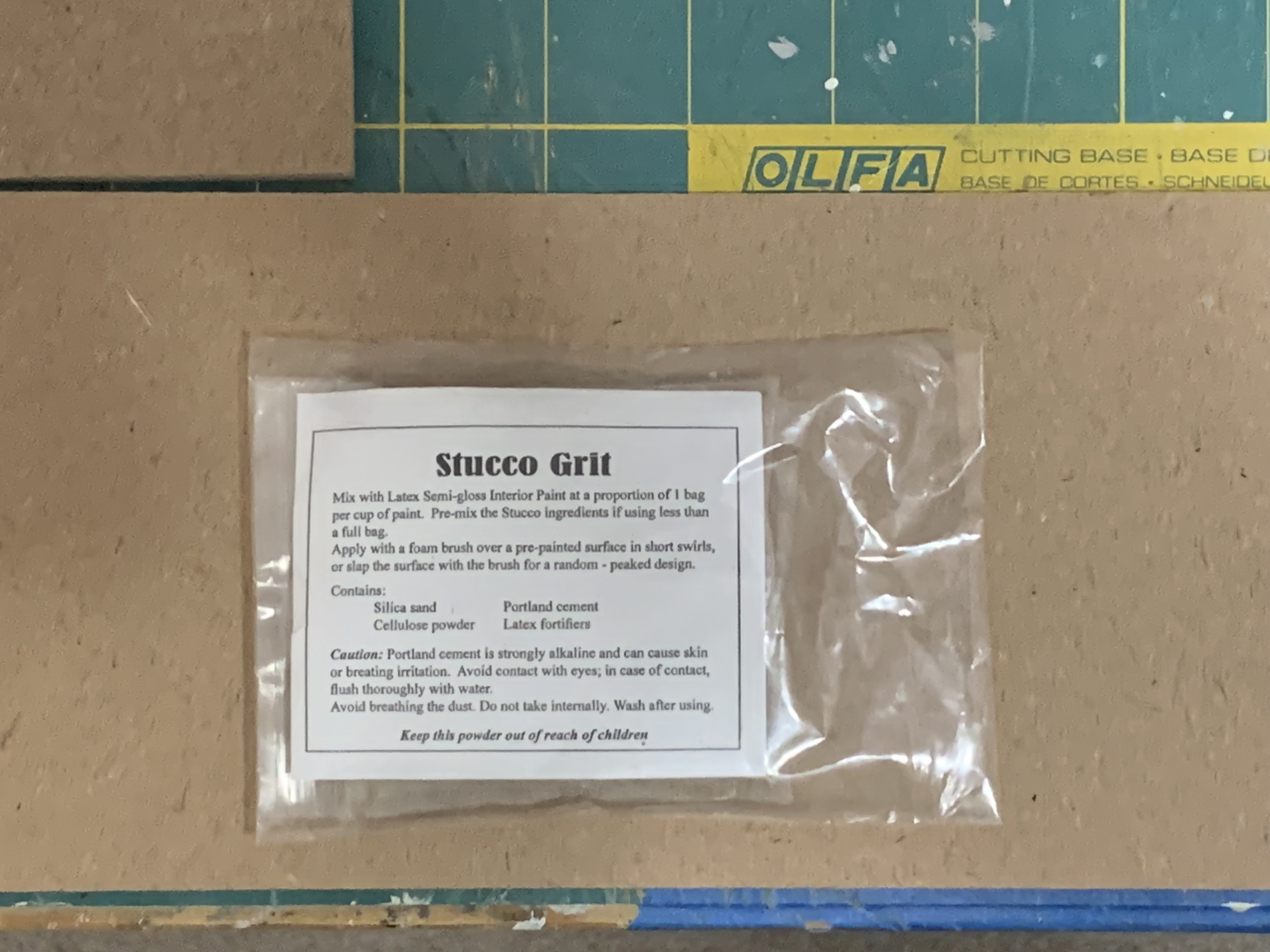 I knew I didn’t need that much—it was probably at least four times as much as I needed—so I spent a few days trying to figure out to accurately measure 2 fl. Oz. of thick house paint and then subdivide the bag of grit into fourths.  I had the means to measure that amount of paint but no good way to quantitatively transfer it (an analytical chemist term) to a mixing vessel.  In the end, I decided the paint wasn’t that expensive and so just bought a new paint sample (which prior to tinting is 7.5 fl. Oz.).